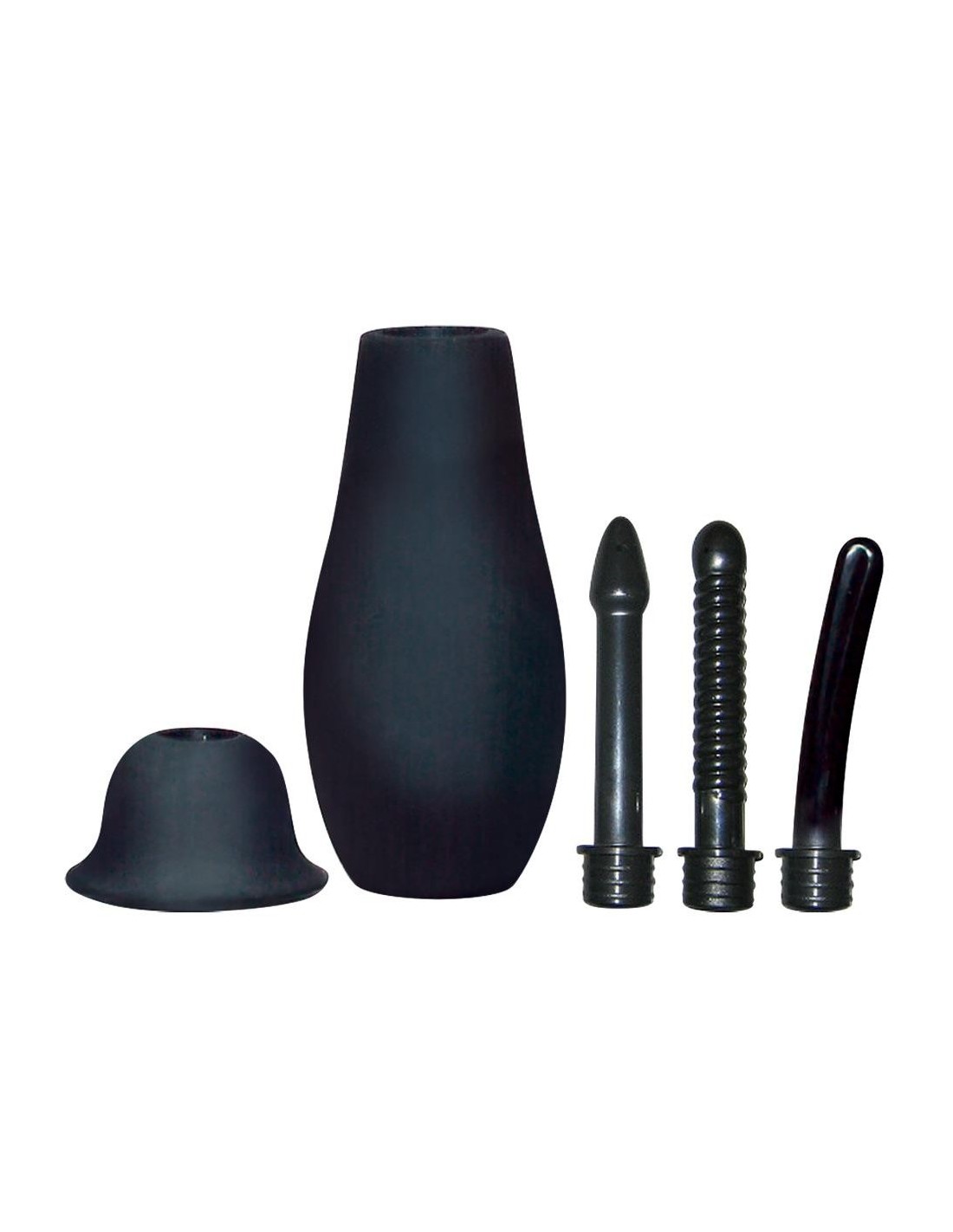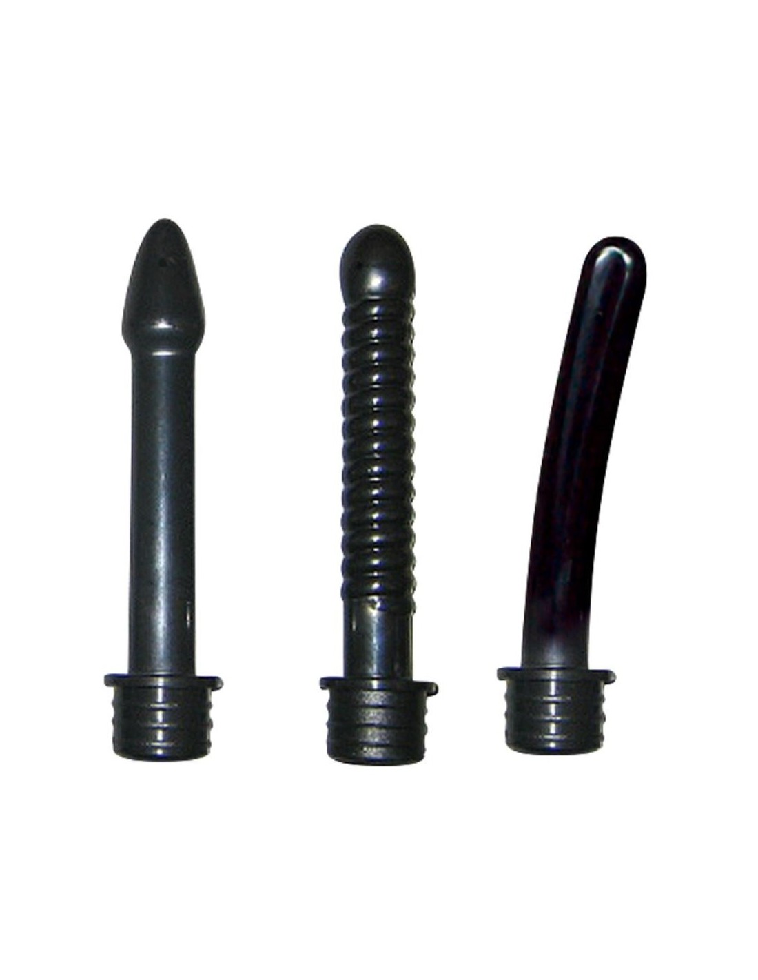 Doccia intima nera con tre inserti diversi. Un inserto leggermente piegato, un altro a forma di freccia e il terzo si avvita in profondità nell‘ottica a spirale... Per una sensazione bella e pulita durante il sesso! Ciascuno degli inserti dispone di due aperture ed è lungo ca. 12 cm. La capienza della doccia è di 100 ml. Materiale: ABS, PVC.