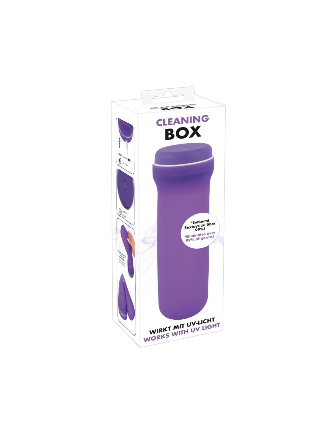 Sterilizzatore pratico e igienico che uccide fino al 99,9% dei batteri e dei germi con radiazioni UV. Il Cleaning Box funziona in modo affidabile contro una vasta gamma di batteri e funghi come Staphylococcus aureus, Escherichia coli, Candida albicans. La manipolazione è particolarmente intuitiva: basta inserire il giocattolo nel tubo e chiudere il tappo. Dopo 5 minuti il giocattolo è sterilizzato e pronto per l'uso. Uno strumento indispensabile per ogni amante dei giocattoli. Ricaricabile con il cavo di ricarica USB incluso.