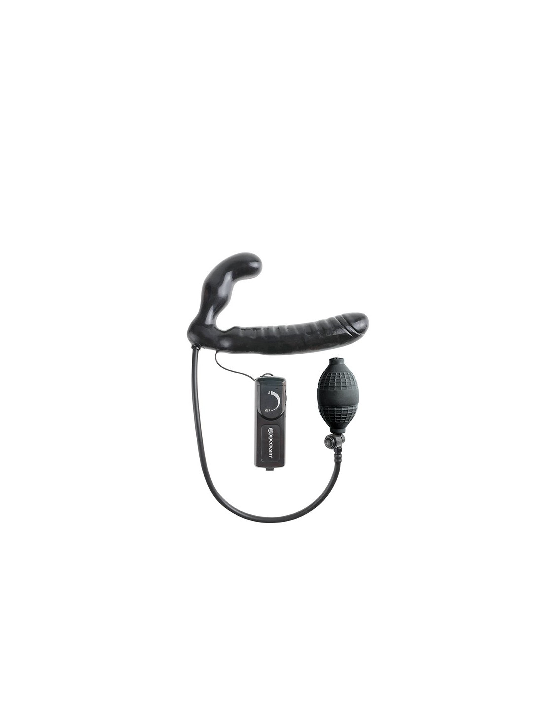 Get hands-free stimulation and hot face-to-face sex with the Inflatable Vibrating Strapless Strap-On! Cleverly curved at just the right angle, this strapless double dildo stays inside the wearer with each passionate thrust. The internal plug inflates using the medical-style ball pump, filling the wearer with thick stimulation and keeping the strap-on in place even when the action heats up. A powerful multi-speed bullet sends incredible vibrations through the entire shaft\u2014choose a speed that\u2019s right for you and let the silent vibrations whisk your lover away!