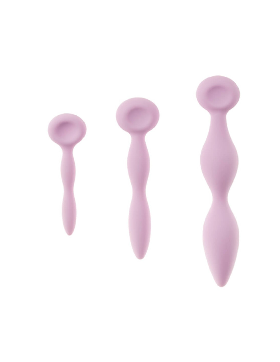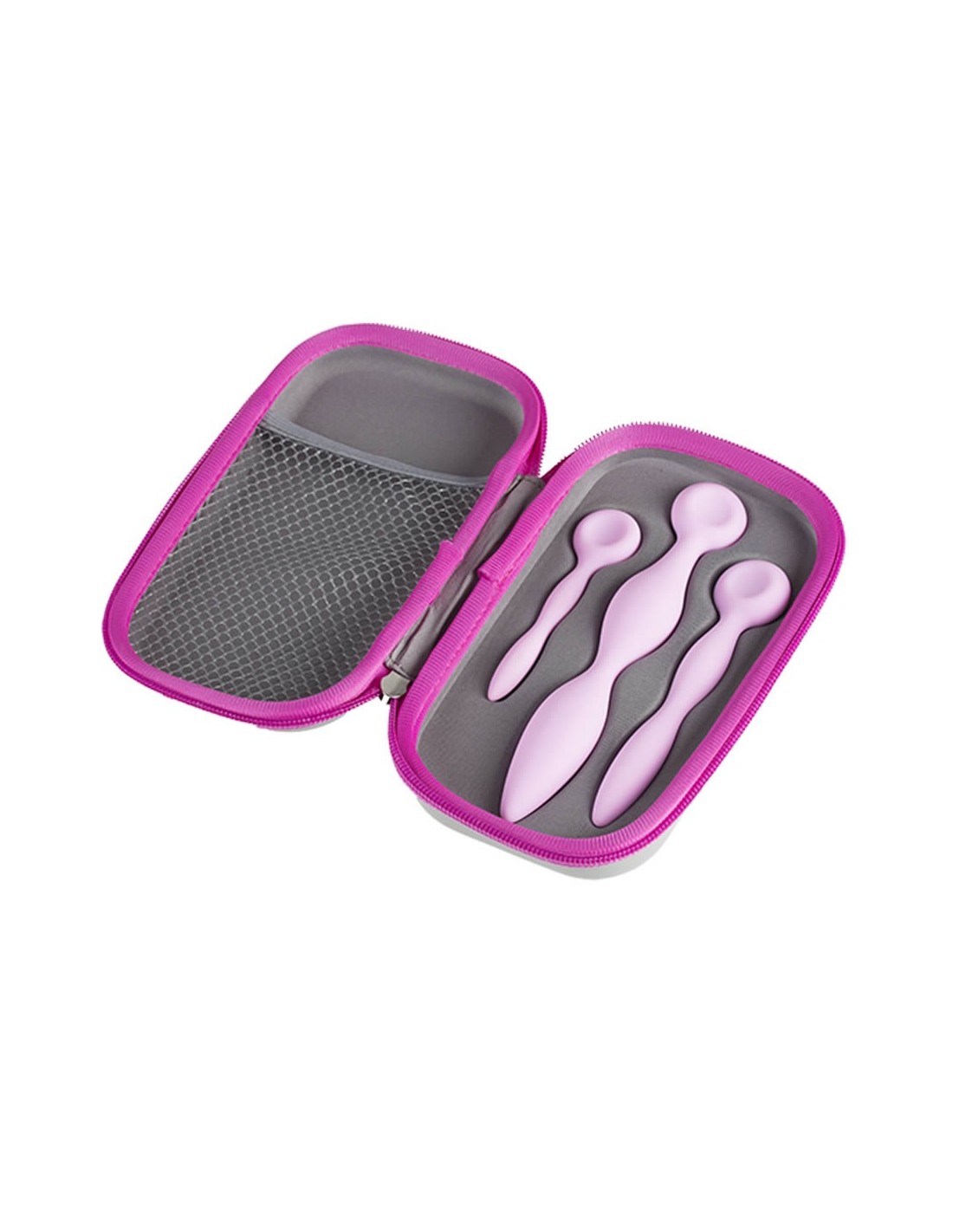 - Un sistema di riabilitazione che offre 3 strumenti ergonomici intravaginali di diverse misure e diametri per esercitare e dilatare progressivamente il canale vaginale.