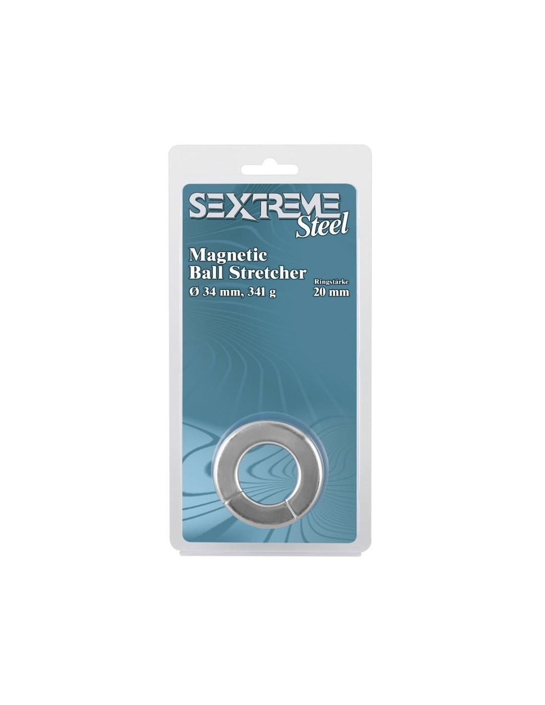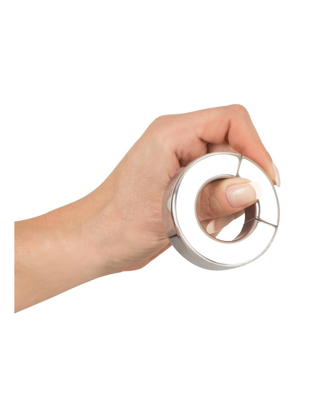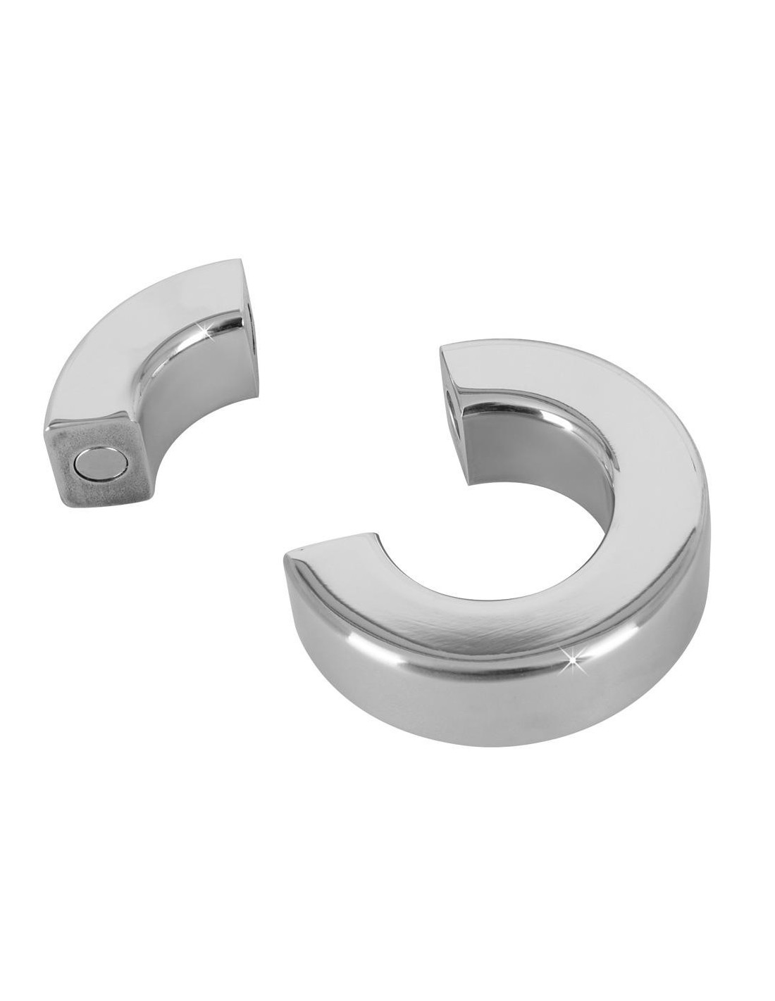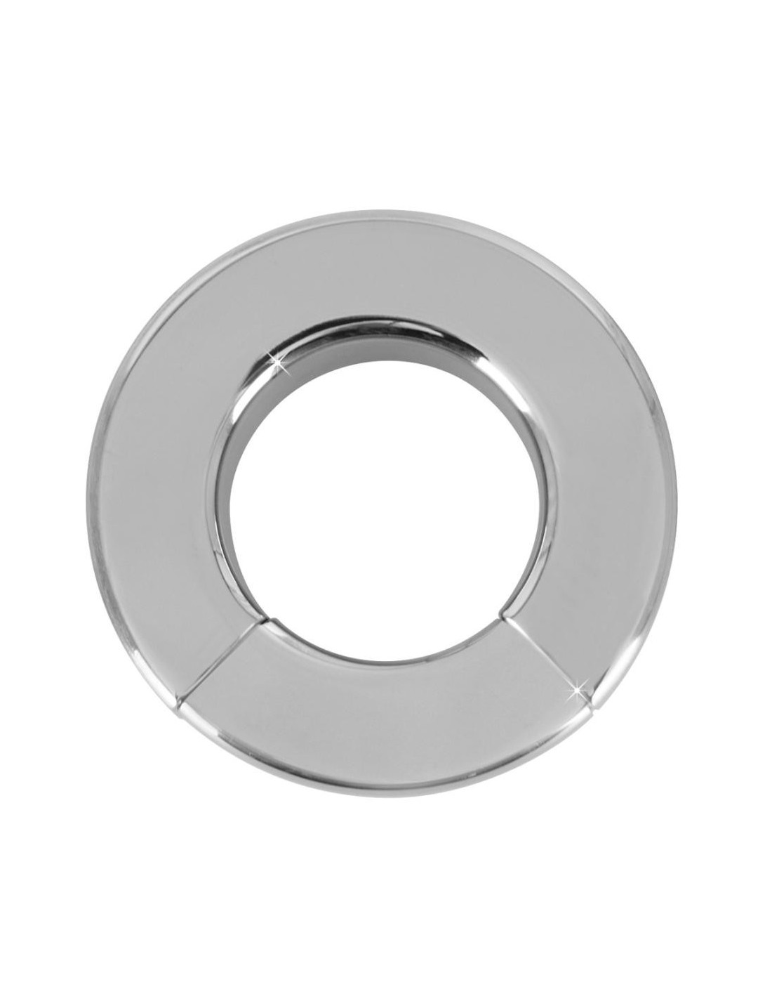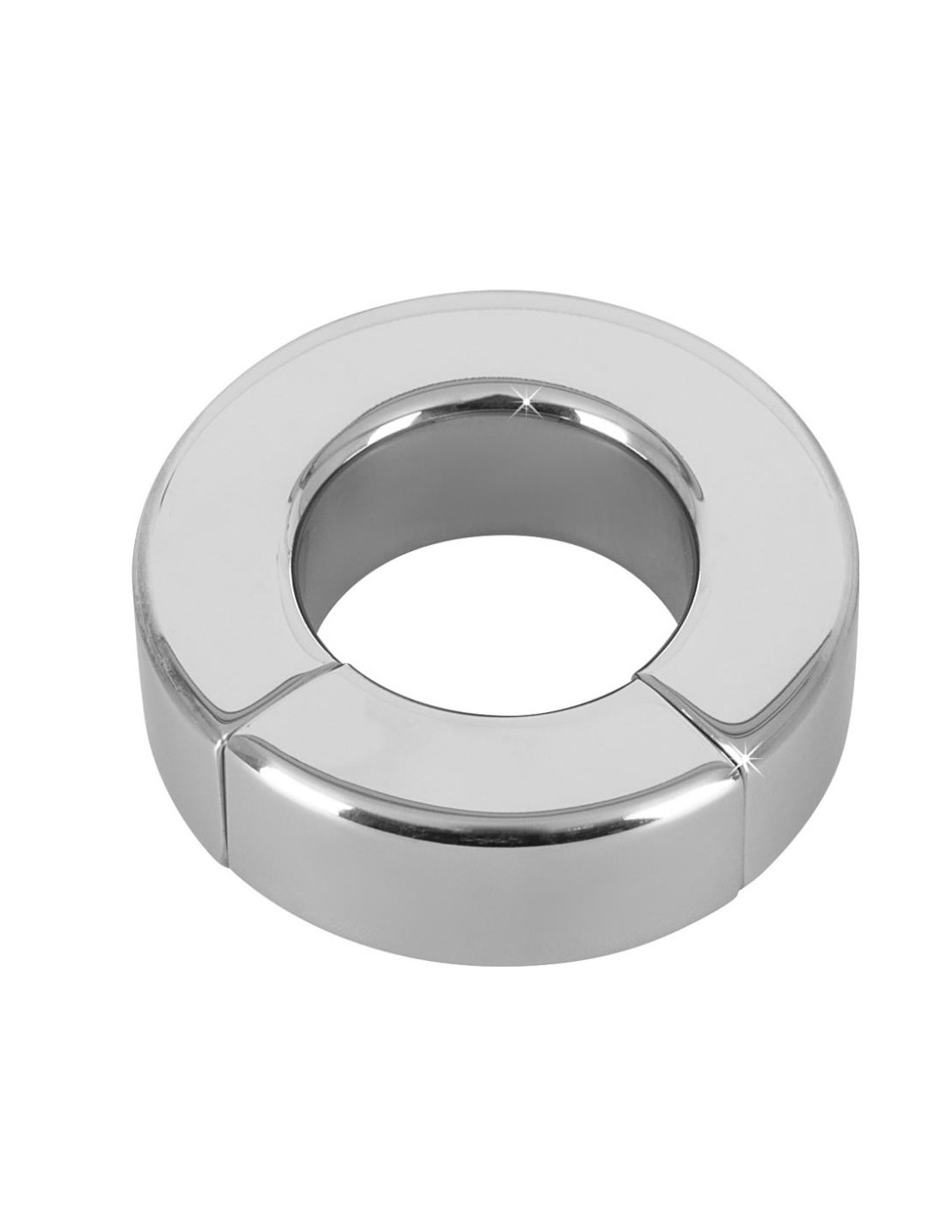 Anello per il pene/testicolo di colore argento in acciaio inossidabile con segmento magnetico per l'apertura e la chiusura. O̸ interno 34 mm, O̸ esterno 63 mm. Spessore dell'anello 20 mm. Peso 341 g. Metallo.