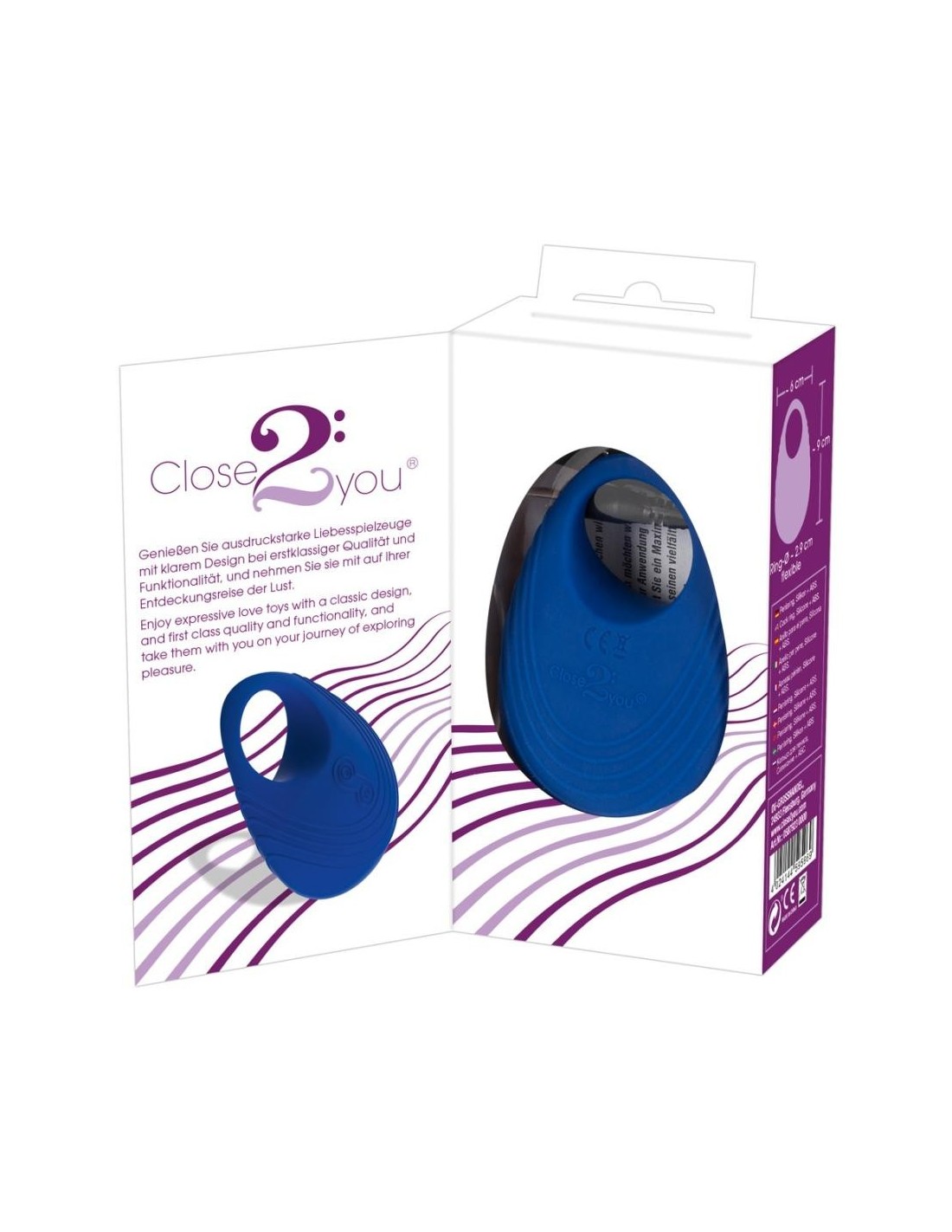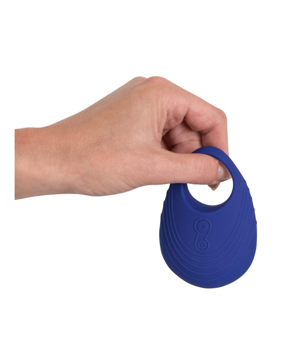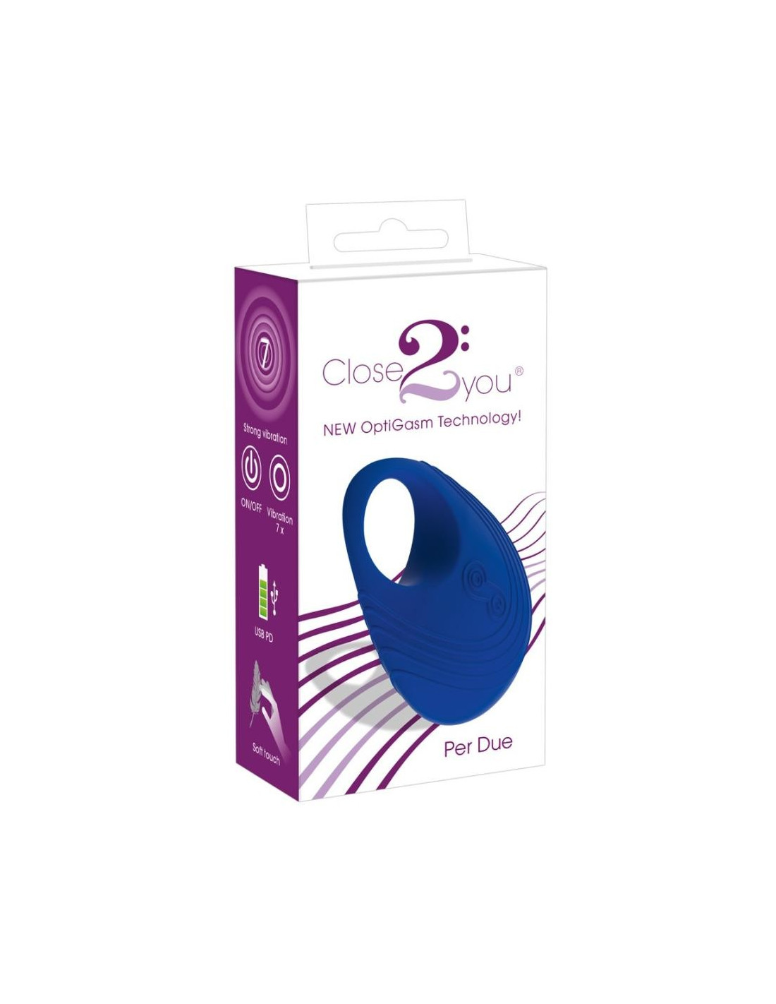 Waterproof vibro-cock ring with stimulating grooves. The new OptiGasm technology provides high and low frequencies. These frequencies create very deep vibrations that spread throughout the body. With 3 speeds and 4 pulsation levels. With an LED display light and two buttons (On/Off button and function control button). Blue. Rechargeable with the included USB cable. Complete length: 9 cm, width: 6 cm, O̸: 2.9 cm (flexible). Material: silicone (with a PU coating), ABS, phthalate-free according to EU Regulation REACH. Charging time: 2 hours, battery life: 45 minutes.