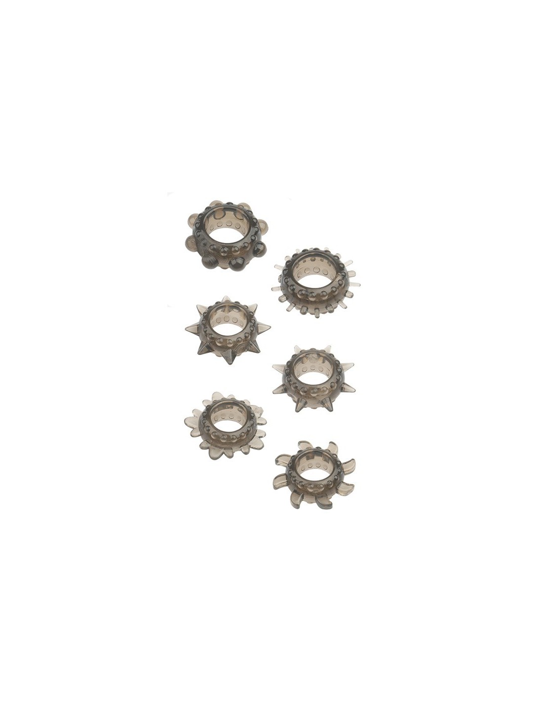 A set of 6 cock rings, made of high quality semi-transparent TPE and extremely stretchable. They penis rings can enlarge 4 times and are super comfortable. Each ring has a different design with special contours to stimulate the outer parts of the woman’s vagina at penetration.