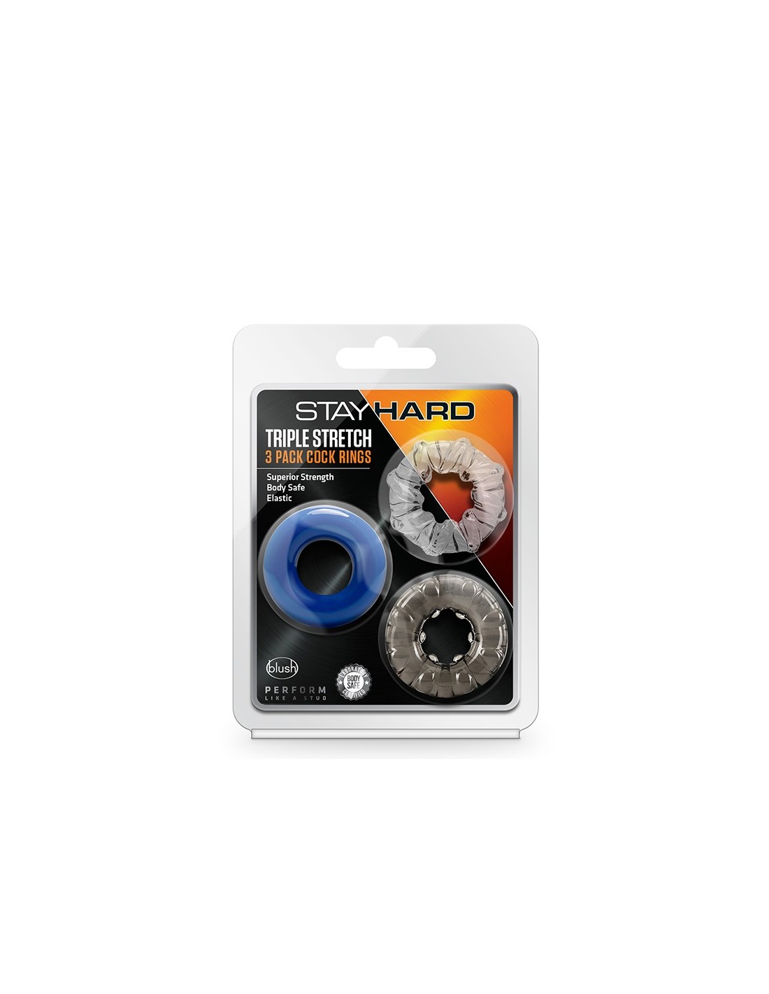 Play hard, play comfortable! The Stay Hard Triple Stretch 3 Pack Cock Rings gives you three rings that all feel good, look sexy, build pressure, and expand your orgasmic possibilities. They are also stretchy, easy to put on, super comfortable, and reusable. Made of premium TPE, they're phthalate-free and simple to clean.