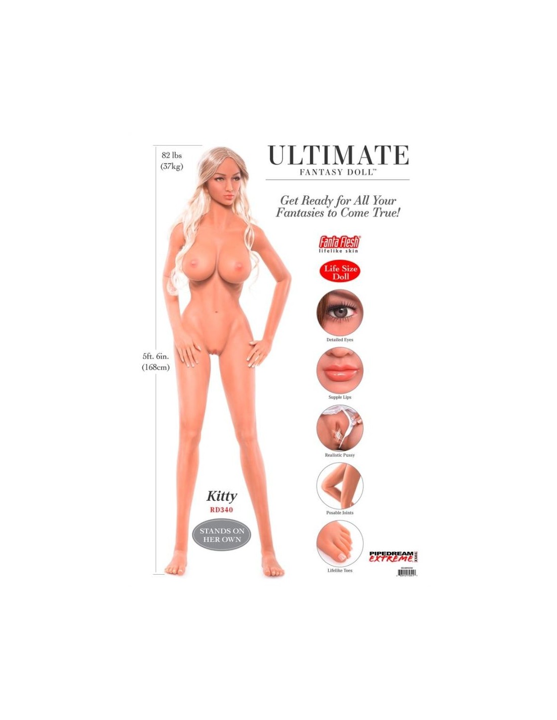 La bellezza a grandezza naturale è quasi indistinguibile da una donna vera! Kitty ha un viso in 3D con occhi verdi vividi, ciglia lunghe e labbra carnose. La sua pelle è fatta di materiale Fanta Flesh di alta qualità e sembra assolutamente realistica. Allo stesso modo, le aperture della vagina, dell'ano e della bocca sono completamente vere da sentire. Anche le labbra sono seducentemente realistiche. La bionda dai capelli lunghi ha una silhouette extra sottile e un seno voluttuoso con capezzoli perfettamente modellati. Le mani e i piedi sono convincenti con la loro rappresentazione dettagliata fino alle unghie curate. Uno scheletro di alluminio all'interno rende Kitty mobile dalla testa ai piedi. I bulloni sulle piante dei piedi permettono alla bionda di stare in piedi da sola. La bambola dell'amore viene consegnata con numerosi accessori: