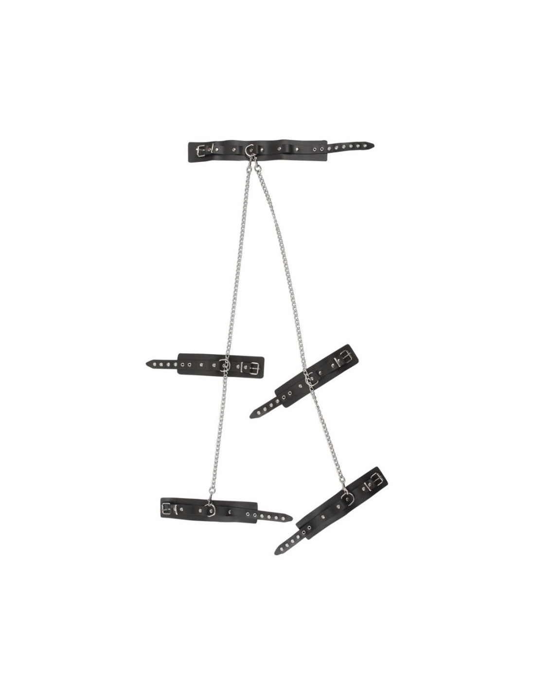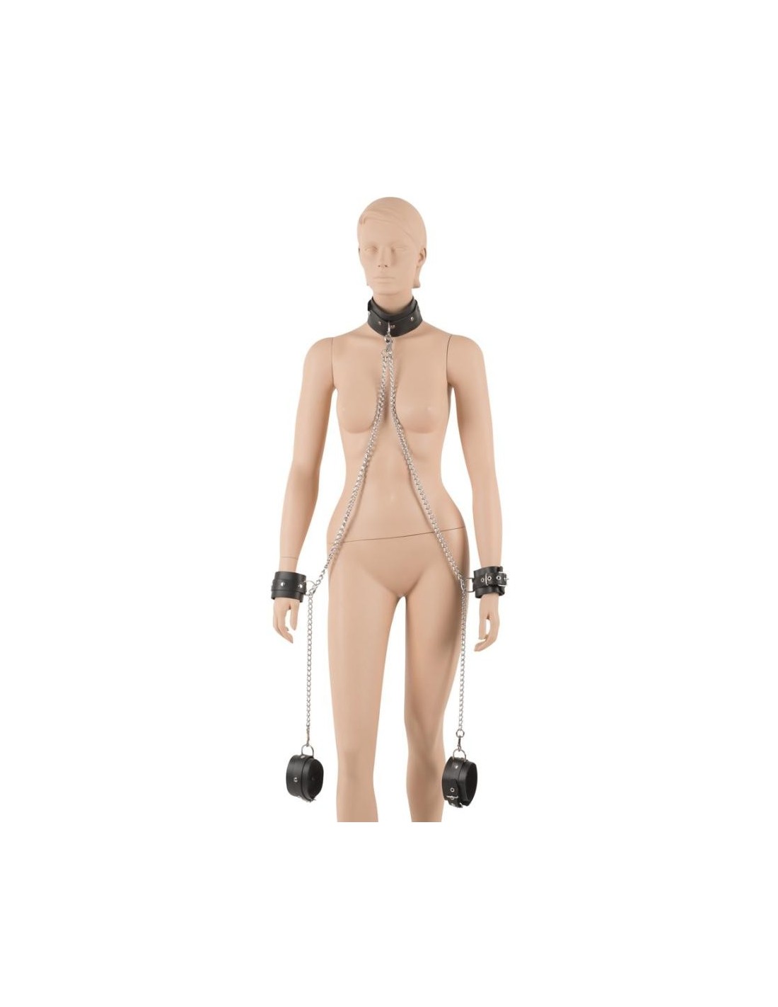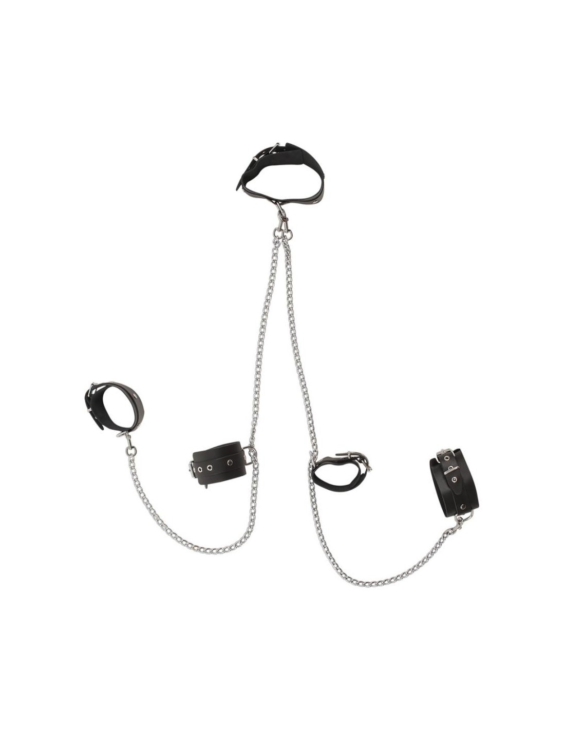Catene a moschettone sferraglianti conducono dal colletto alle manette sui polsi e da qui alle manette sulle caviglie. Polsini e colletto larghi 6 cm, regolabili. Catene lunghe 1 m ciascuna, staccabili!