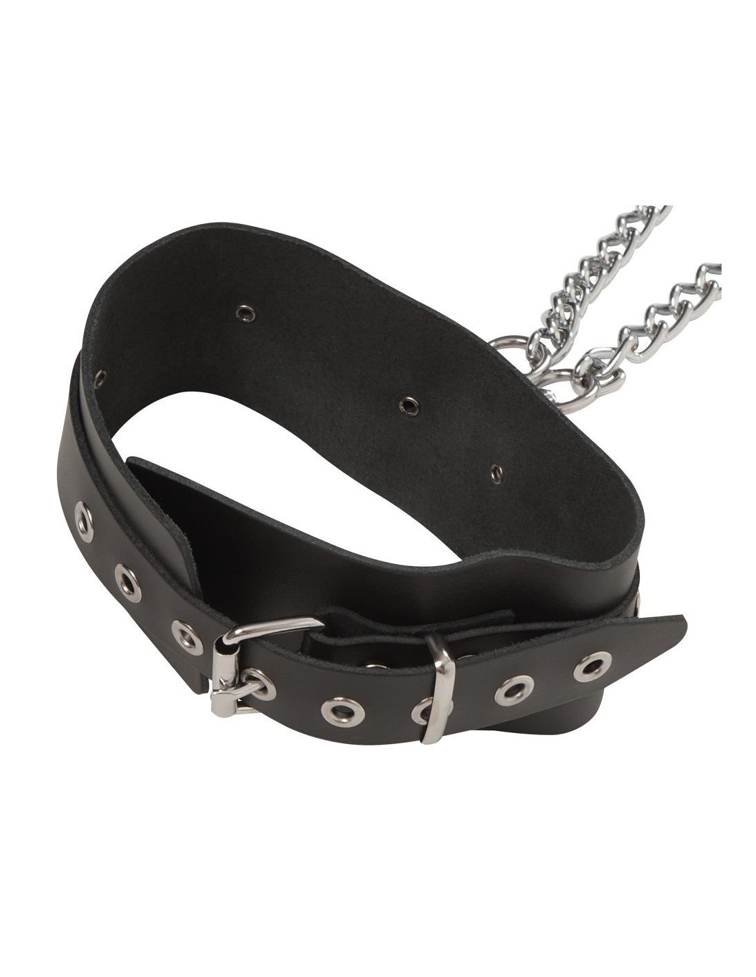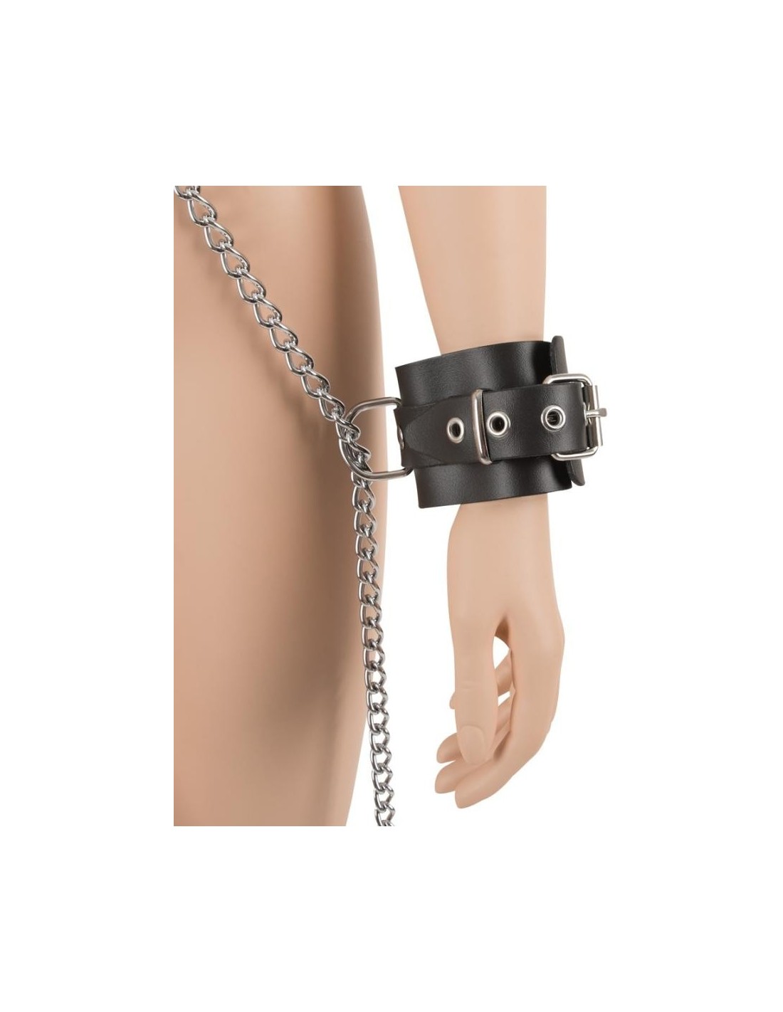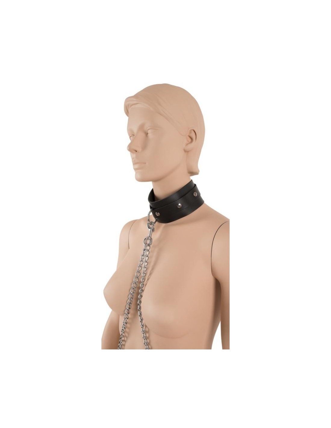Catene a moschettone sferraglianti conducono dal colletto alle manette sui polsi e da qui alle manette sulle caviglie. Polsini e colletto larghi 6 cm, regolabili. Catene lunghe 1 m ciascuna, staccabili!
