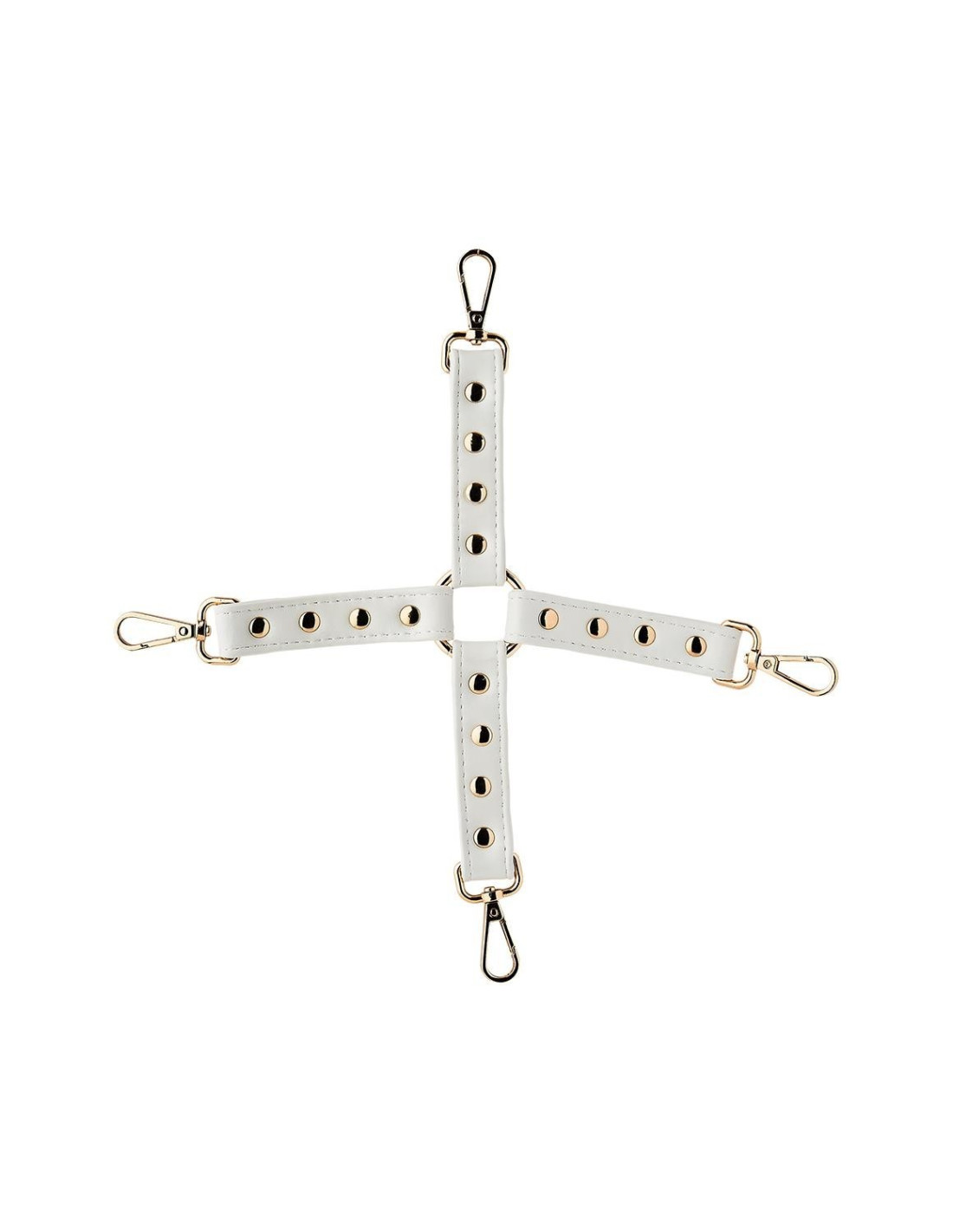 This hog tie from the Blaze Elite collection is made of white artificial leather with gold coloured metal details that makes it look very stylish. ,Enhance your bondage game with a hog tie to fasten the arms and legs of your sub. ,The 4 musketon hooks can be used to attach chains, ropes, handcuffs, ankle cuffs and other bondage accessories, for example the matching wrist and ankle cuffs from the Blaze Elite collection. ,