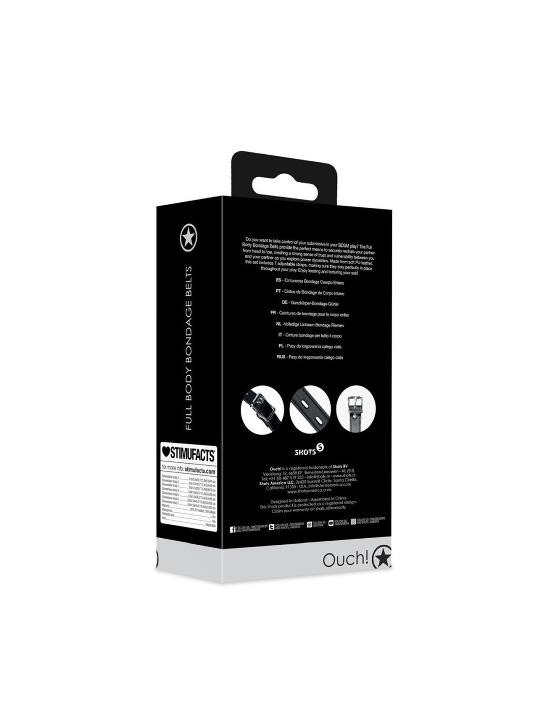 Vuoi prendere il controllo del tuo sottomesso nel tuo gioco BDSM? Le cinture bondage per tutto il corpo forniscono il mezzo perfetto per trattenere in modo sicuro il tuo partner dalla testa ai piedi, creando un forte senso di fiducia e vulnerabilità tra te e il tuo partner mentre esplori le dinamiche di potere. Realizzato in morbida pelle PU, questo set include 7 cinghie regolabili, assicurandosi che rimangano perfettamente in posizione durante il gioco. Divertiti e tortura il tuo sottomesso!