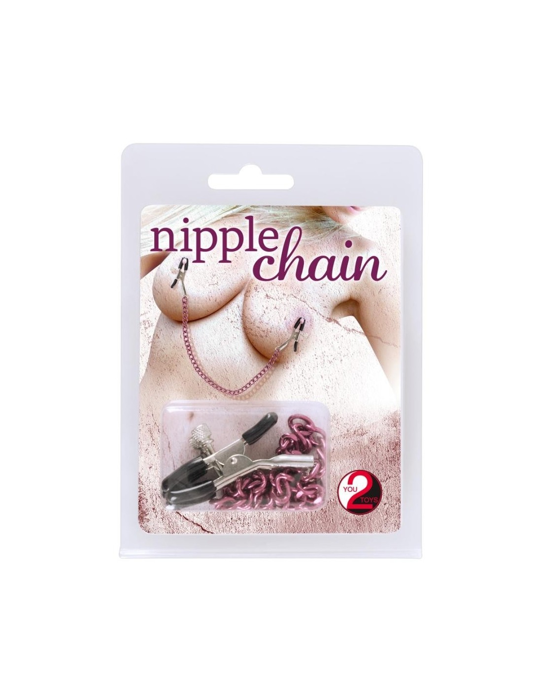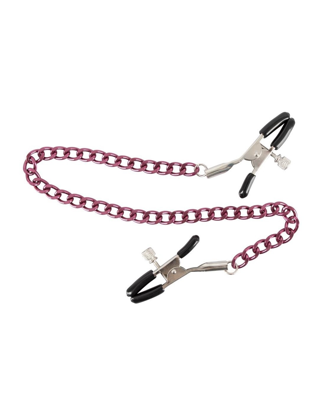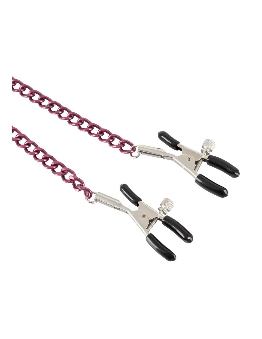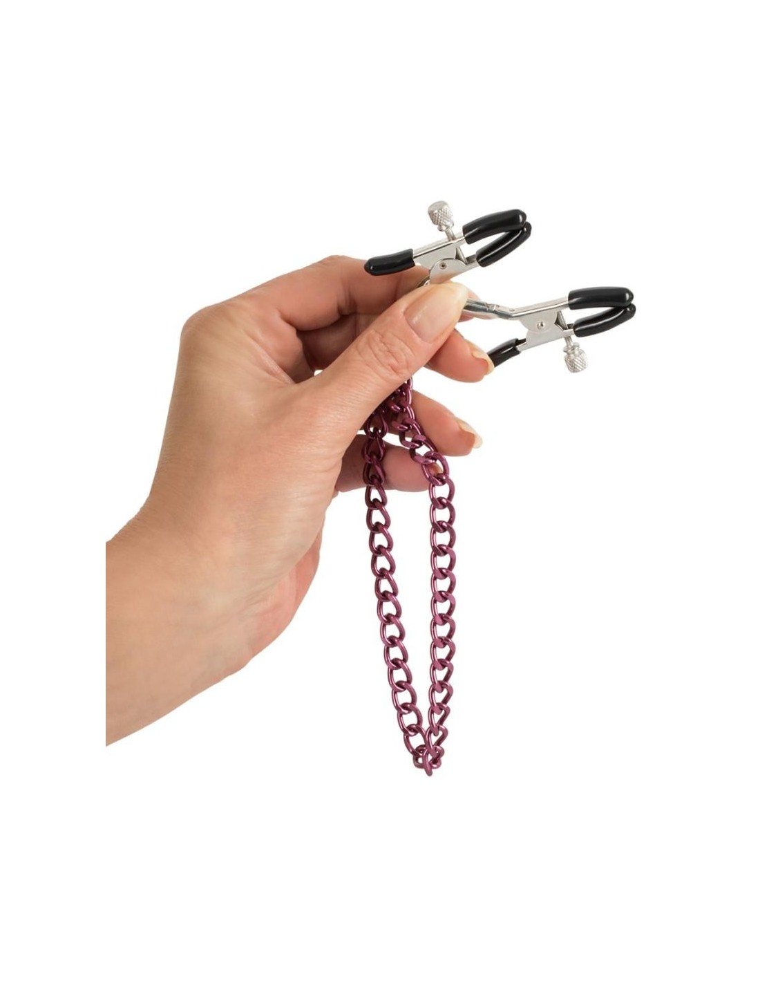 I due morsetti per capezzoli sono collegati tramite una catena viola. Le superfici di contatto dei morsetti sono gommate e l'intensità della pressione applicata ai nippli può essere regolata individualmente utilizzando le viti di regolazione.