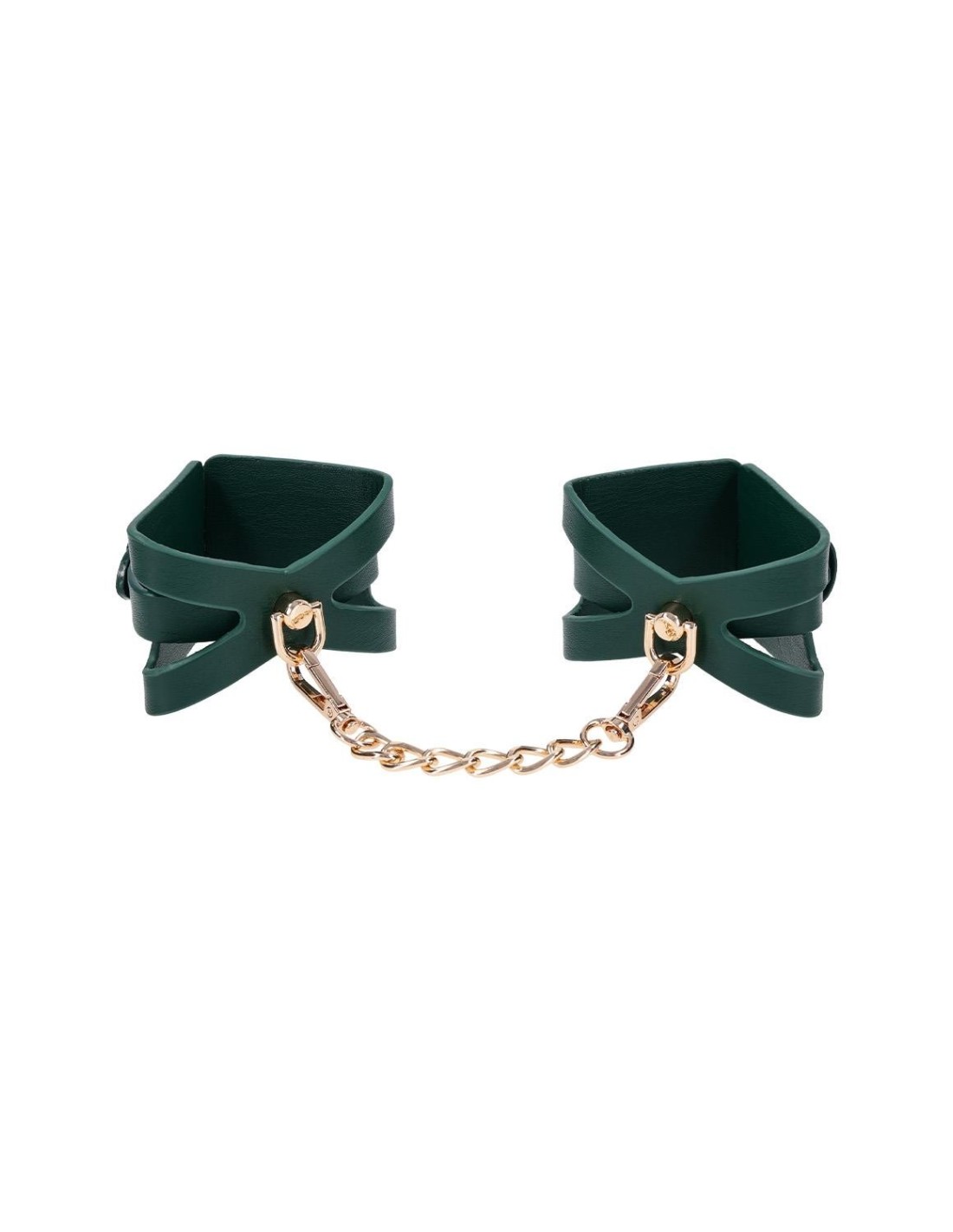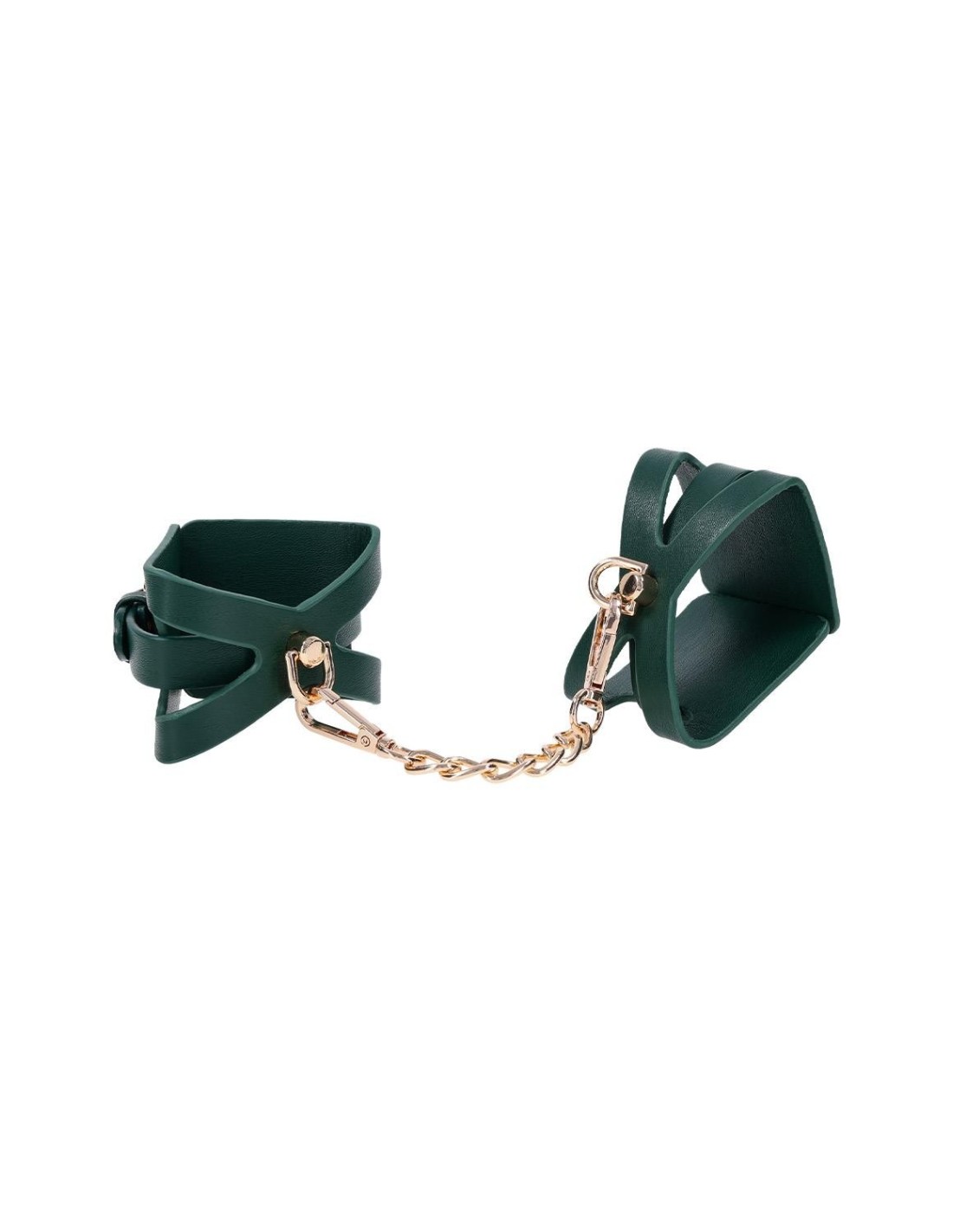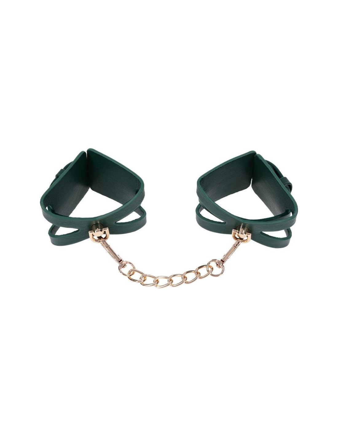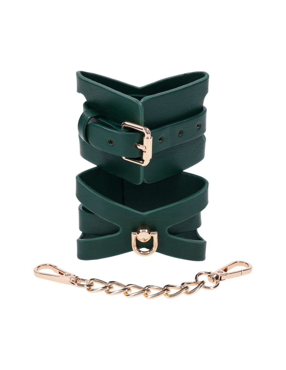 Get wrapped up in something irresistible. These emerald green cuffs feature dramatic cutout detailing to reveal more skin and spark more intrigue. Lined for softness and designed for visual seduction, they’re as comfortable as they are commanding. Use them to bind wrists together or attach to other Indica items for a coordinated scene. The gold chain and hardware add just the right touch of luxury to every surrender.