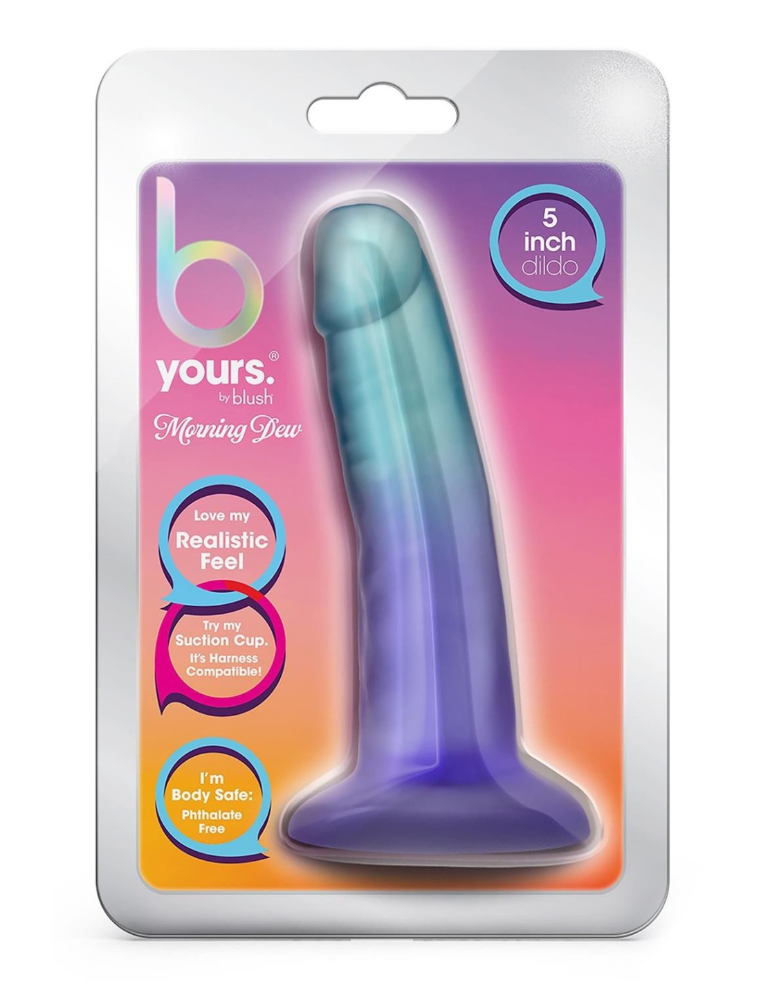 B Yours Morning Dew is a beautiful and realistic dildo with a sturdy suction cup base that holds to any smooth flat surface for solo time! Or partner up for strap-on harness fun! This gorgeous design has a gradient effect that truly brings some color to your playtime. This exceptional dildo is perfect for beginners, measuring at 5.5 inches in length and 1.25 inches in width! Morning Dew is made of non-porous PVC and contains no fragrances, phthalates, paraffins or latex. Responsibly Made By Blush. We Care About Your Health And Wellness And Are Mindful Of What We Provide For Your Body. Lab Tested &, Certified In Compliance With Prop65 &, REACH Product &, Material Safety Requirements. We Recommend Cleaning With Soap And Water Before And After Use. Silicone, Water Based, Hybrid Lube Safe.