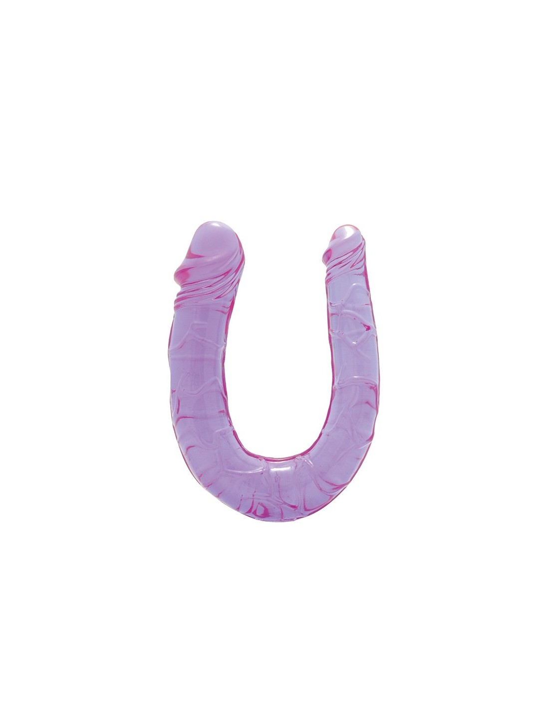 This double headed dong has a rigid U shape for double penetration. One end is thicker than the other. Both heads have the shape of a glans. The shaft has veins, for a life like experience.