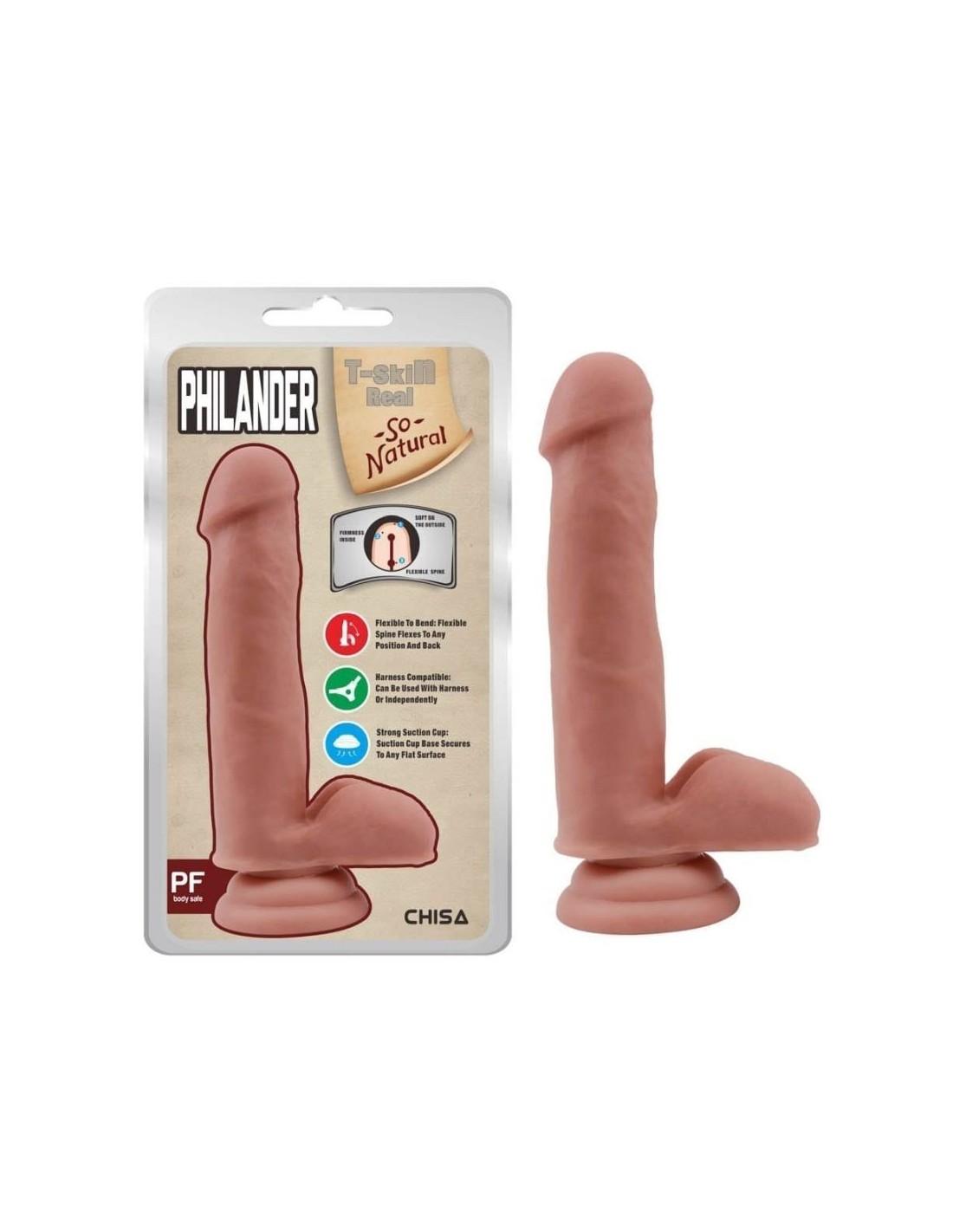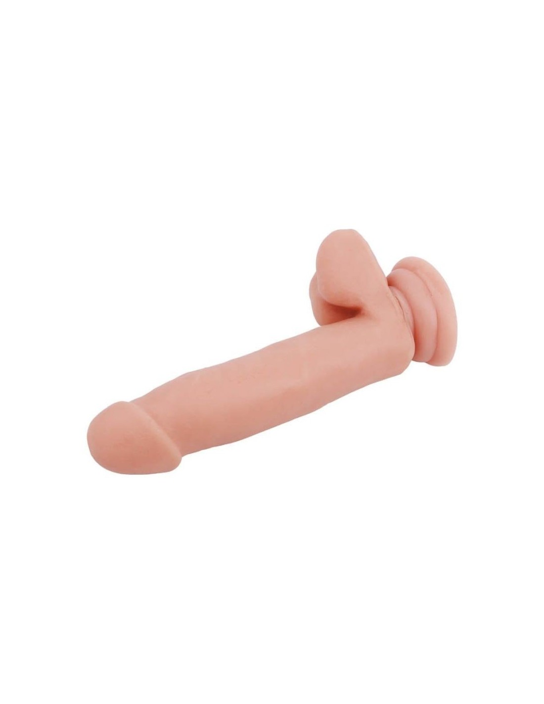 Un dildo a forma di pene con uno strato esterno morbido e un nucleo interno duro, fatto di una consistenza simile alla pelle, simile al tessuto corporeo, senza motore, con una superficie vascolare, con testicoli, flessibile e pieghevole a diverse angolazioni. La ventosa puo' essere utilizzata per fissarlo a una superficie piana.