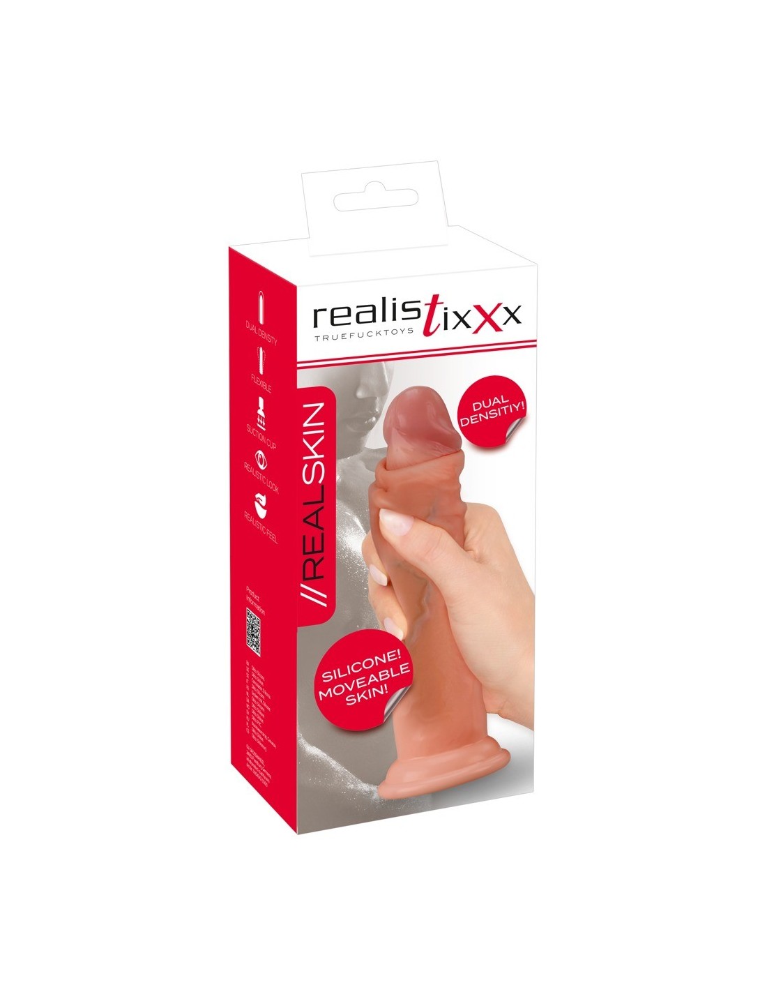 Il dildo flessibile Real Skin di Realistixxx ha un aspetto assolutamente realistico del pene, con una superficie venata (pelle) flessibile e un glande sporgente. Con una base di aspirazione che aderisce saldamente e in modo sicuro a qualsiasi superficie liscia per un divertimento a mani libere. Il dildo è quindi compatibile anche con strap-on e orinatoi.