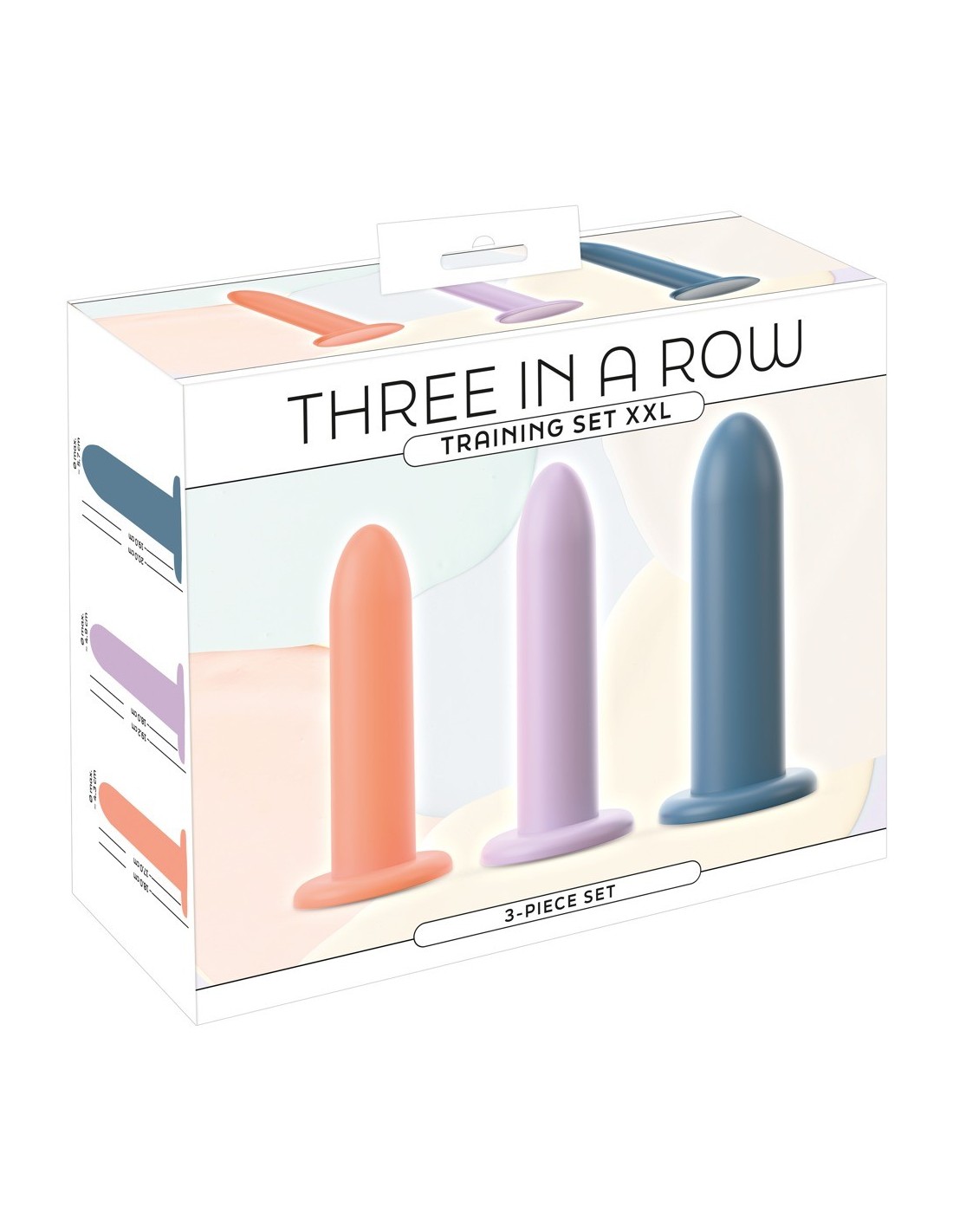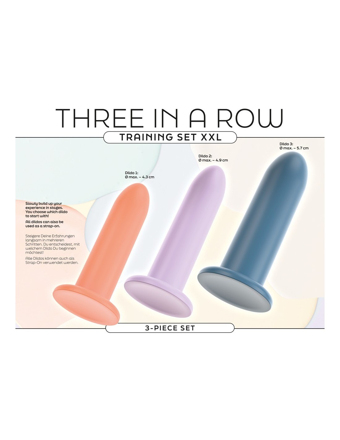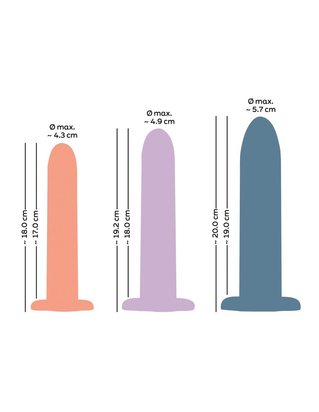 Training Set Three in a Row di You2Toys con 3 dildo in silicone solido in diversi colori pastello, dimensioni e pesi. I dildo sono piacevolmente solidi e flessibili allo stesso tempo, il che li rende versatili - da soli o in coppia. Grazie alle loro dimensioni generose, il trio di dildo è particolarmente ideale per gli utenti esperti che hanno già dimestichezza con i diametri più grandi e vogliono spingersi oltre - vaginalmente o analmente. Il set offre agli utenti più esperti una maggiore varietà e sfida nella loro esperienza di piacere o di allenamento.