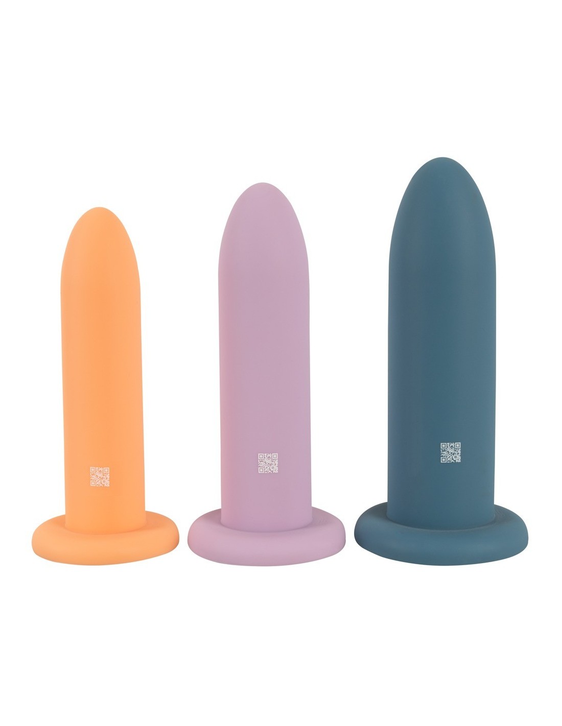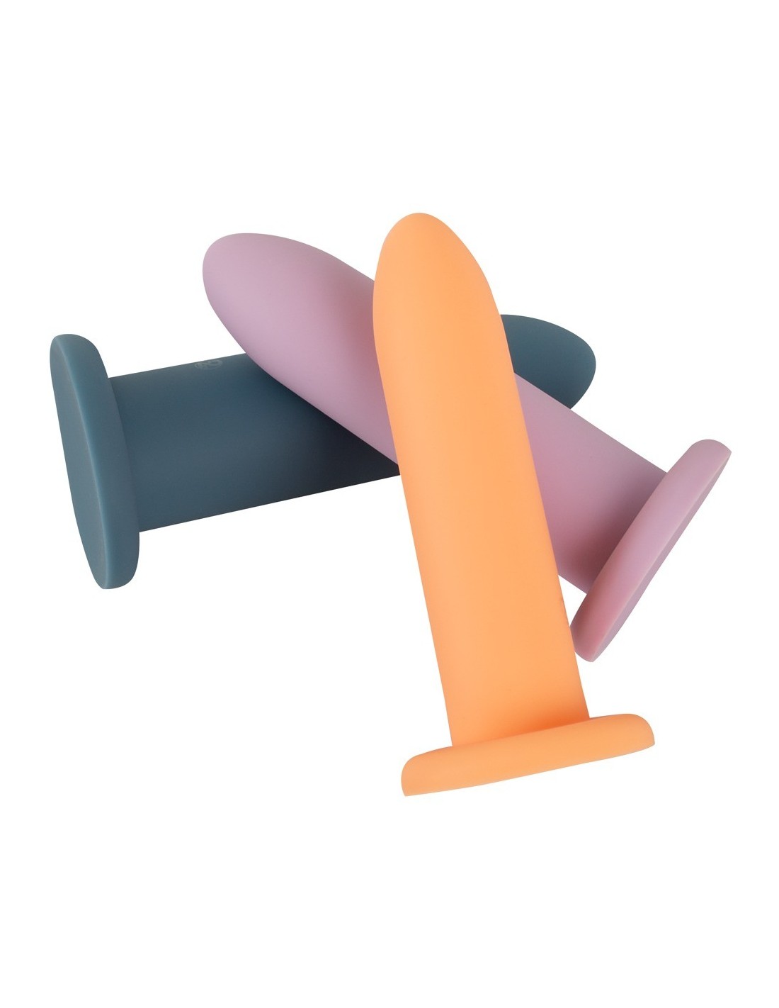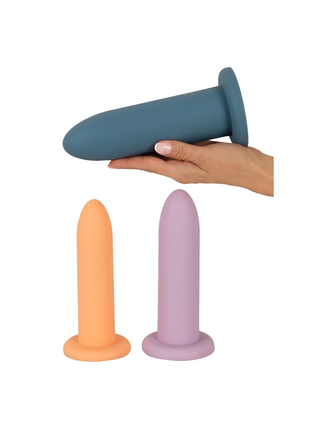Training Set Three in a Row di You2Toys con 3 dildo in silicone solido in diversi colori pastello, dimensioni e pesi. I dildo sono piacevolmente solidi e flessibili allo stesso tempo, il che li rende versatili - da soli o in coppia. Grazie alle loro dimensioni generose, il trio di dildo è particolarmente ideale per gli utenti esperti che hanno già dimestichezza con i diametri più grandi e vogliono spingersi oltre - vaginalmente o analmente. Il set offre agli utenti più esperti una maggiore varietà e sfida nella loro esperienza di piacere o di allenamento.