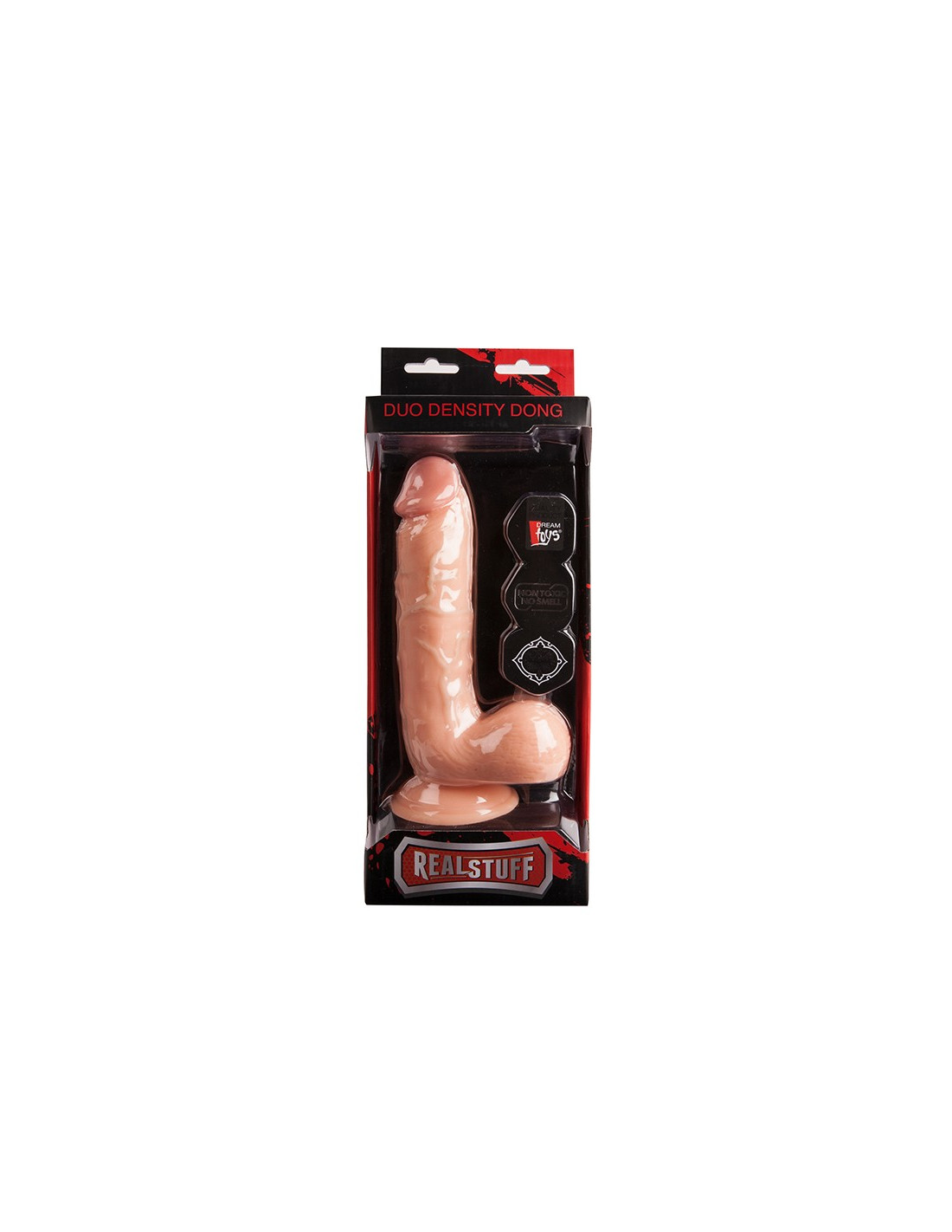 8inch PVC duo density dong with suction cup.Realistically shaped with lifelike veins and scrotum.Made of body safe real feel material.Hard on the inside, soft and smooth on the\u00A0outside.This dildo is ultra-lifelike with a glans, veins and scrotum and is made of non-toxic PVC that does not smell. A special feature of this dildo is the Duo Density, which means that the dildo is soft on the outside and firm on the inside. This makes the experience very realistic. The super realistic dildo has a slightly tilted, straight shaft design. Thanks to the strong suction cup base it will stick firmly to any flat smooth surface enabling hands free and solo play. The size of 8 inch (20.3 cm) is rather large and suitable for users who know they like it big.