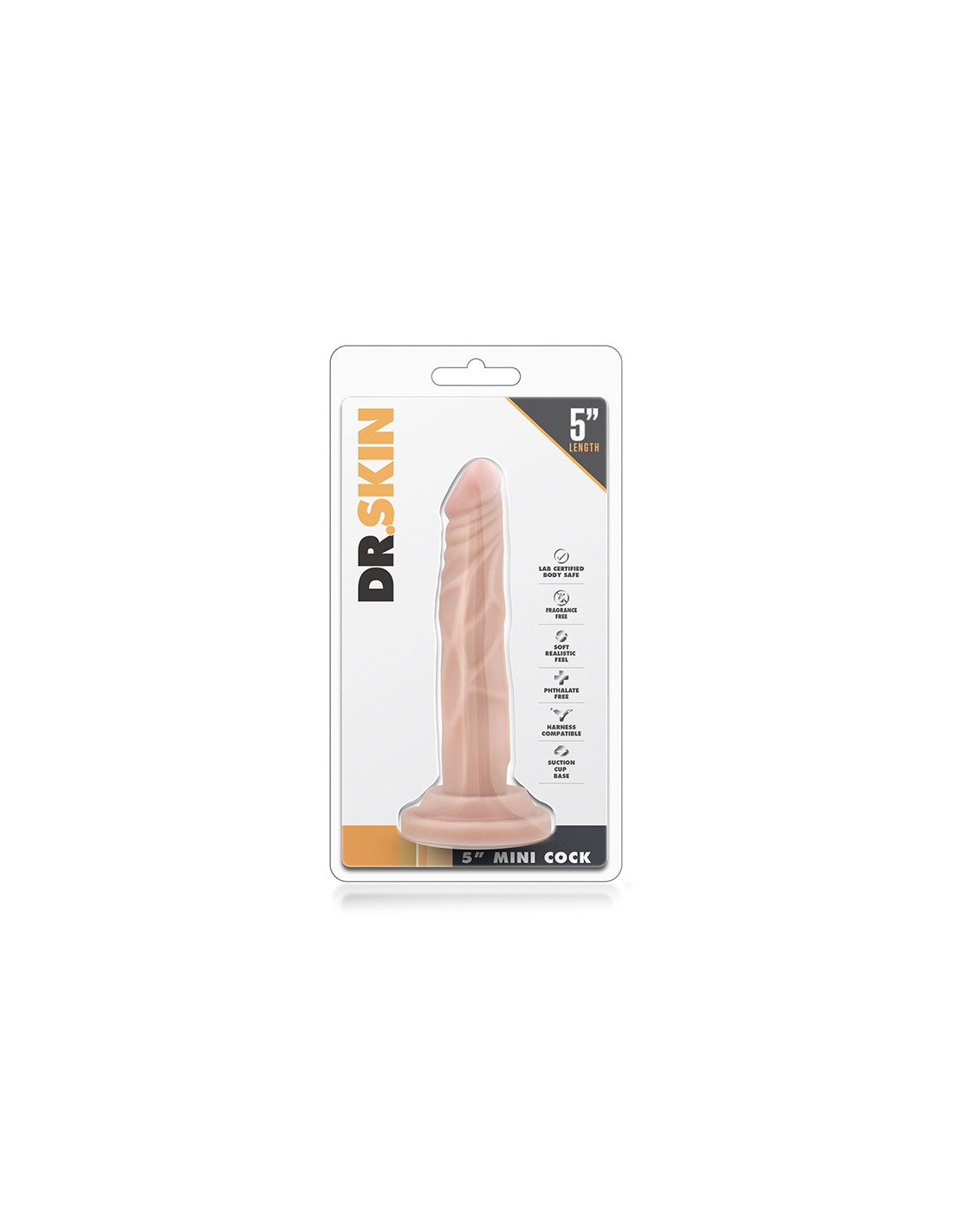The doctor is in! The Dr. Skin 5 Inch Mini Cock is perfectly sized for anyone who likes it a little smaller. Featuring a slim shaft but average length, the Mini Cock is designed for easy insertion. This dildo is hand-sculpted to look and feel like the real thing. The suction cup base will stick to almost any smooth, flat surface and is harness compatible. The Dr. Skin Mini Cock is designed for solo play, partner play, pegging, and any kind of penetration. Its size means it's ideal as a first-time dildo purchase! Made from body safe TPE, the Mini Cock contains no fragrances, phthalates, paraffins, or latex.