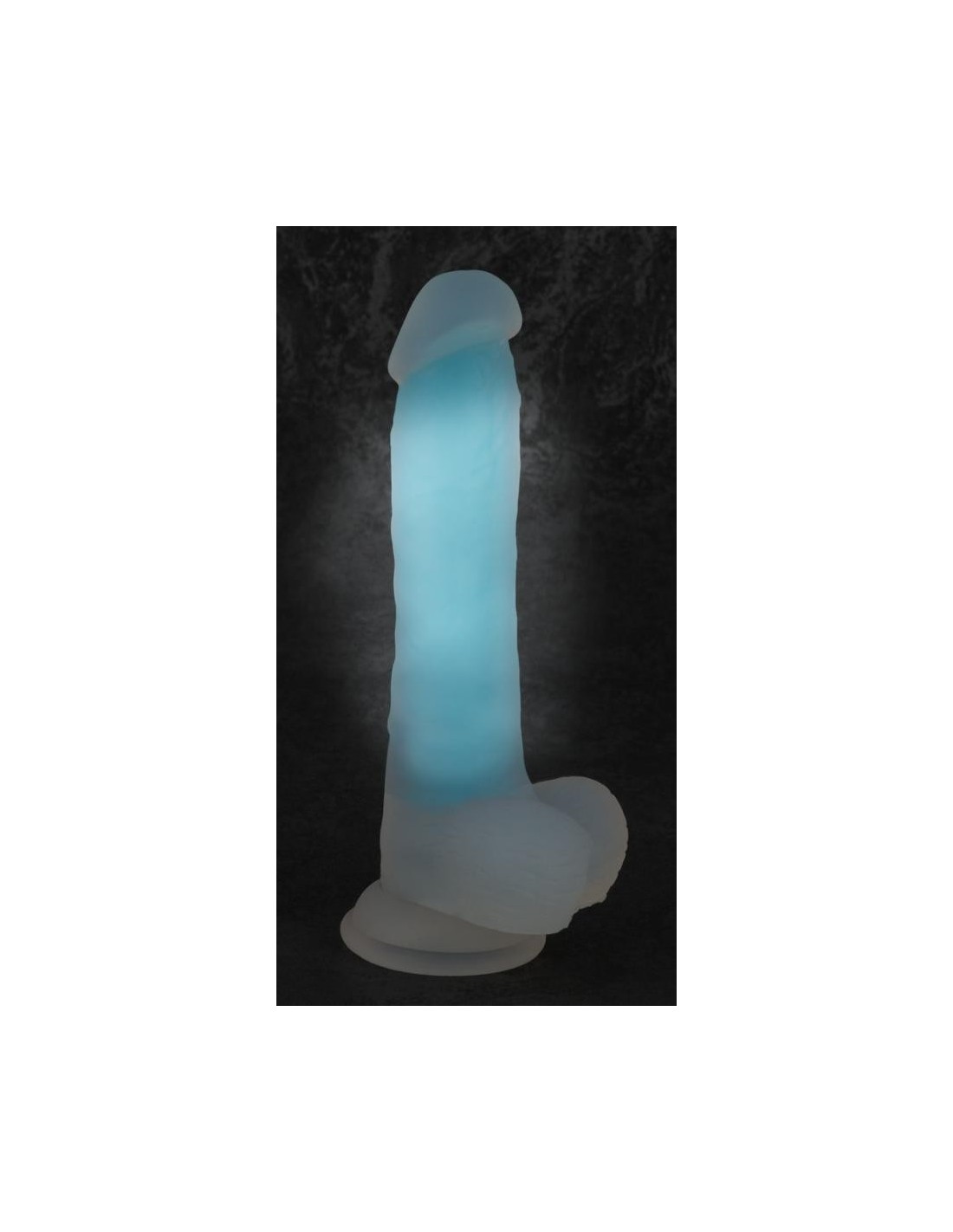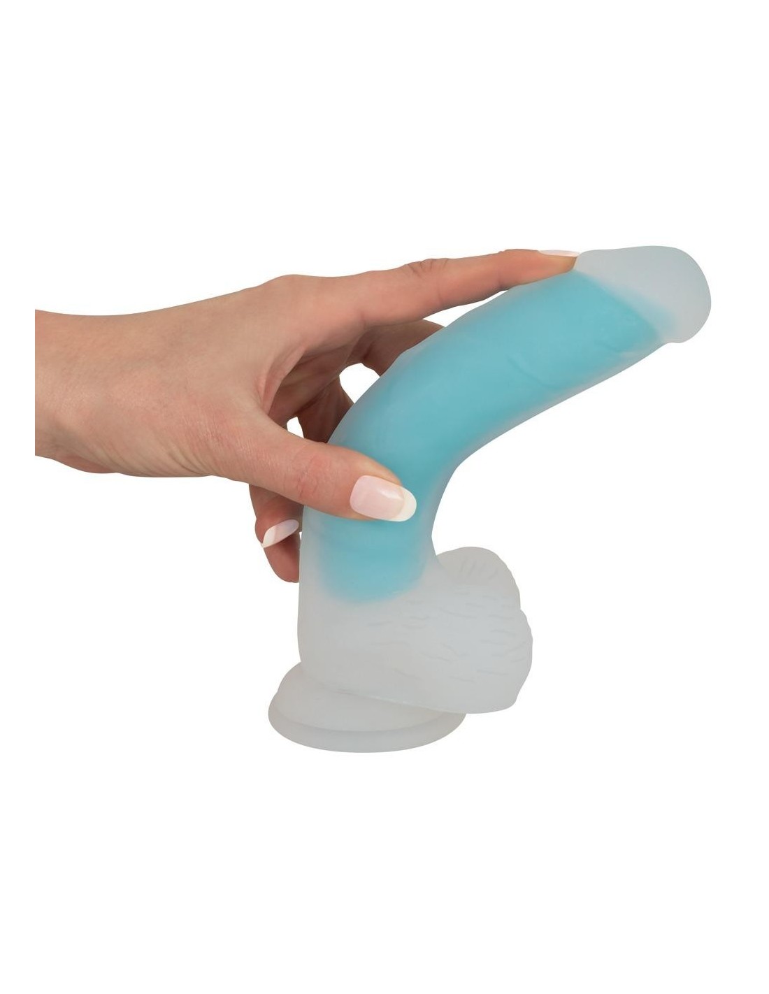 Dildo naturale Glow in the Dark di You2Toys, trasparente come il latte, con un nucleo turchese che brilla al buio. Come un pene originale con testicoli aderenti, glande prominente e venature. Realizzato senza soluzione di continuità in silicone liquido non poroso con una superficie super-morbida, scivola sulla pelle come per magia - e nelle regioni intime. Con pratica base di aspirazione per un piacere a mani libere.