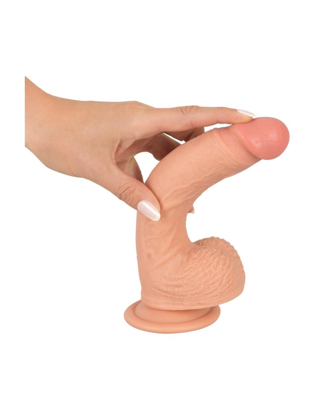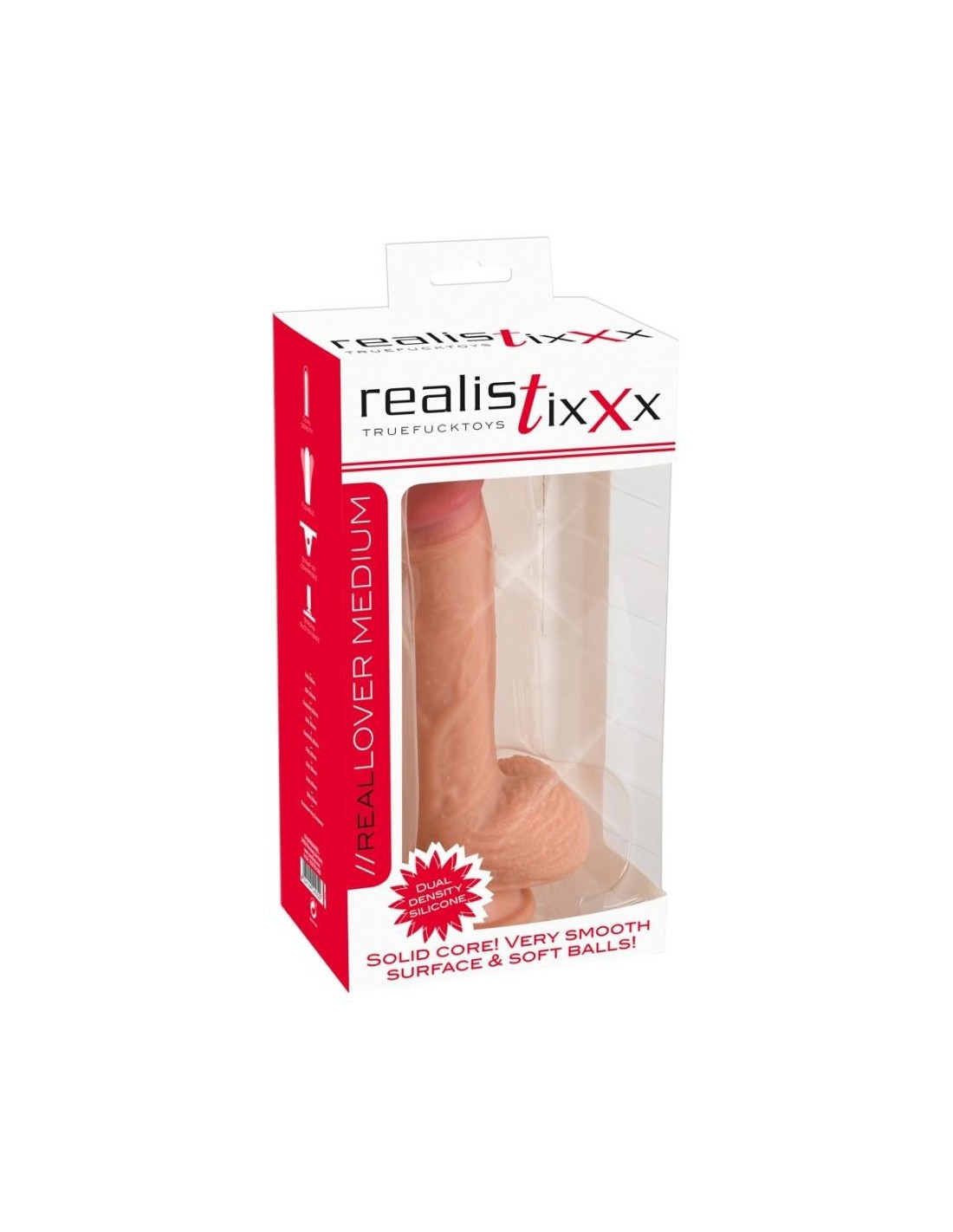 Realistic Real Lover Dildo naturale medio di Realistixxx con testicoli aderenti che impressiona con il suo realistico glande rosa e le sue caratteristiche venature. È fatto senza soluzione di continuità di silicone liquido non poroso e non solo sembra assolutamente realistico, ma si sente anche lo stesso. Splendidamente rigido, ma flessibile, prende parte ad ogni posizione e scivola sulla pelle come per magia con la sua superficie super morbida e realisticamente flessibile. Con una pratica base di aspirazione - quindi è compatibile con l'imbracatura e adatto al piacere a mani libere.