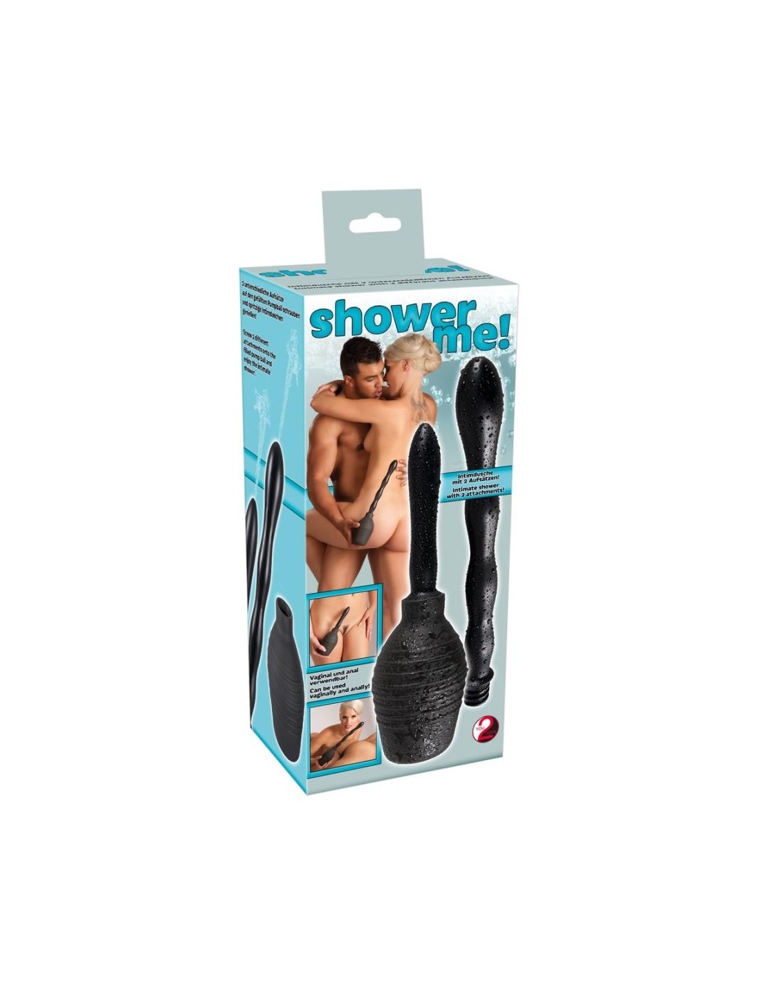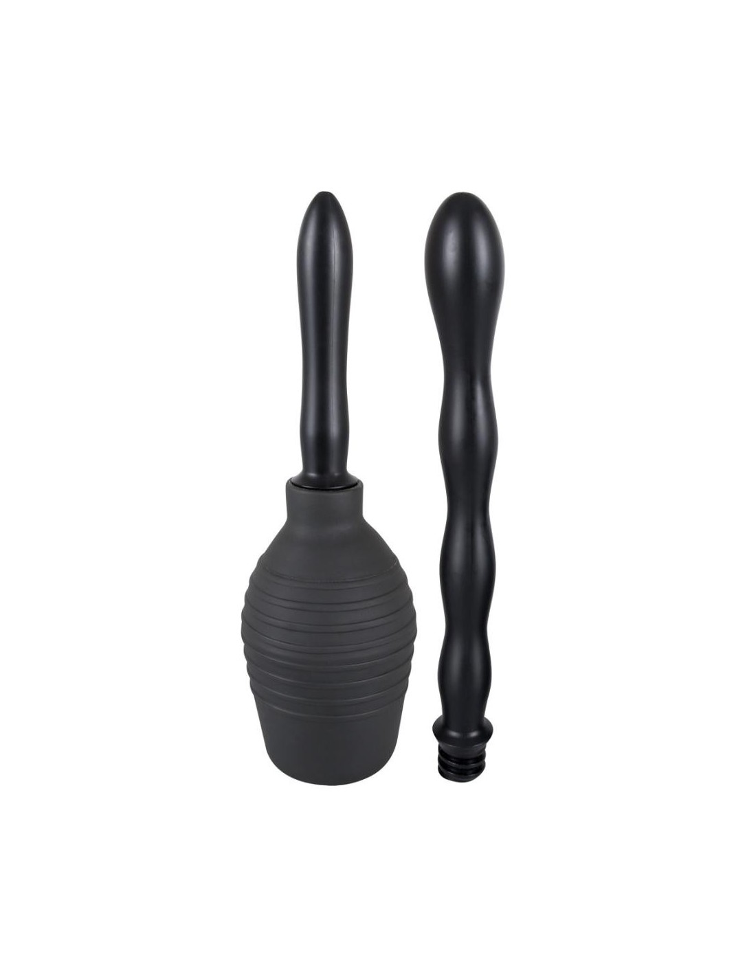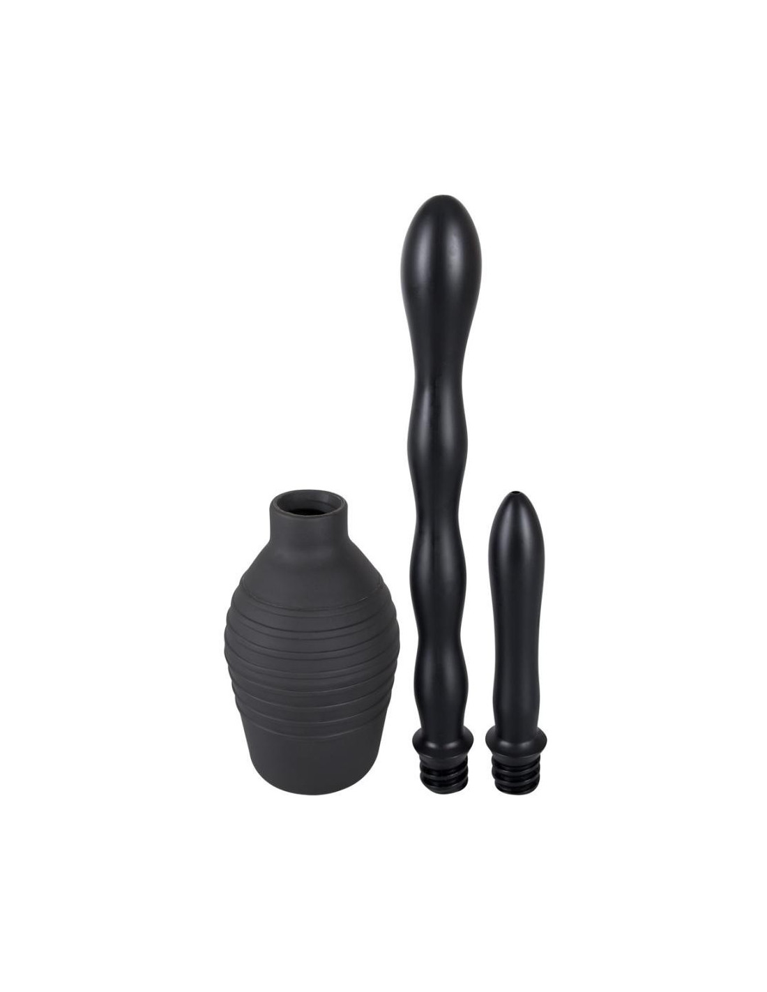 Doccia intima nera (altezza 13 cm, capacità 300 ml) con due attacchi intercambiabili a vite con ugelli a spruzzo. Facile da pulire. Attacco lungo e ondulato: lunghezza totale ca. 23 cm, O̸ 1,7-3 cm. Attacco corto e liscio: ca. 11,5 cm di lunghezza O̸ 1,9-2,3 cm). Materiale: PVC.