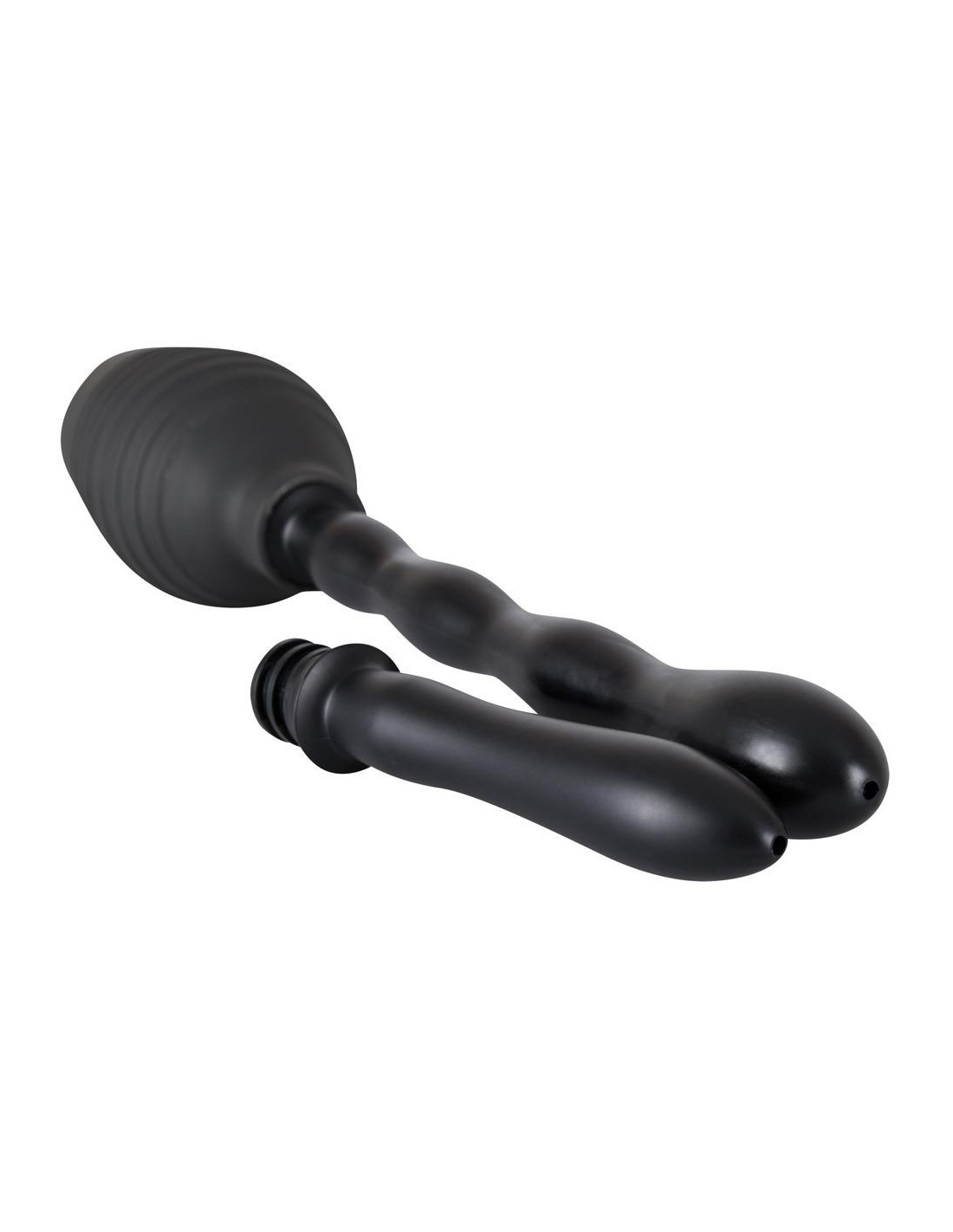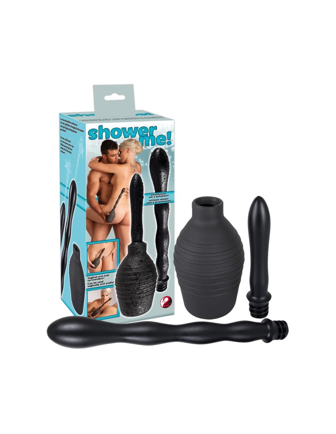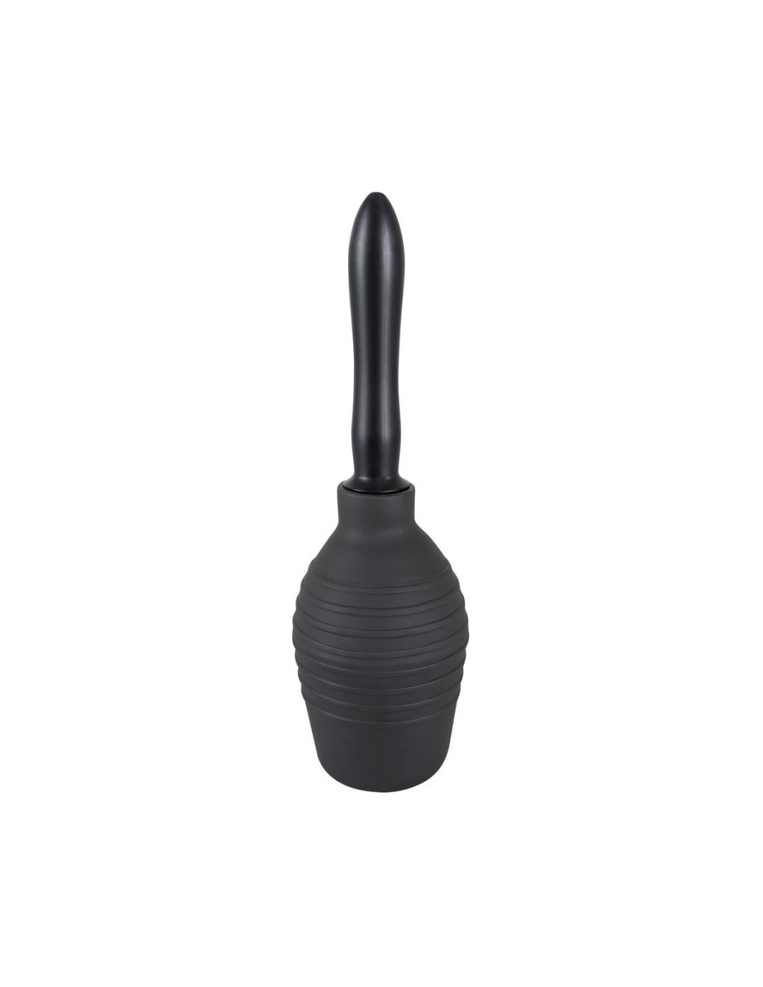 Doccia intima nera (altezza 13 cm, capacità 300 ml) con due attacchi intercambiabili a vite con ugelli a spruzzo. Facile da pulire. Attacco lungo e ondulato: lunghezza totale ca. 23 cm, O̸ 1,7-3 cm. Attacco corto e liscio: ca. 11,5 cm di lunghezza O̸ 1,9-2,3 cm). Materiale: PVC.