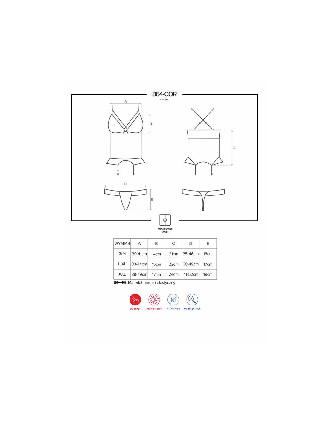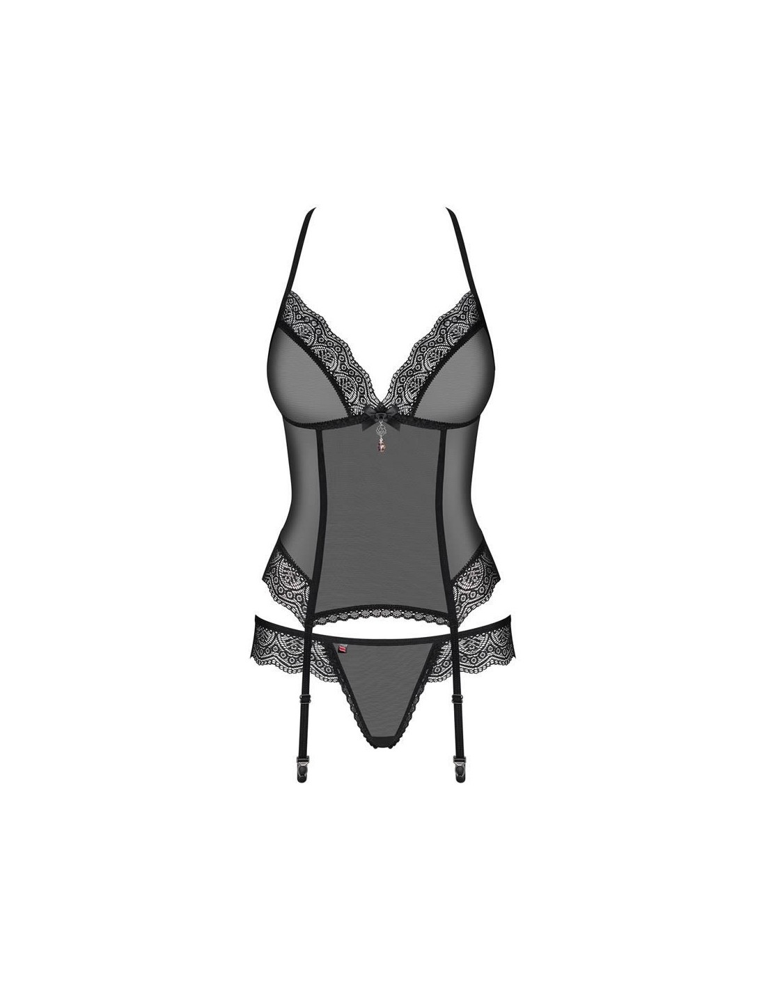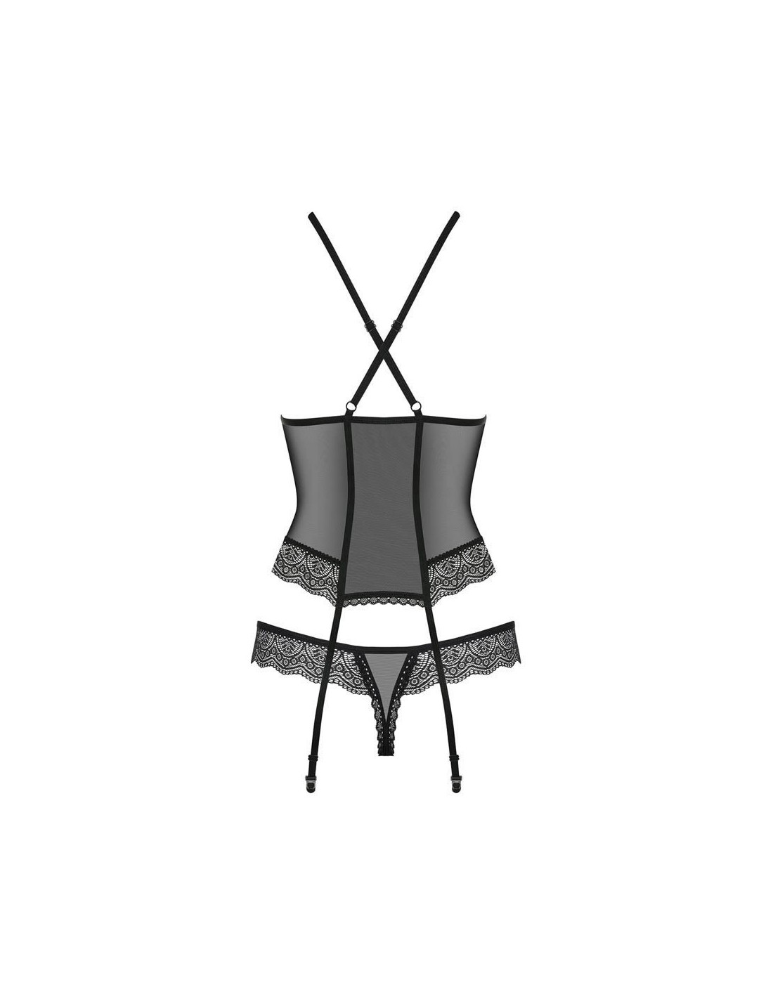 Il pizzo nero enfatizza le tue curve femminili, i lacci seducenti ti faranno sentire molto sexy. Sei pronta per esperienze deliziose? Incredibile lingerie porta notti fantastiche! Indossa questo adorabile corsetto e ... cadi nelle braccia del tuo amato! Tutti i dettagli allettanti: - corsetto sexy adornato con bellissimi merletti geometrici - lacci regolabili - facili da regolare - lacci incrociate sul retro - design sexy - pizzo sul busto - seno enfatizzato - verticale, doppio strato di mesh - effetto dimagrante ottico - arco e pendente con un gioiello beige - dettagli affascinanti - Reggicalze regolabili con eleganti fermagli - Il prodotto include corsetto e perizoma abbinato - calze non incluse - è possibile aggiungere calze da questa o altre collezioni - tessuto morbido e perfettamente elastico (94% poliammide, 6% elastan)