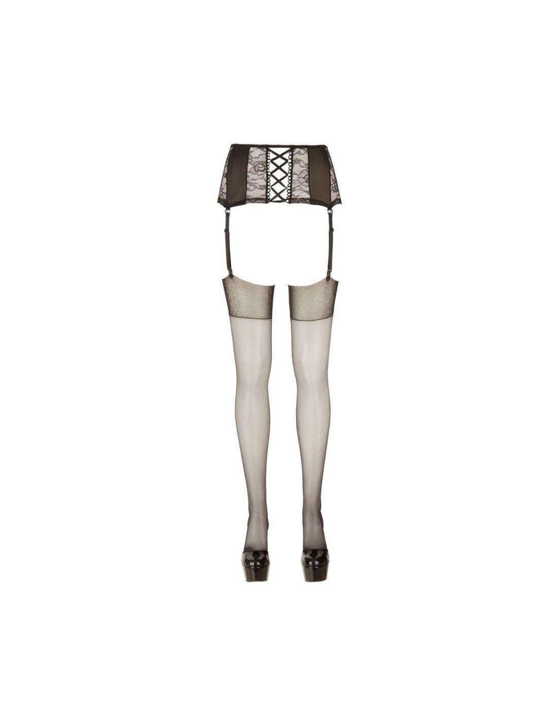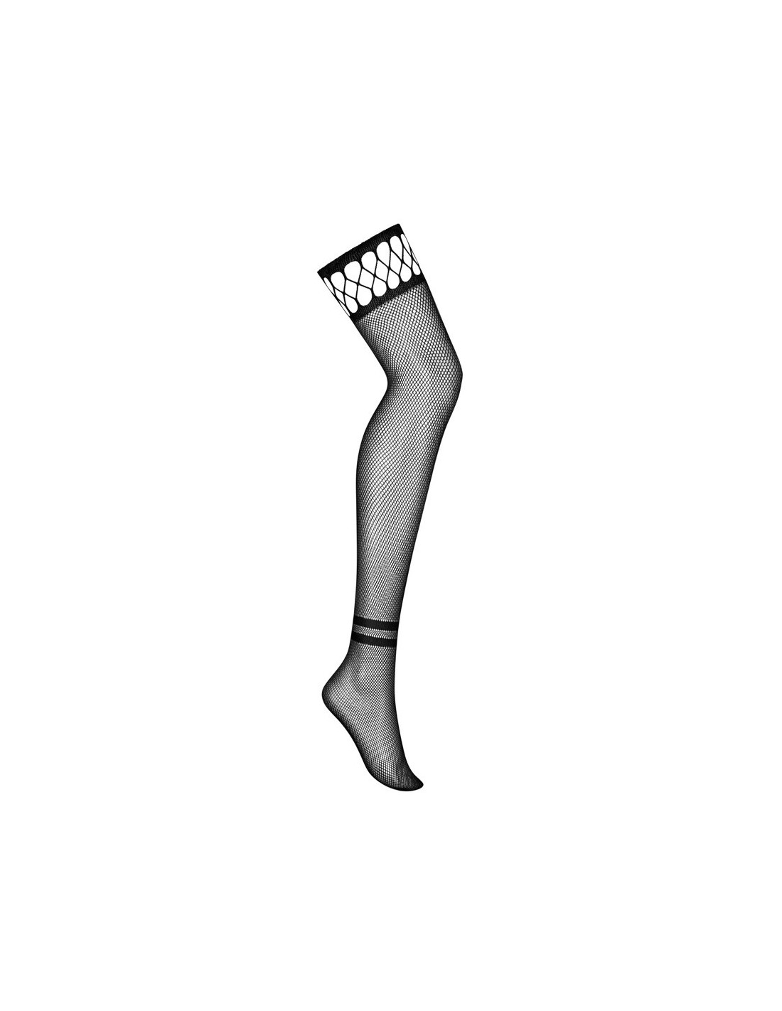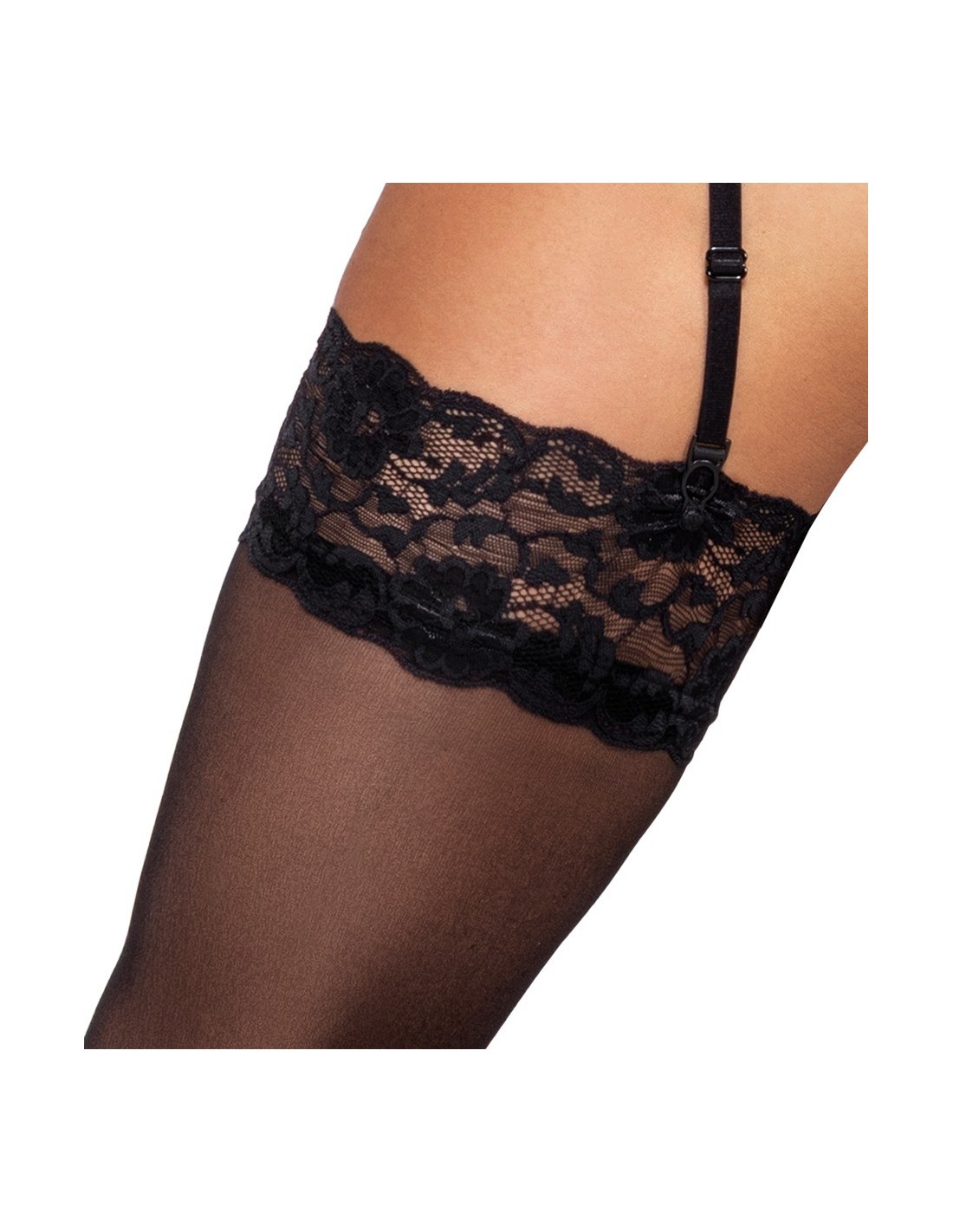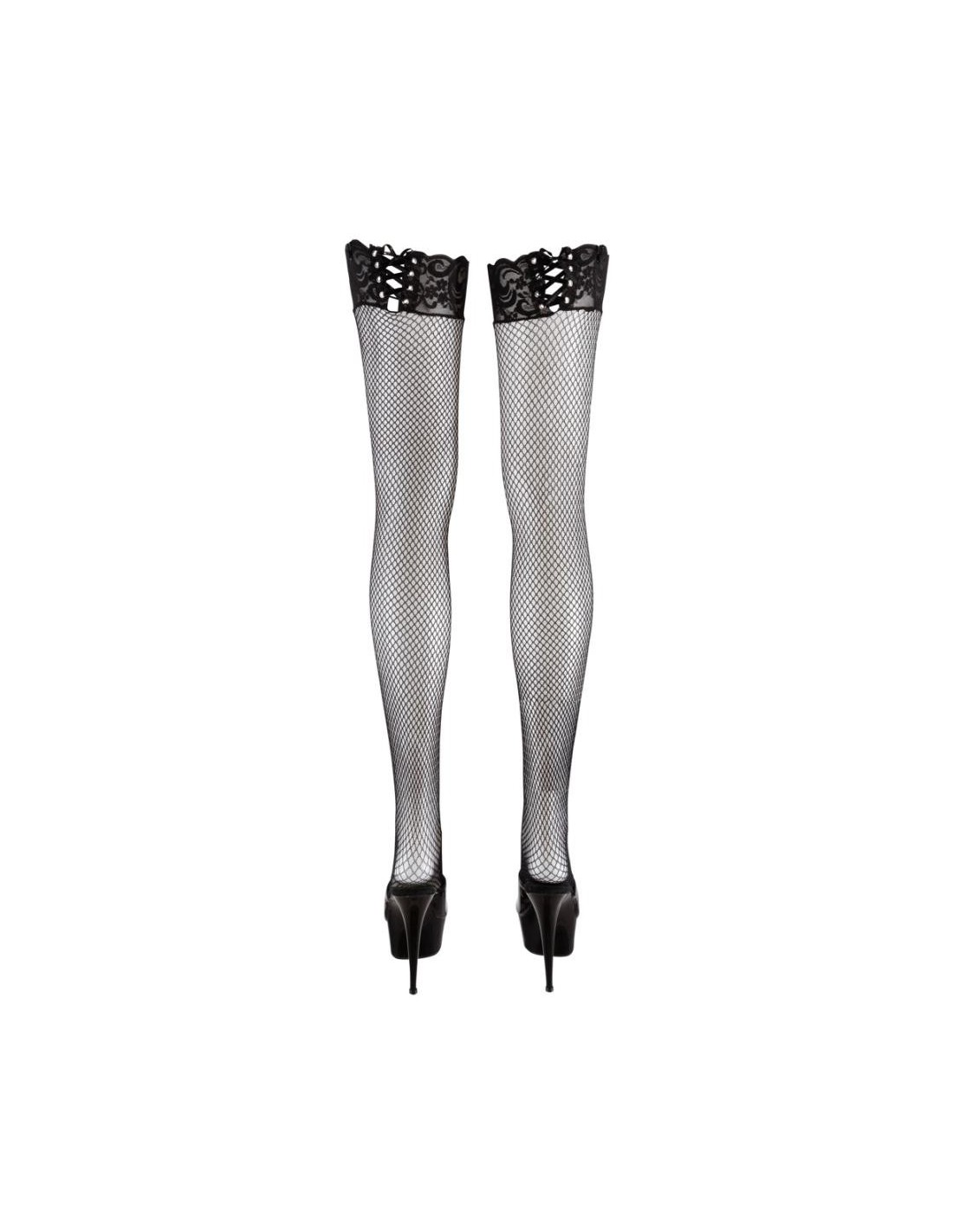 Calze a rete nere con parte superiore in pizzo di circa 12 cm di larghezza in nero/argento da agganciare a un reggicalze (non incluso). Sul retro con cucitura seducente.