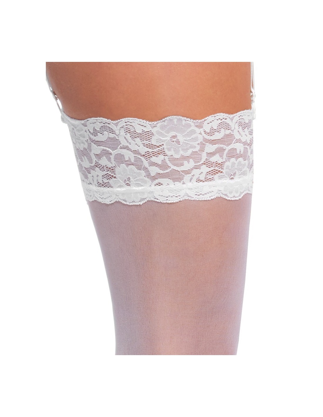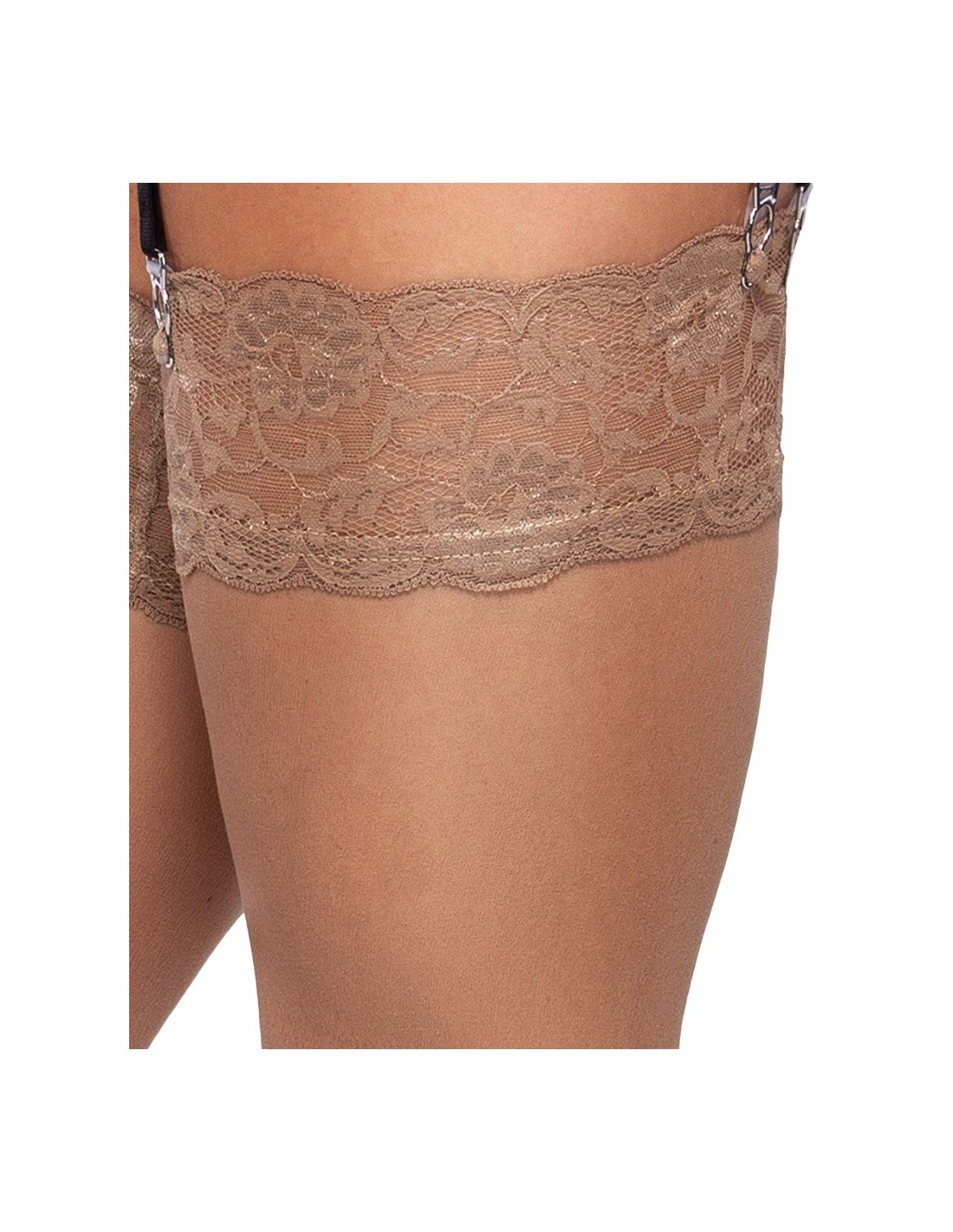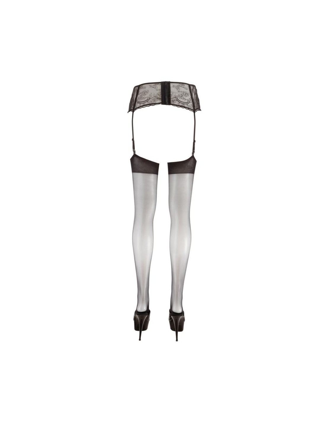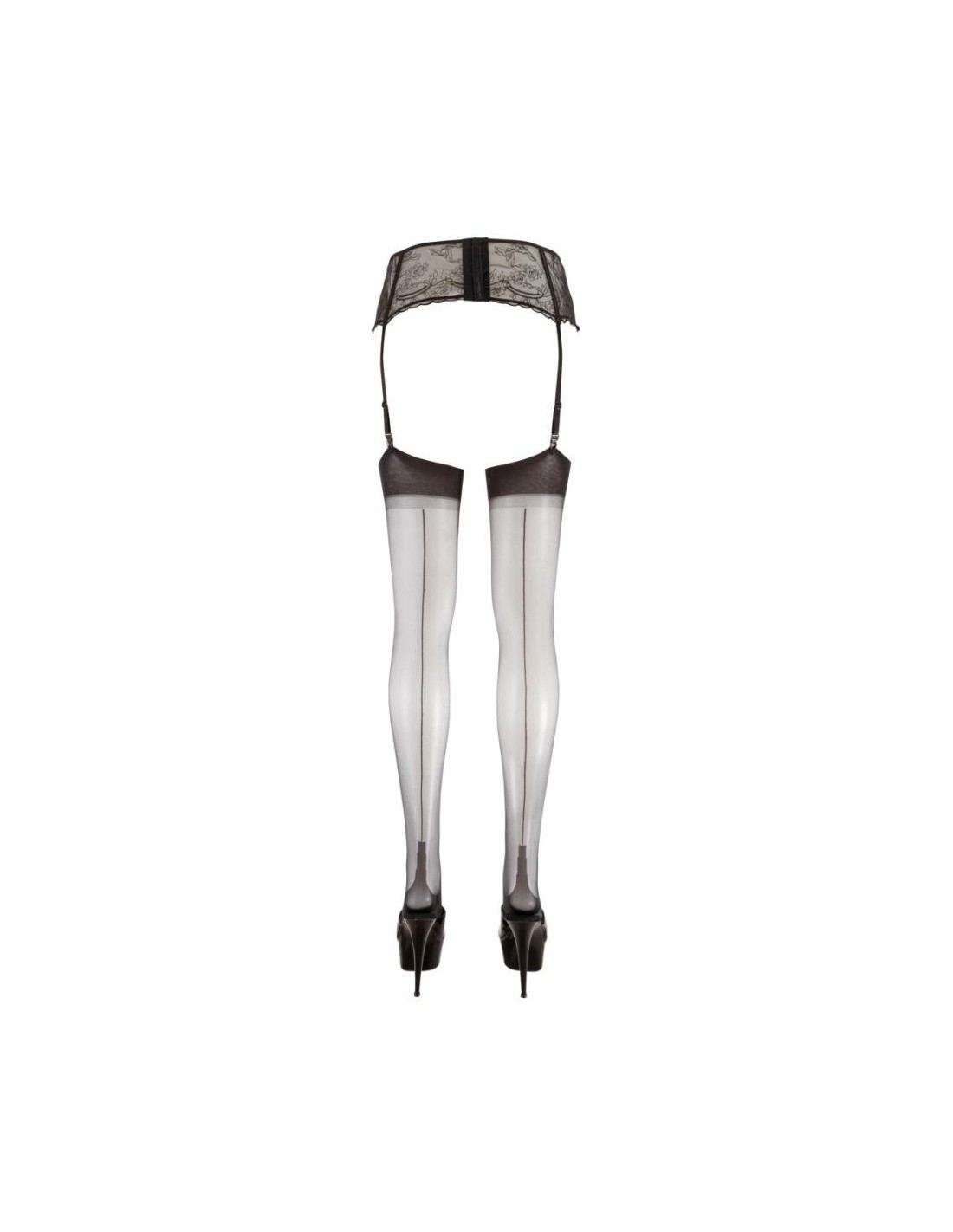 Calze a rete nere con parte superiore in pizzo di circa 12 cm di larghezza in nero/argento da agganciare a un reggicalze (non incluso). Sul retro con cucitura seducente.