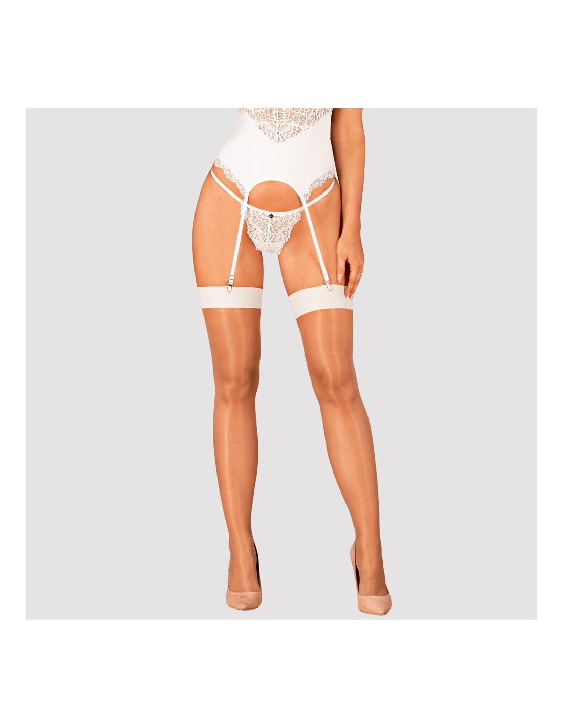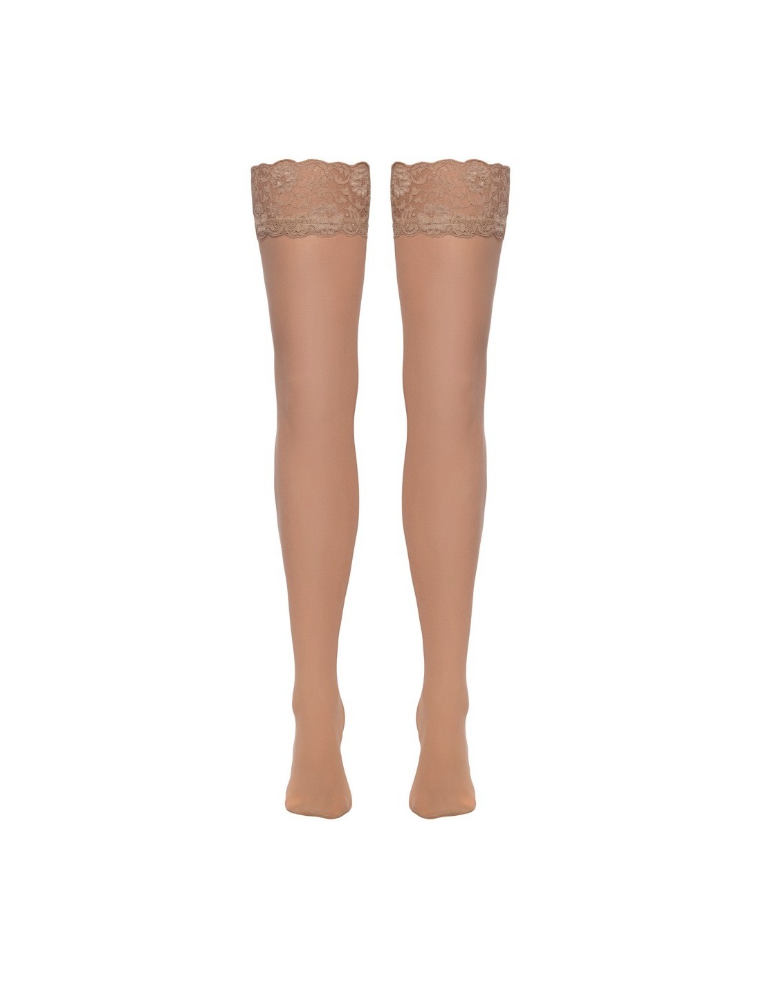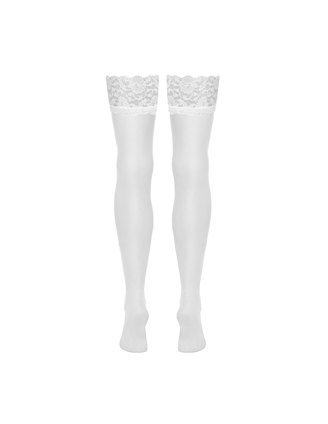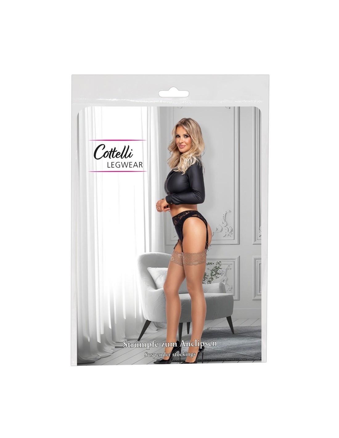 Calze a rete nere con parte superiore in pizzo di circa 12 cm di larghezza in nero/argento da agganciare a un reggicalze (non incluso). Sul retro con cucitura seducente.