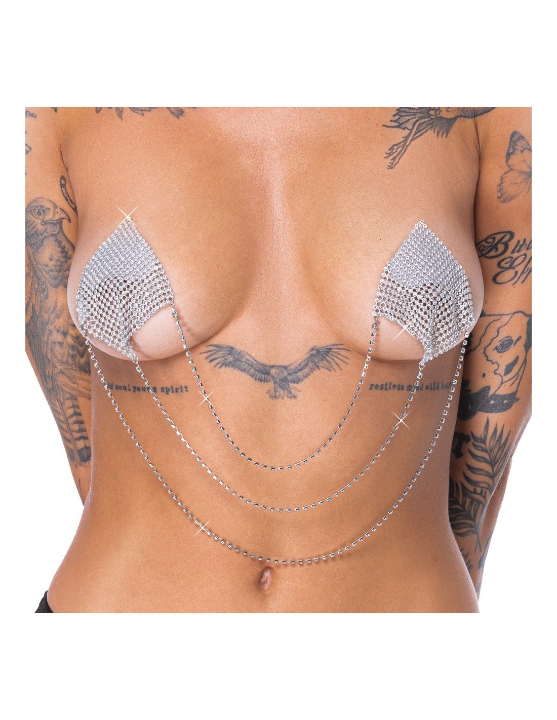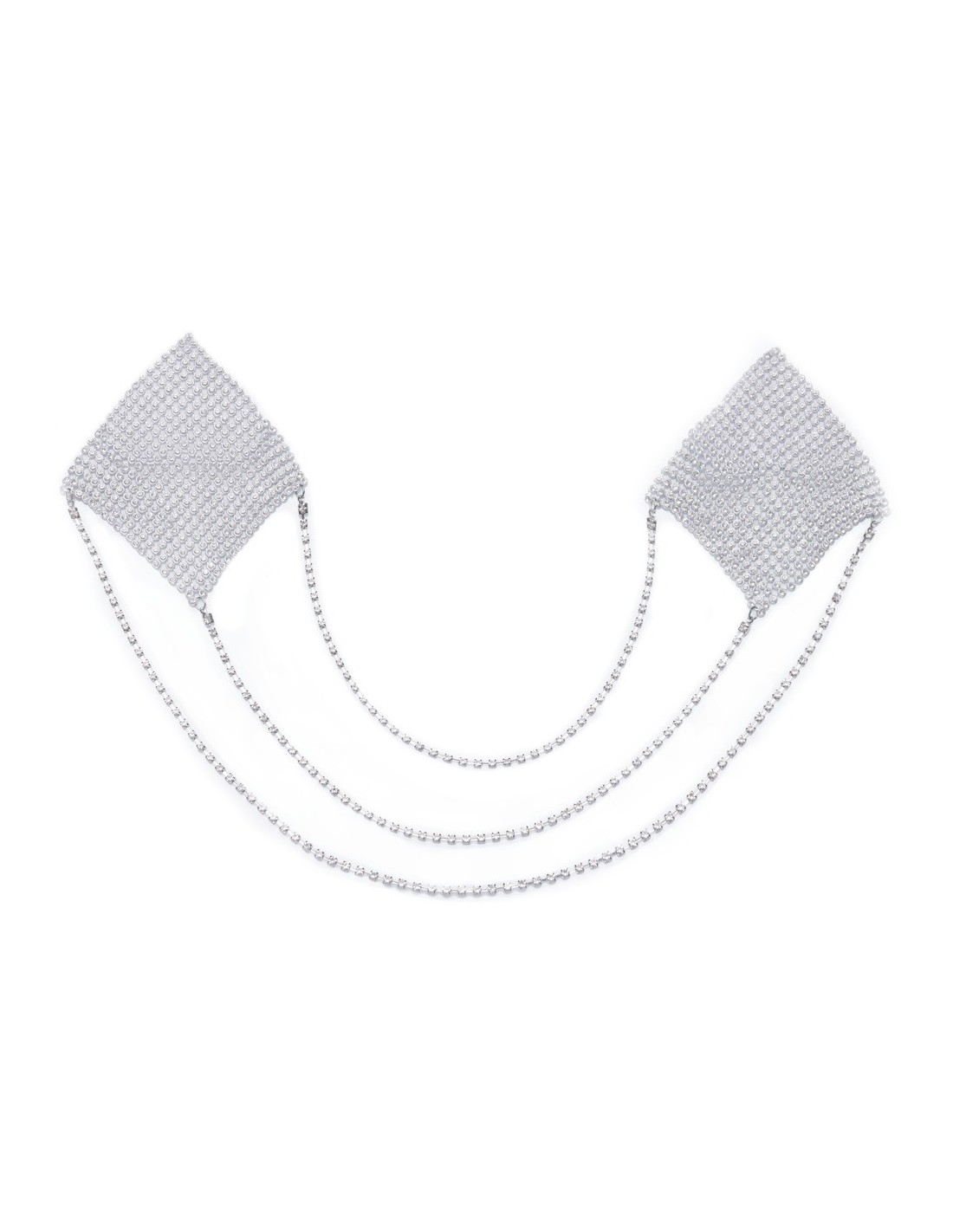 Gli adesivi per capezzoli quadrati color argento di Cottelli ACCESSOIRES sono diamanti scintillanti con tre sottili catene di collegamento oscillanti. Adesivi per capezzoli da attaccare - possono essere utilizzati più volte se la pellicola protettiva viene riapplicata per la conservazione.
