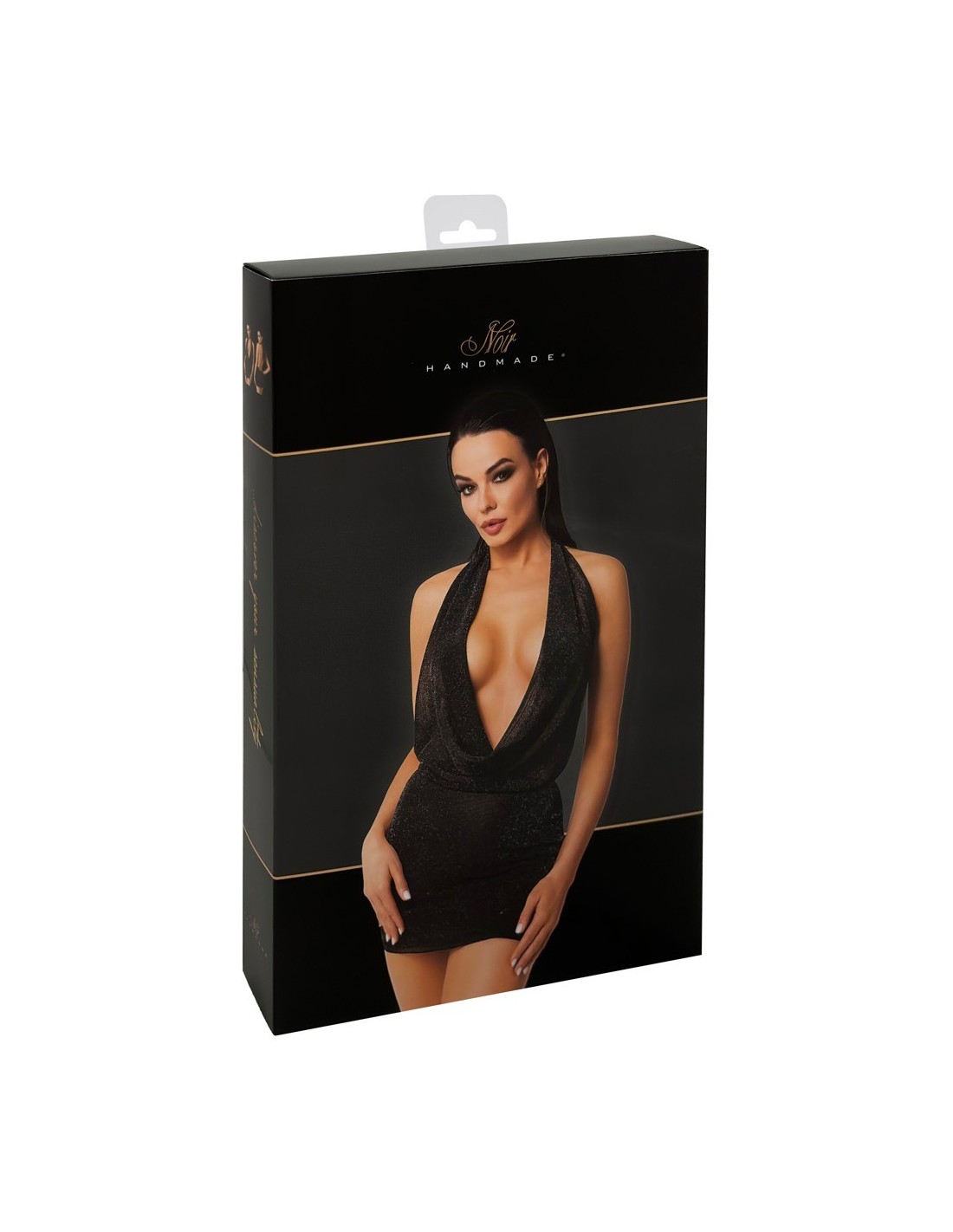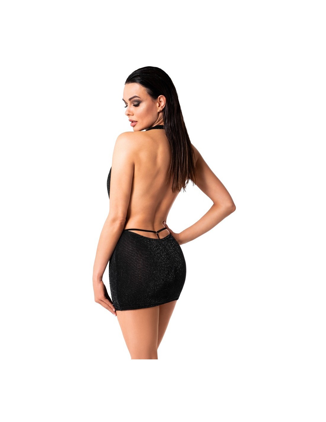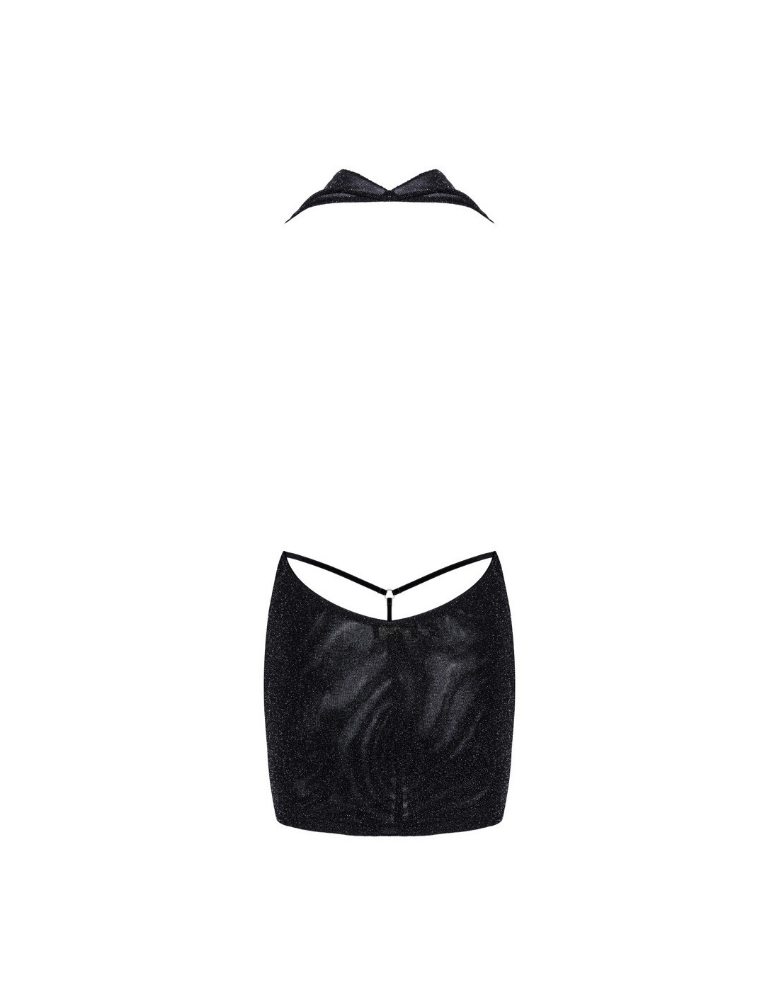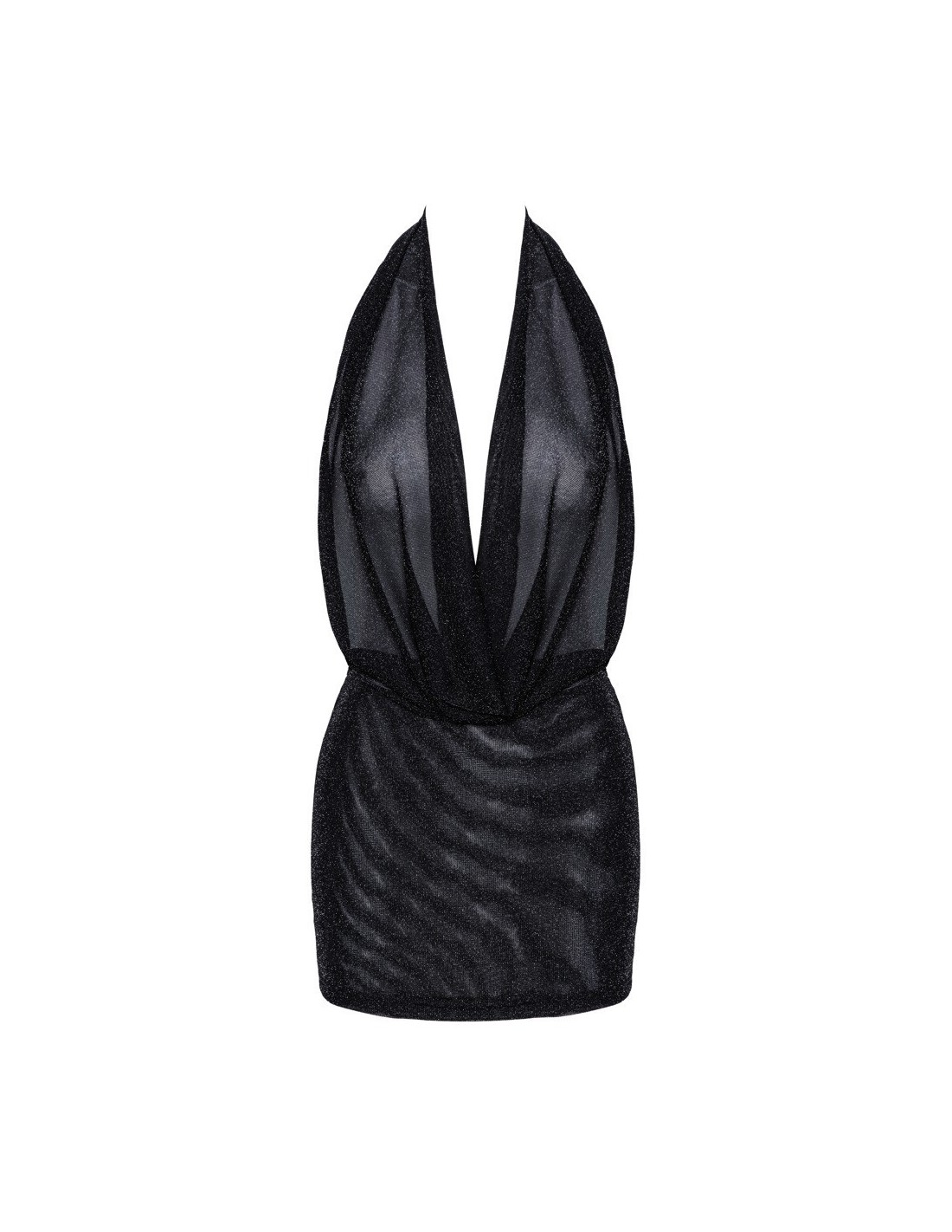 Mini abito Orgia Luminara di Noir con scollo a cascata mozzafiato. Schiena aperta con strette spalline decorative per una vestibilità sicura. In nero semitrasparente con un sottile luccichio argentato. Elasticizzato e morbido al tatto per il massimo comfort e facilità di movimento.