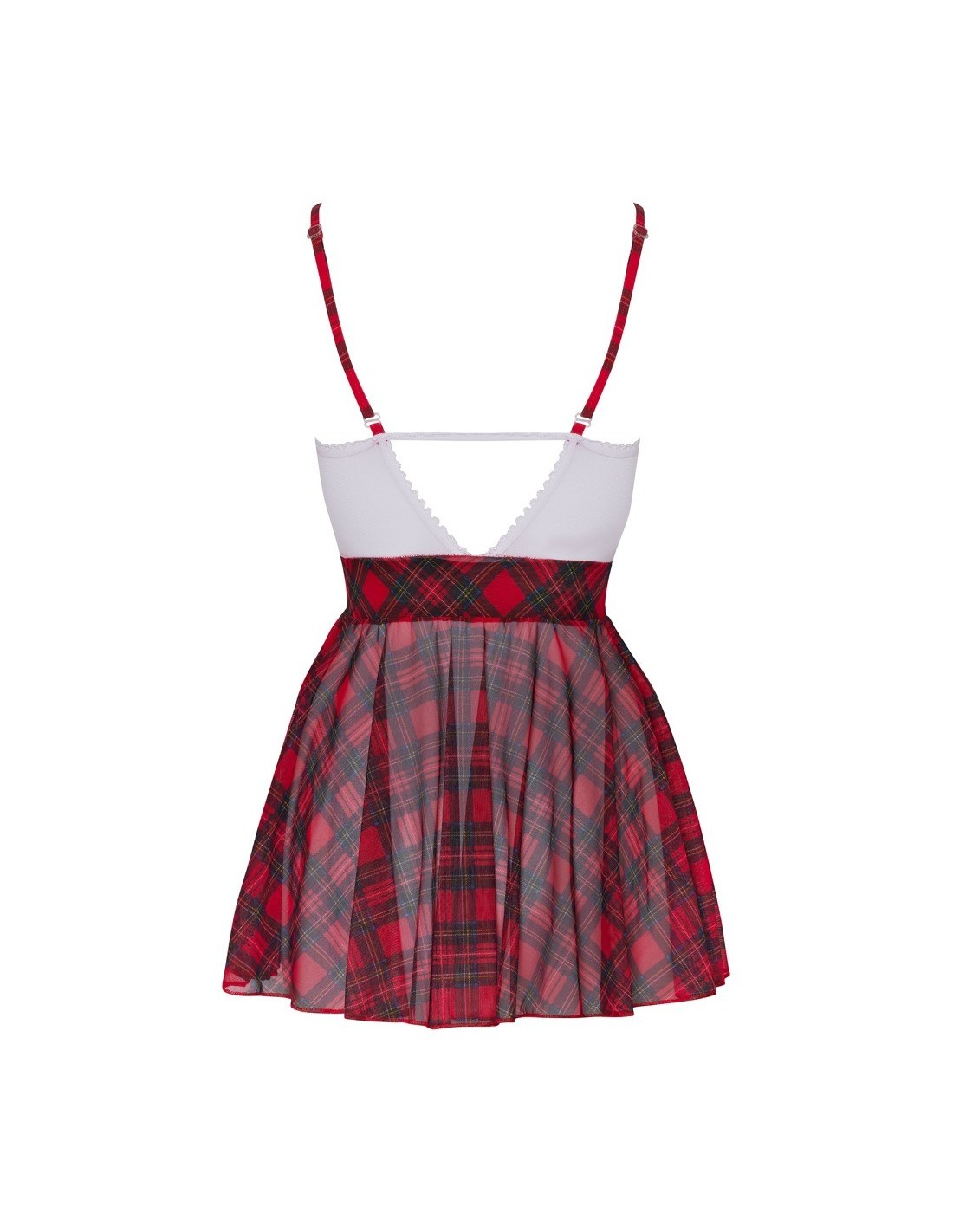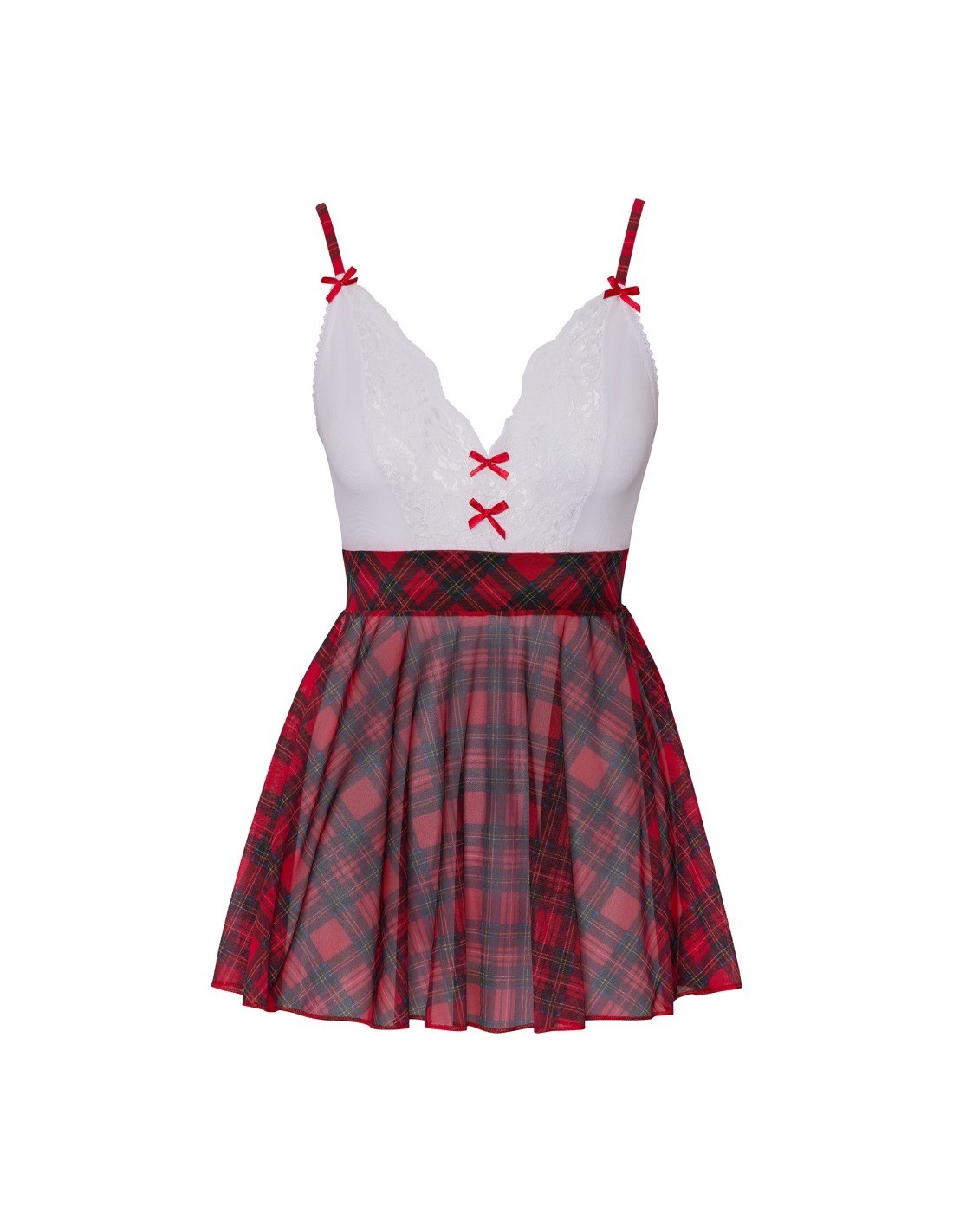 Schoolgirl uniform from Cottelli COSTUMES consisting of a short strap dress and a collar. Playful white top made of powernet and delicate lace, charmingly decorated with red bows. The plaid straps are adjustable to fit. The flared chequered skirt is also made of powernet. The plaid necklace seduces with a glittering rhinestone heart pendant at the front and has an adjustable hook-and-loop fastener at the back of the neck.
