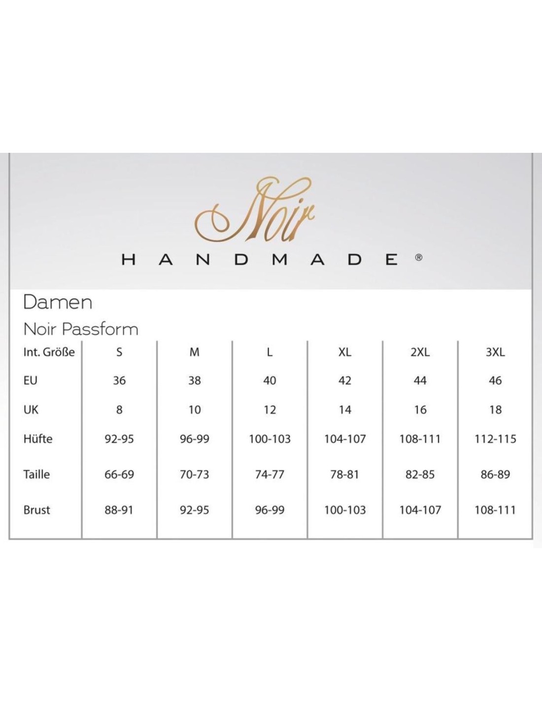 Attenzione, il Noir ha una tabella delle dimensioni a parte!