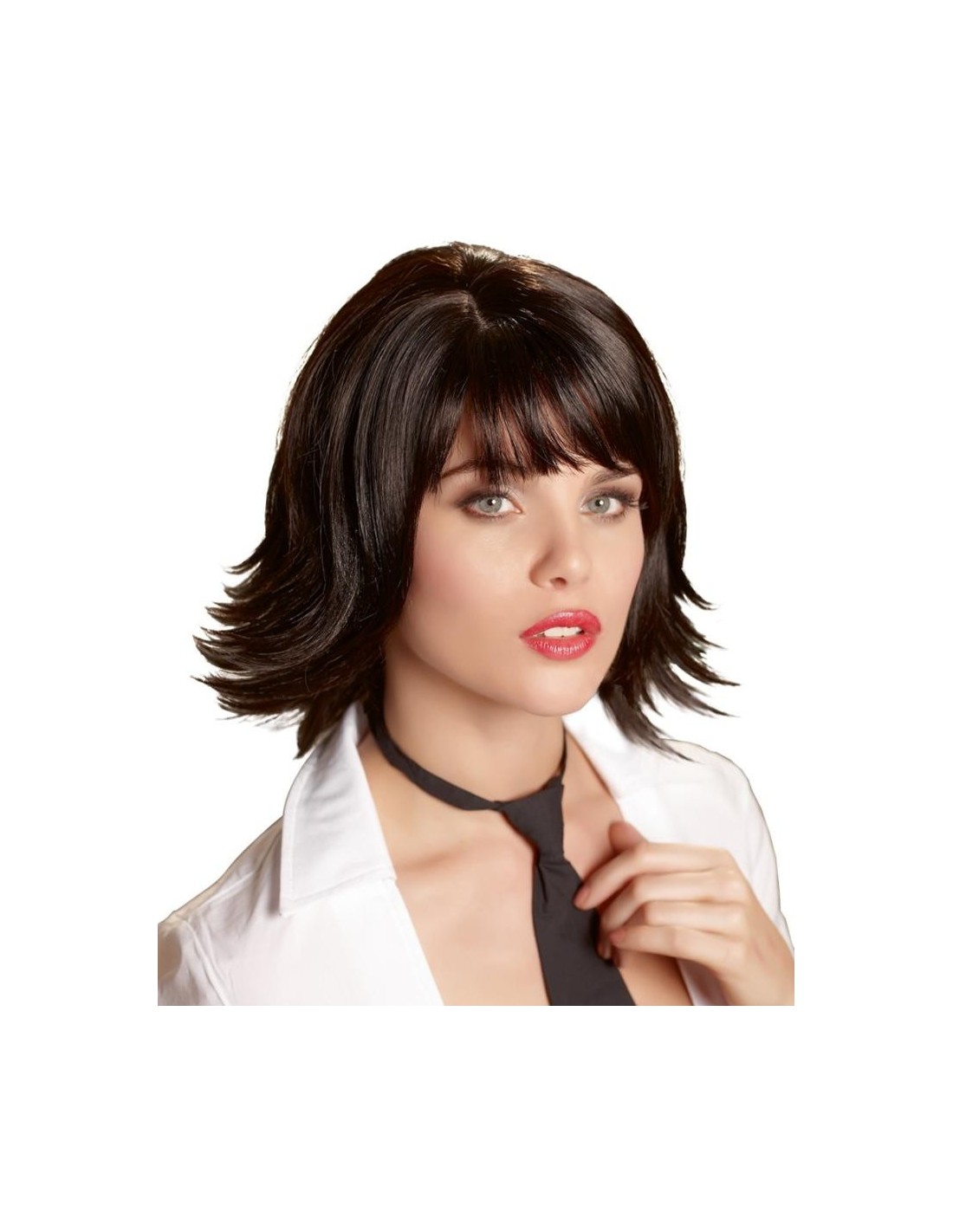 Parrucca con capelli artificiali accuratamente lavorati, facile da lavare con acqua e shampo (possibilmente con uno shampo speciale per parrucche). Capelli altezza spalla neri con taglio sfrangiato alla moda. Ca. 30 cm di lunghezza. Materiale: 60% kanekalon, 40% toyokalon. Avvertenza: non adatta per arricciacapelli e piastra.