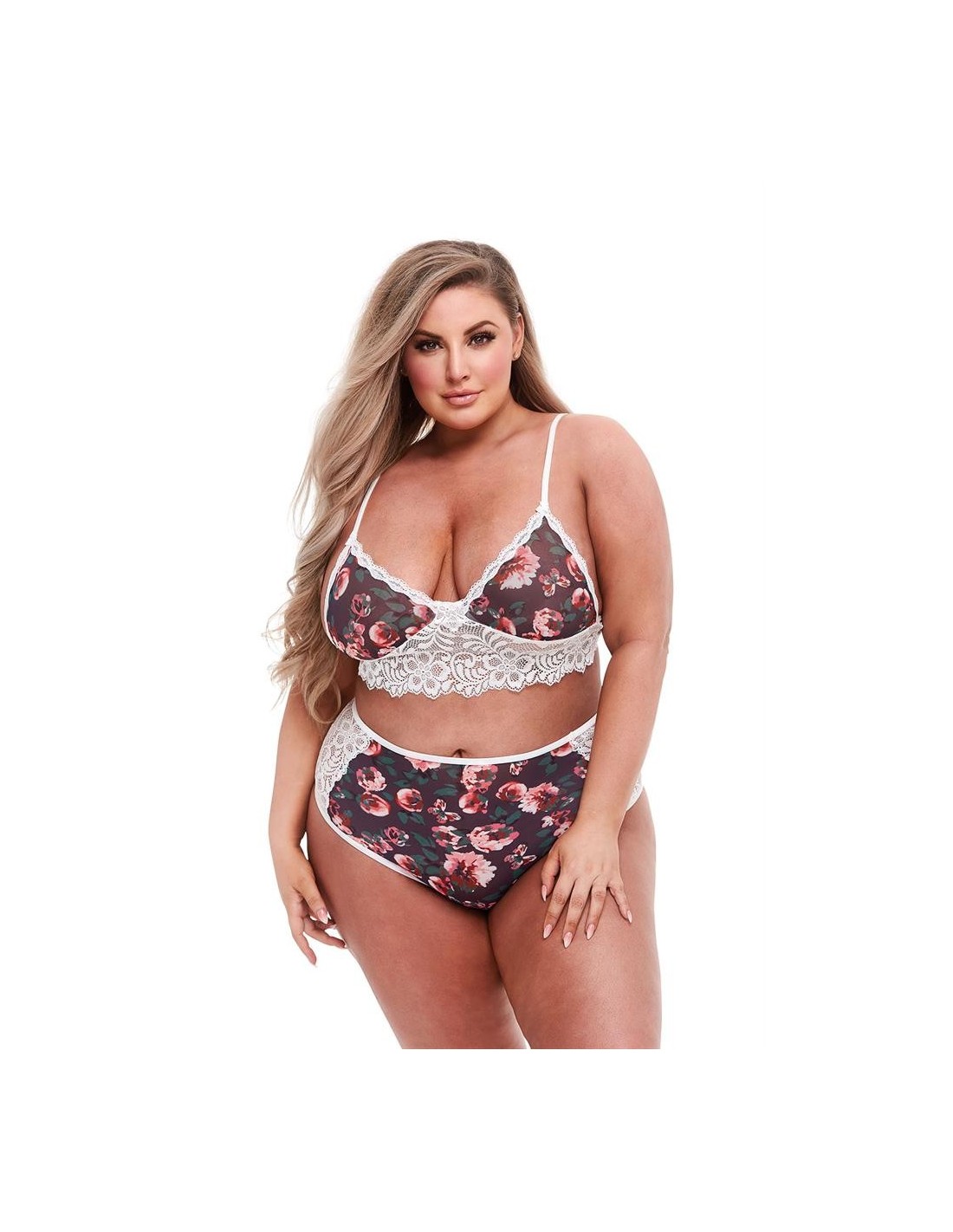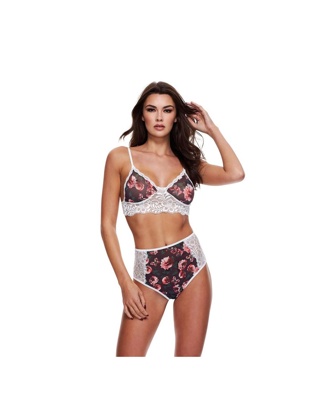 Femininity becomes even sexier with this new two-piece by Baci. Designed in a dark floral and contrasting white lace, the bra features a strappy design, with delicately designed lace and strappy cups, while the matching fl oral and lace panty features a playful surprise — an open and strappy back!