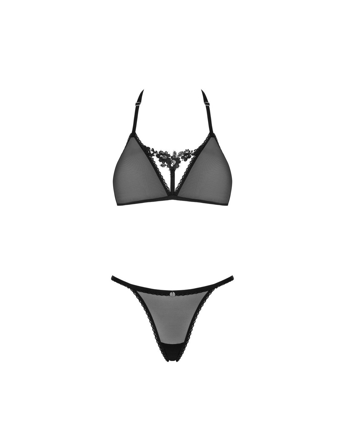 Set nero trasparente Celia Noir di Obsessive con reggiseno e perizoma morbidi. Morbida rete elastica fine con elevato comfort di vestibilità. Con pizzo guipure floreale di alta qualità tra le coppe e sul sedere. Il reggiseno è regolabile sul collo e sulla schiena.