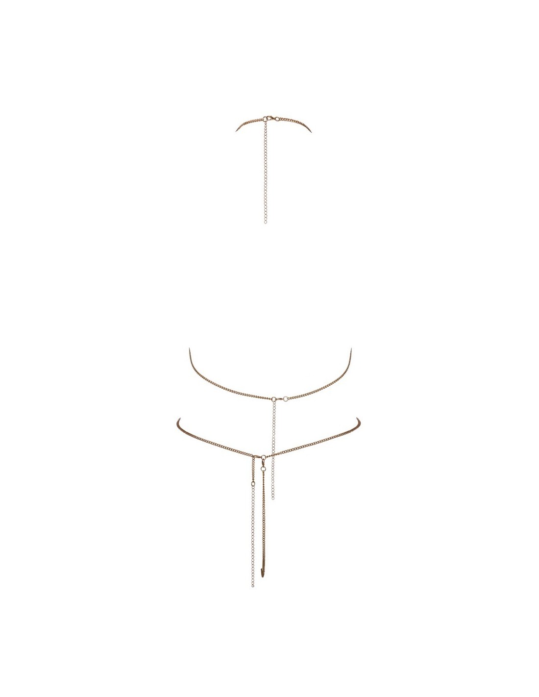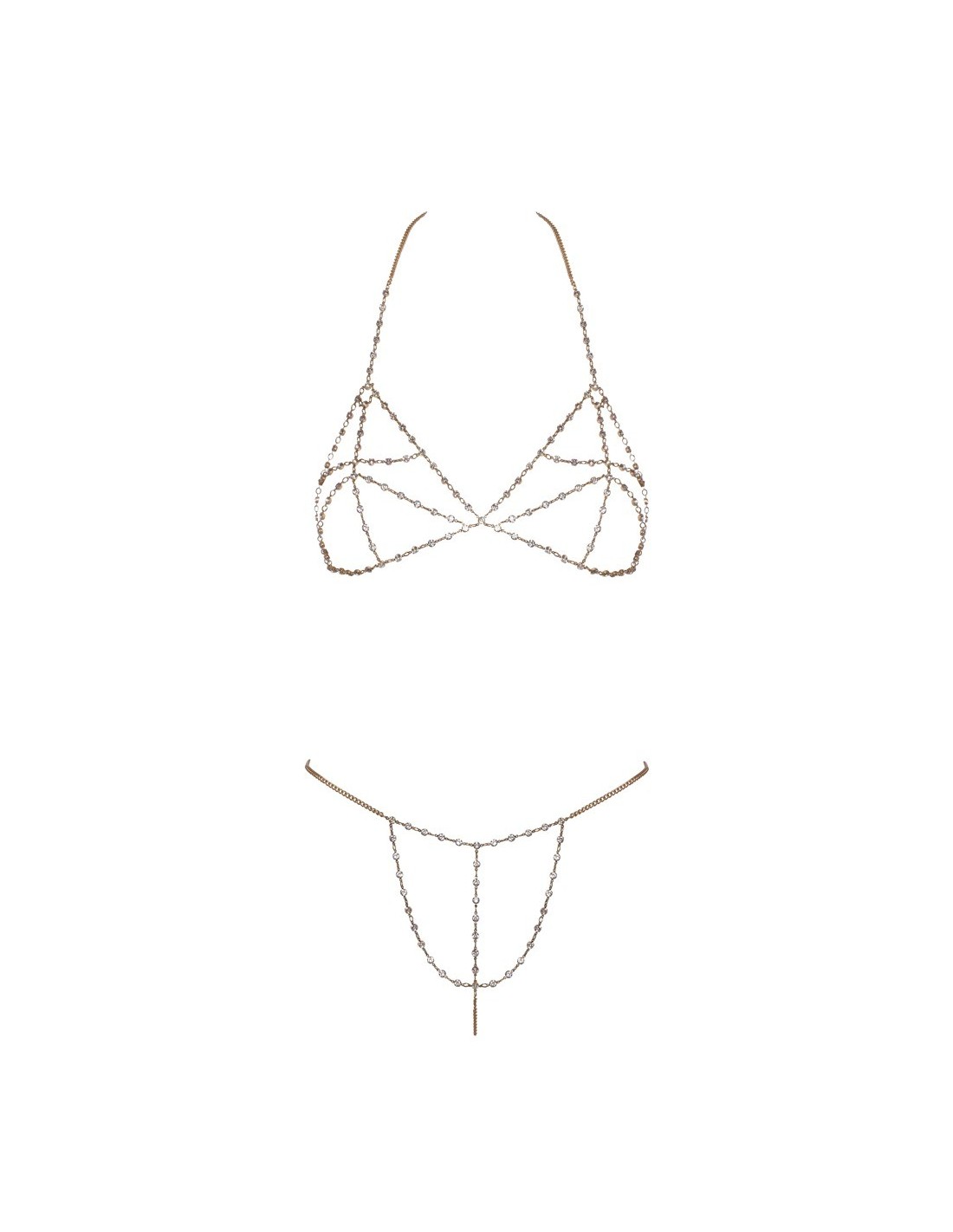 Bikini a catena color oro di Cottelli ACCESSOIRES con reggiseno e string. Catene di strass scintillanti sul seno e sulla zona pubica. Catena stimolante all'inguine fino a sopra il sedere. La catena al collo, la catena sulla schiena e la catena con stringhe possono essere regolate e personalizzate individualmente con chiusure a moschettone. Indossato da solo come lingerie per un look erotico o abbinato con stile a costumi da bagno e abiti aderenti, il bikini a catena glamour è sempre un eccitante richiamo per gli occhi!