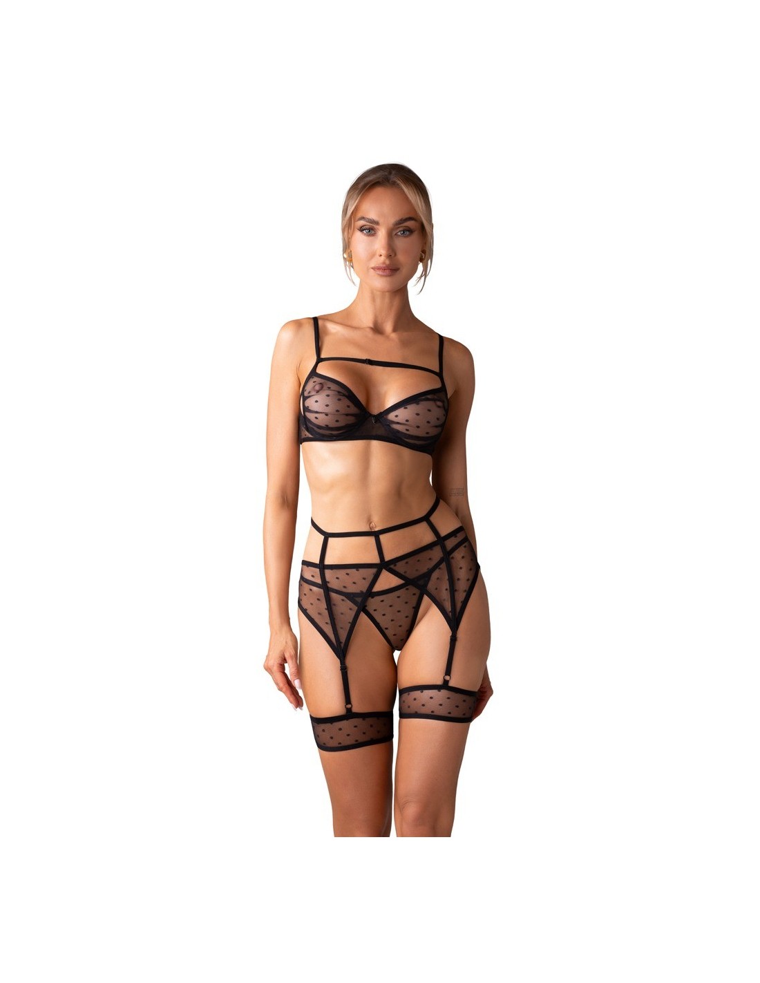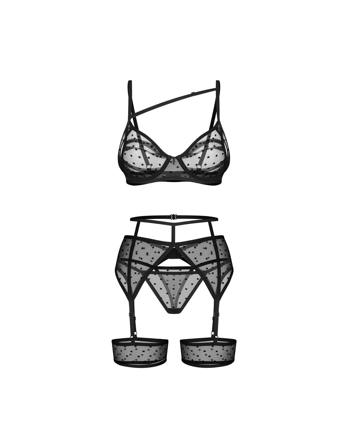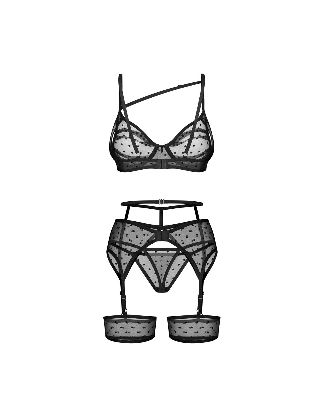 set 3 pezzi Nuites by Obsessive con reggiseno, reggicalze con giarrettiera e perizoma. Stile seducente in elegante trasparenza nera con eleganti pois e dettagli alla moda sulle spalline. Morbido ed elasticizzato su tutta la superficie per un elevato livello di comfort. Reggiseno con spallina regolabile e sottile dettaglio gioiello tra le coppe morbide. Le spalline e la chiusura a gancetto sulla schiena possono essere regolate in base alle esigenze. Reggicalze con chiusura a gancio sul retro. Le bretelle con reggicalze elasticizzato sono regolabili in lunghezza.