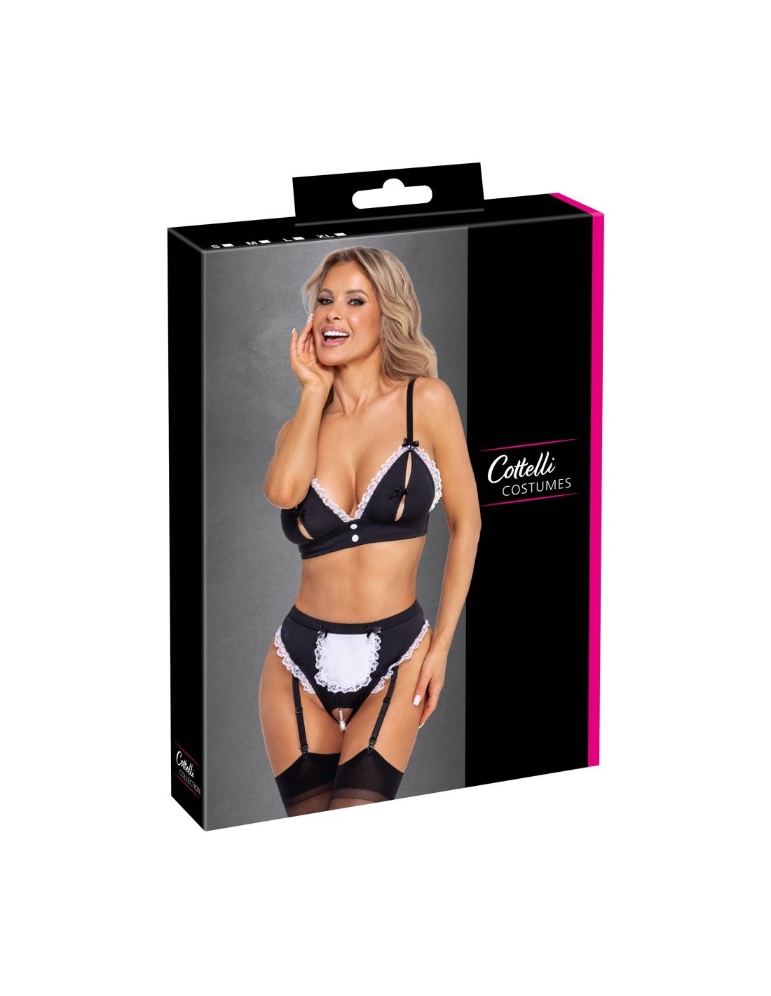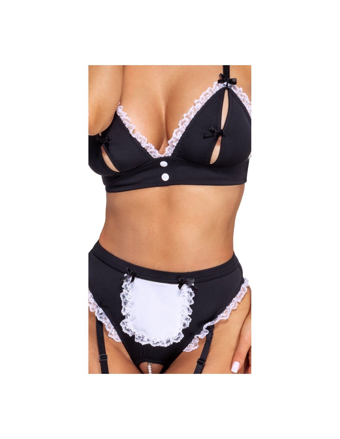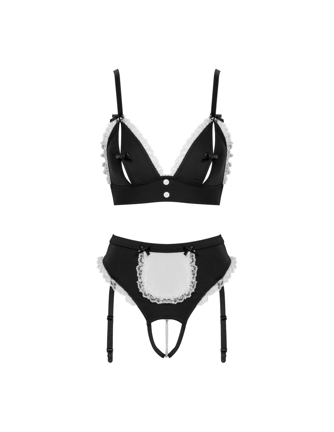 set da portata 2 pezzi di Cottelli COSTUMES in un seducente look overt con bustier e reggicalze. Il tutto in nero con dettagli a balze bianche e fiocchi decorativi neri. Bustier con bottoncini tra le coppe a fessura, ciascuna tenuta insieme da un piccolo fiocco decorativo. Le spalline sono regolabili. Reggicalze con piccolo grembiule sul davanti e collana di perle stimolante nel cavallo aperto. Le 4 bretelle sono regolabili e completamente rimovibili.