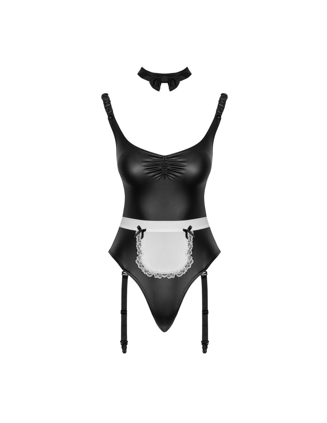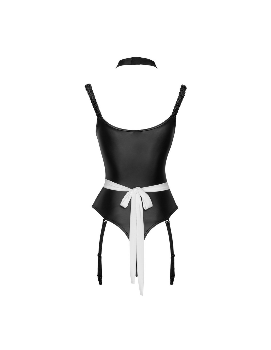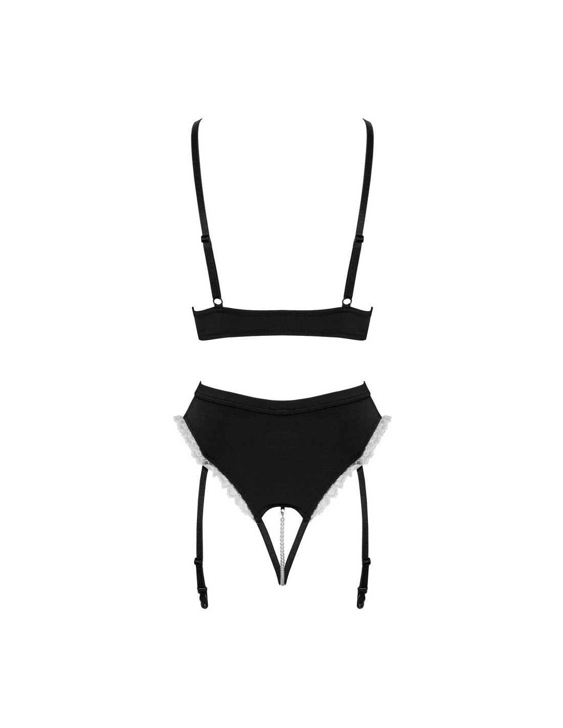 set da portata 2 pezzi di Cottelli COSTUMES in un seducente look overt con bustier e reggicalze. Il tutto in nero con dettagli a balze bianche e fiocchi decorativi neri. Bustier con bottoncini tra le coppe a fessura, ciascuna tenuta insieme da un piccolo fiocco decorativo. Le spalline sono regolabili. Reggicalze con piccolo grembiule sul davanti e collana di perle stimolante nel cavallo aperto. Le 4 bretelle sono regolabili e completamente rimovibili.