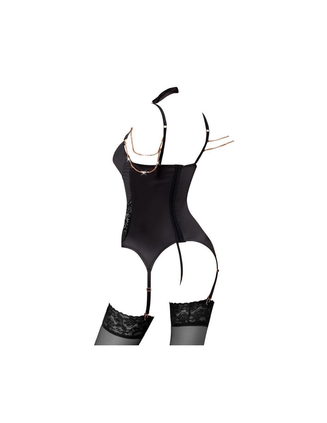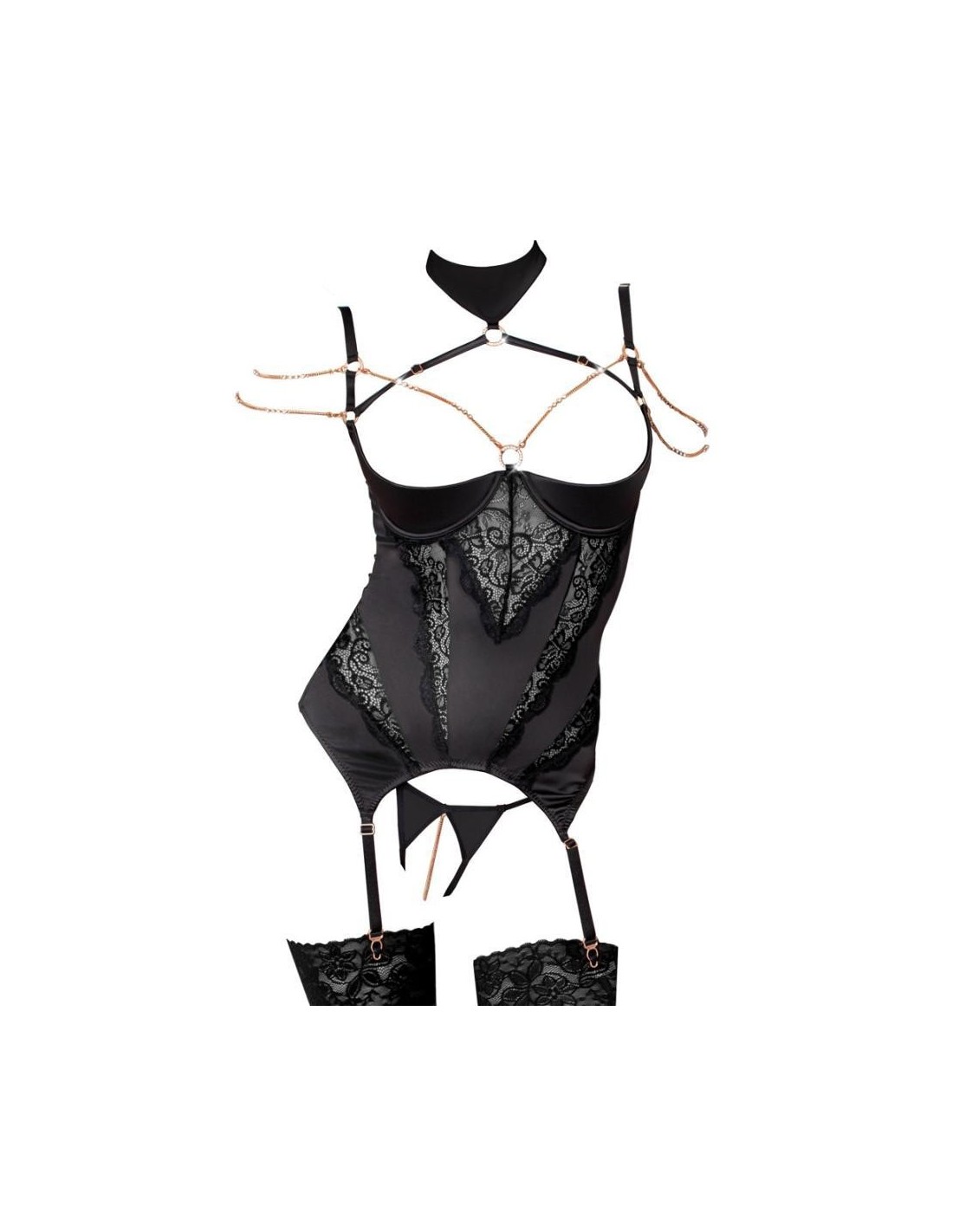 Sensazionale chemise con reggicalze di Abierta Fina in raso elastico, con inserti di pizzo che guidano la silhouette sul davanti e guarniti con elementi di gioielleria color oro rosa. Il ferretto incorporato con coppe leggermente imbottite mette il busto in ottima forma e direttamente sotto i riflettori. Le due spalline regolabili del décolleté che portano dalle spalline regolabili al collare con chiusura in velcro sono sofisticate. Le catene decorative con strass sul petto e sulle spalle sono dotate di piccoli moschettoni e sono quindi rimovibili. Nella parte posteriore con chiusura a gancio. Le giarrettiere sono regolabili in lunghezza. Il piccolo perizoma ouvert in raso elastico con la catena staccabile nel cavallo aperto è incluso.