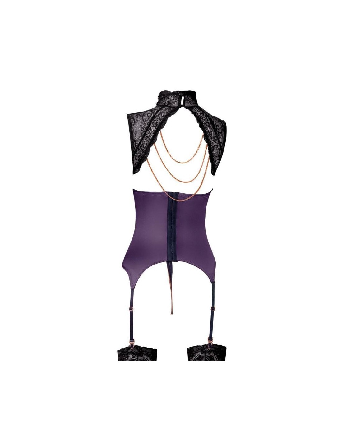 Chemise con busto e reggicalze senza schiena di Abierta Fina in raso viola elastico con fini inserti in pizzo nero e colletto in pizzo con chiusura a 2 bottoni. Scollo davanti decorato con 3 catene. Il busto libero e la schiena sono anche decorati con catene color oro rosa, tutte rimovibili grazie a piccoli moschettoni. Sul retro, la chemise con bretelle ha una chiusura a gancio. Le reggicalze sono regolabili in lunghezza. Il perizoma abbinato ha un invitante cavallo aperto con una stimolante catena al cavallo che è anche rimovibile.