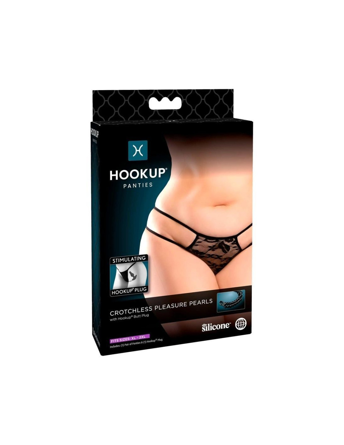 Crotchless Pleasure Pearls di HookUp Panties è un perizoma senza fondo con doppia catena di perle nel cavallo e plug anale incluso che si blocca nel/nel perizoma. Il perizoma con doppia banda elastica al cavallo non ha una banda al sedere, ma è tenuto in posizione dal plug inserito con l'anello di tenuta del perizoma. Così ogni movimento del corpo tira e tira delicatamente il plug e stimola la regione anale in modo eccitante - un divertimento molto discreto per le coccole! Inoltre, le due stringhe di perline nel cavallo forniscono una stimolazione eccitante - anche per il pene durante il sesso!