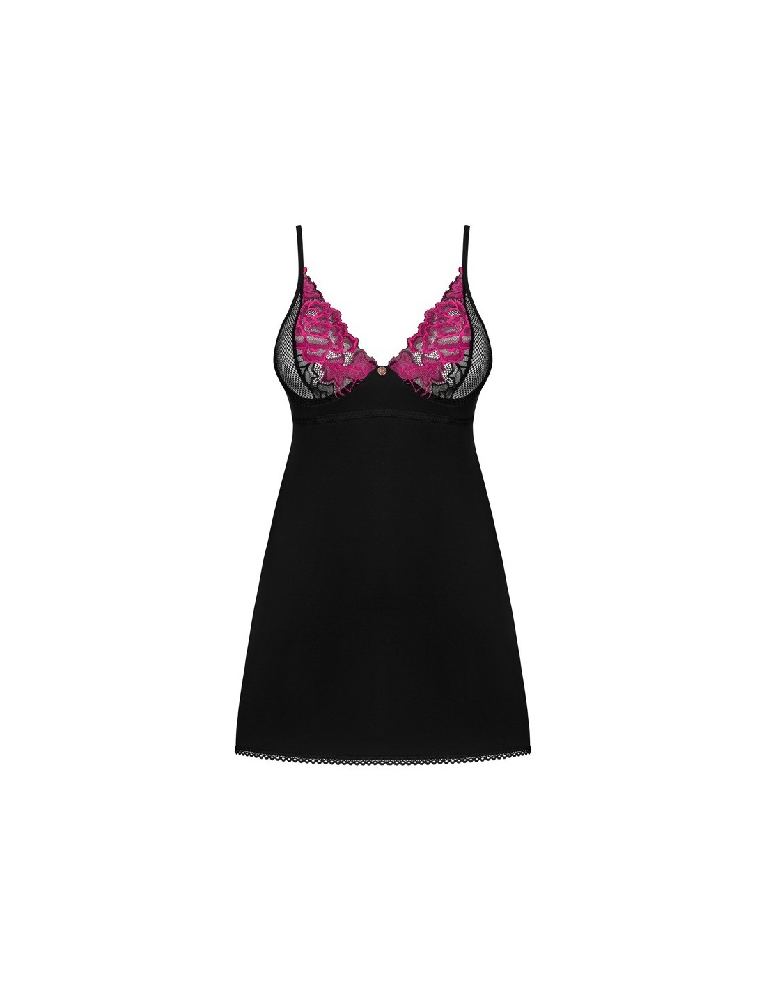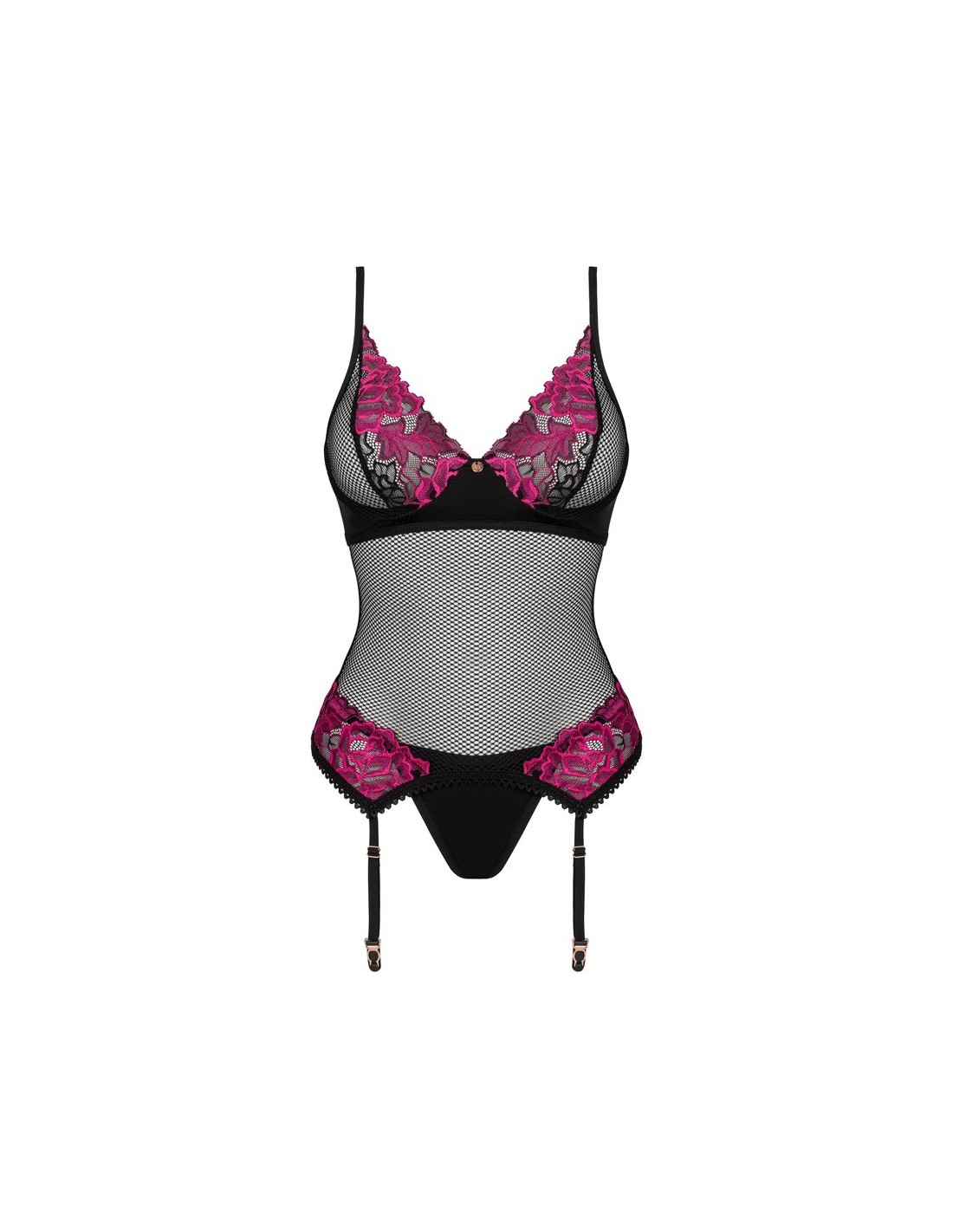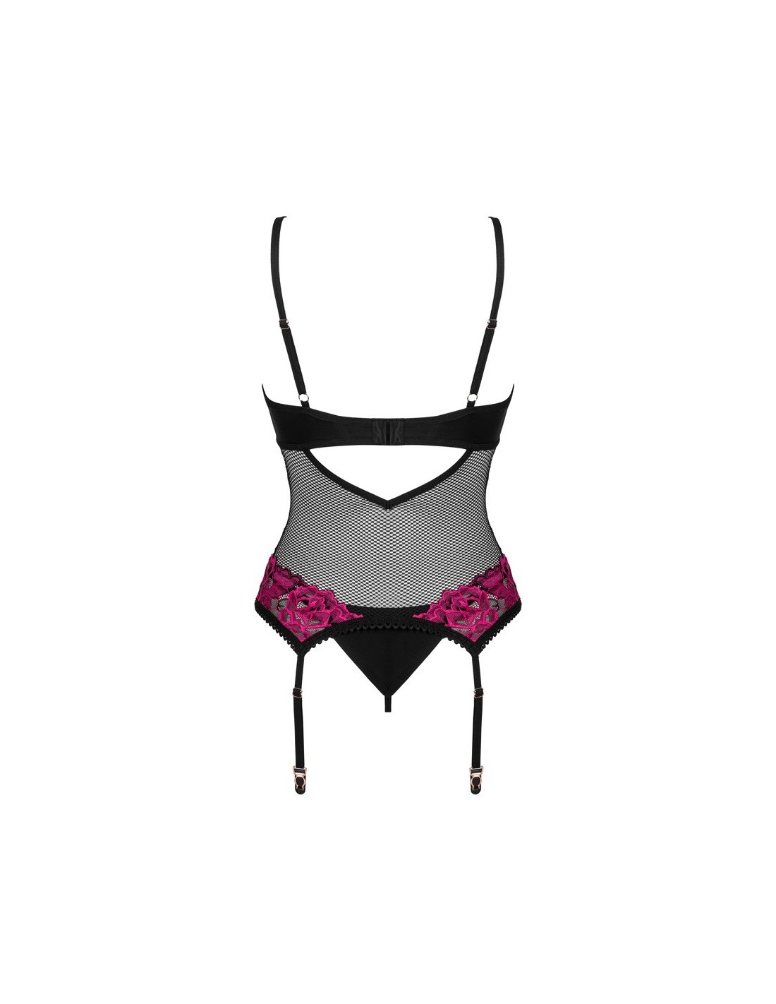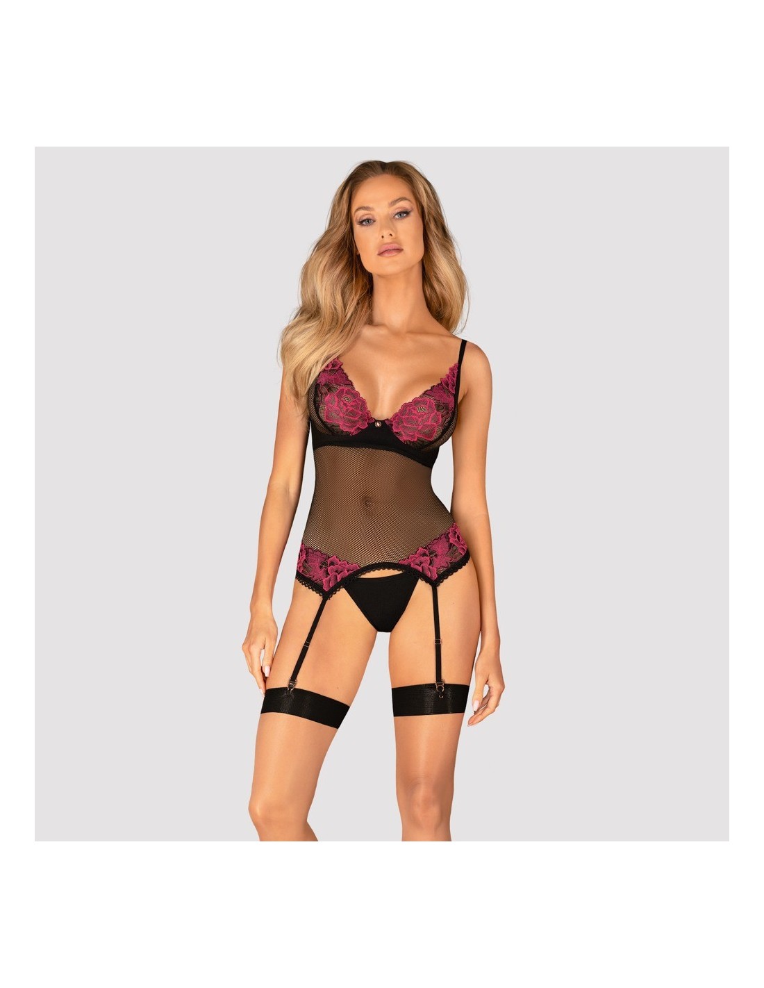La seducente vestaglia Rosenty con perizoma di Obsessive unisce l'eleganza classica a un tocco erotico. Parte del reggiseno con ornamento floreale a forma di rosa e rete fine. Il ferretto fornisce un buon sostegno. La parte posteriore presenta un taglio decorativo che arriva fino ai glutei.