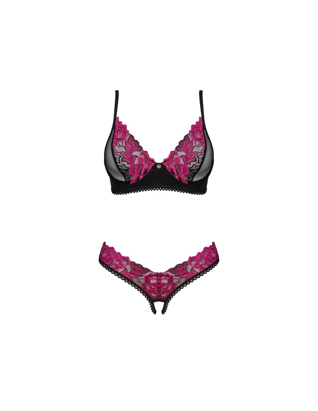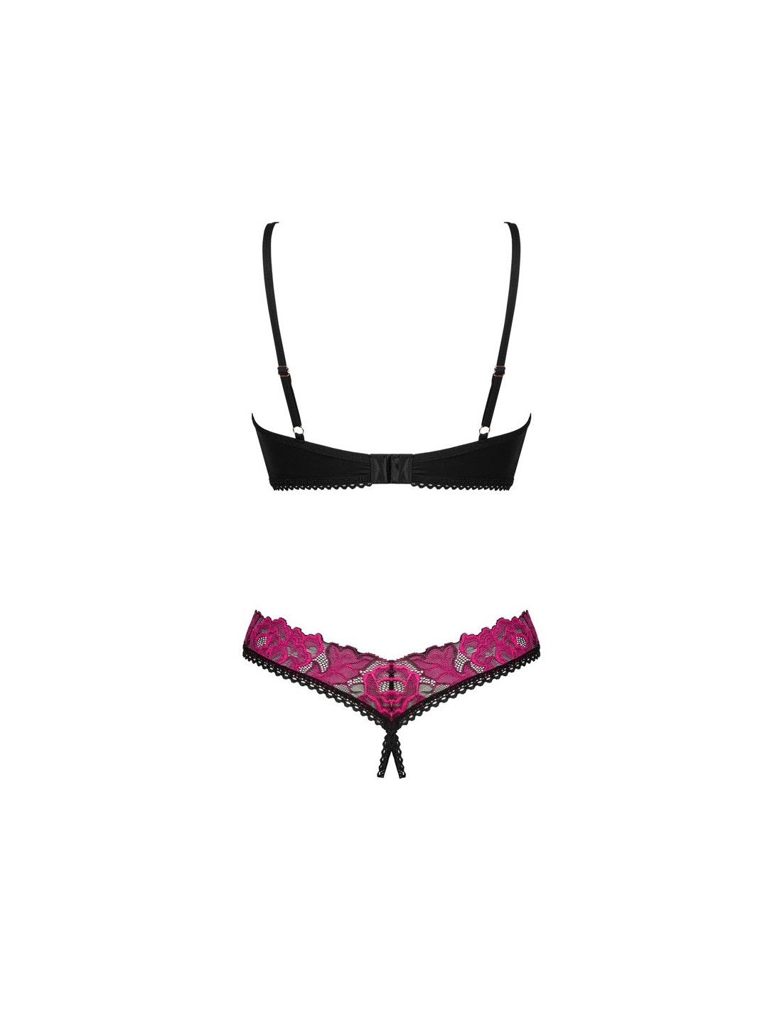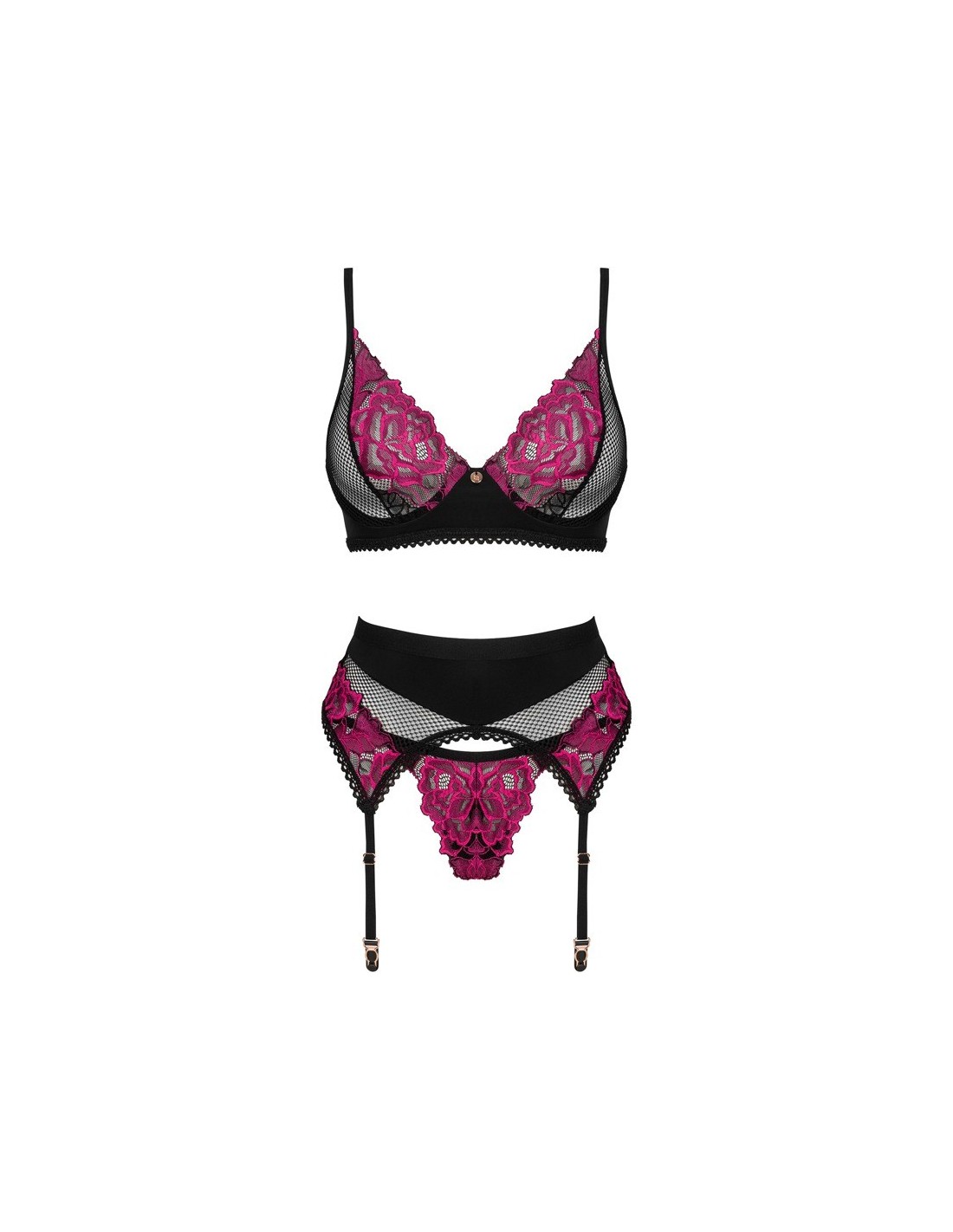 La seducente vestaglia Rosenty con perizoma di Obsessive unisce l'eleganza classica a un tocco erotico. Parte del reggiseno con ornamento floreale a forma di rosa e rete fine. Il ferretto fornisce un buon sostegno. La parte posteriore presenta un taglio decorativo che arriva fino ai glutei.