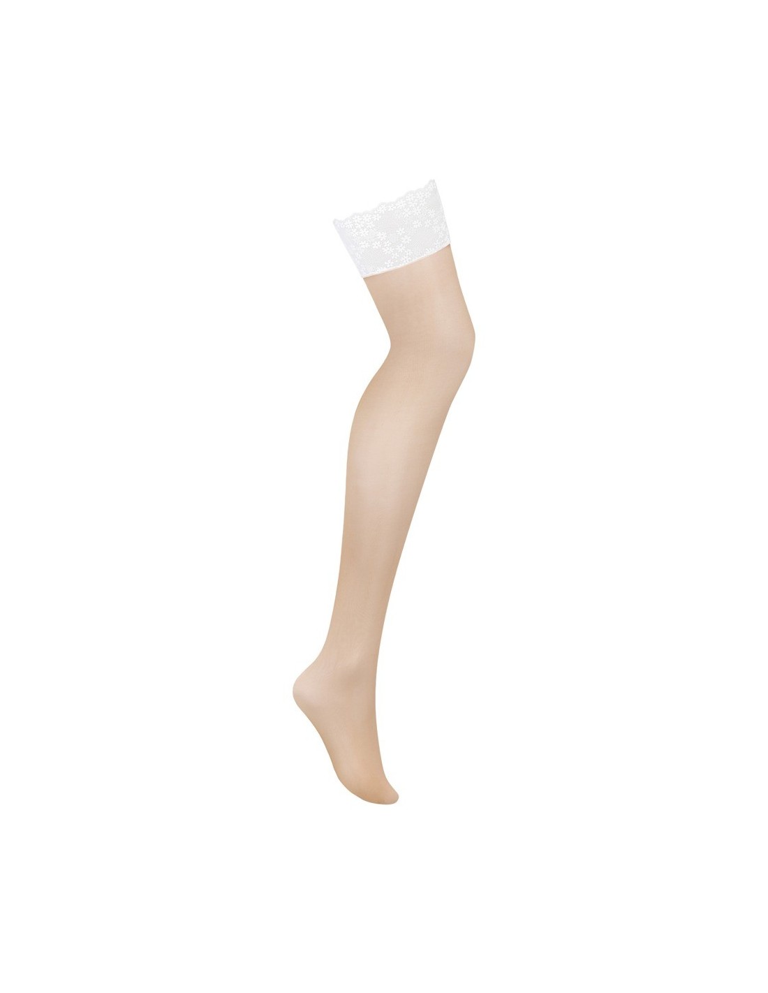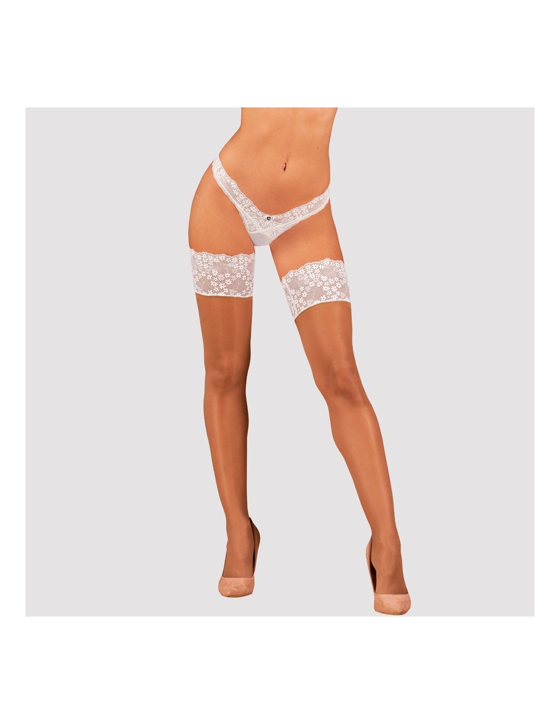 Calze autoreggenti celestiali di Obsessive in setosa trasparenza color nudo. Con un ampio bordo in pizzo floreale bianco, rinforzato con silicone per una vestibilità antiscivolo.