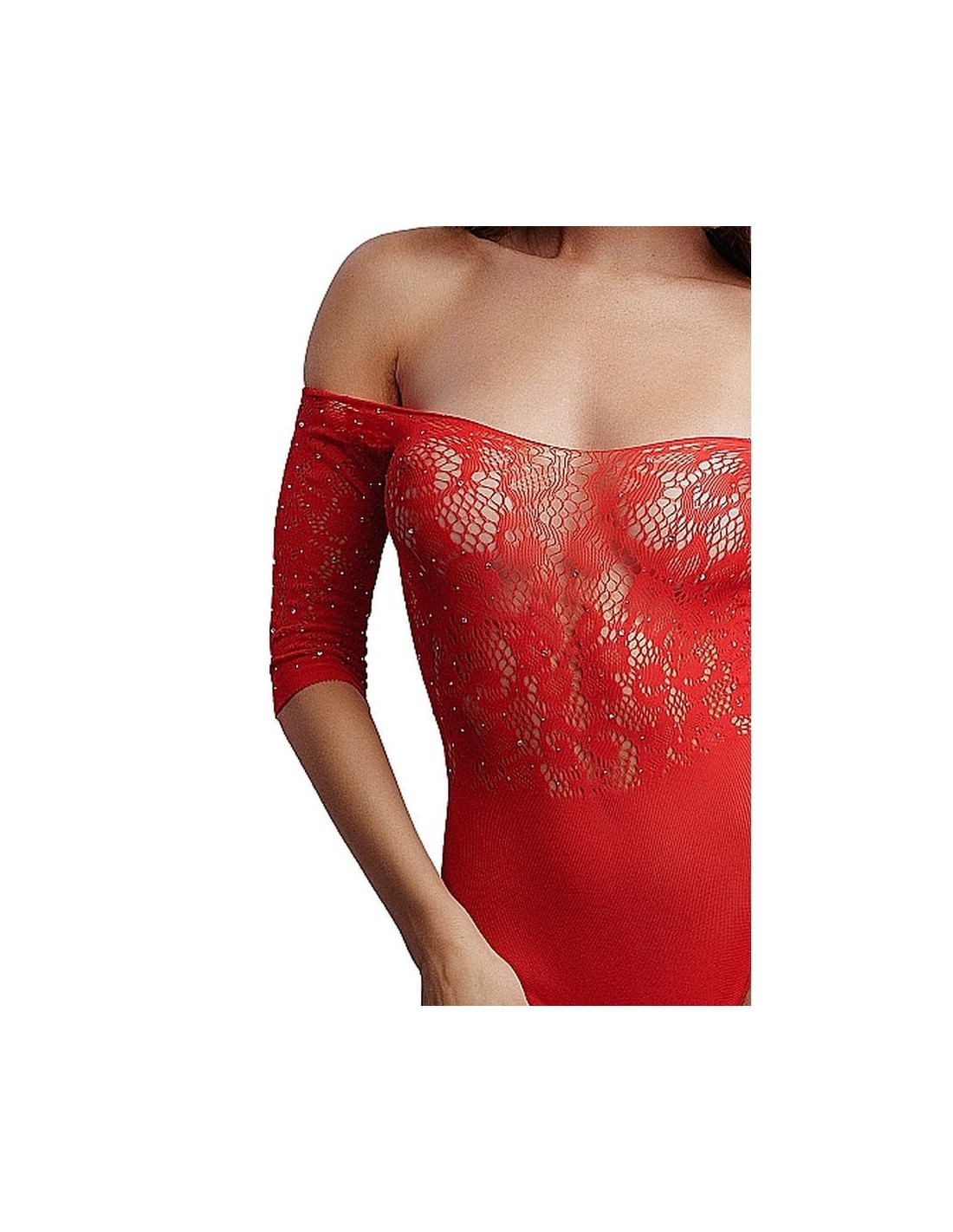 Libera la tua dea del sesso interiore con questo Body Senza Cavallo con sotto opaco e top in pizzo con maniche a 3/4. La parte superiore ha un aspetto lussuoso, grazie agli strass ed è perfetta per un abito destinato a far rimanere a bocca aperta e ad aumentare la temperatura. Perizoma non incluso.