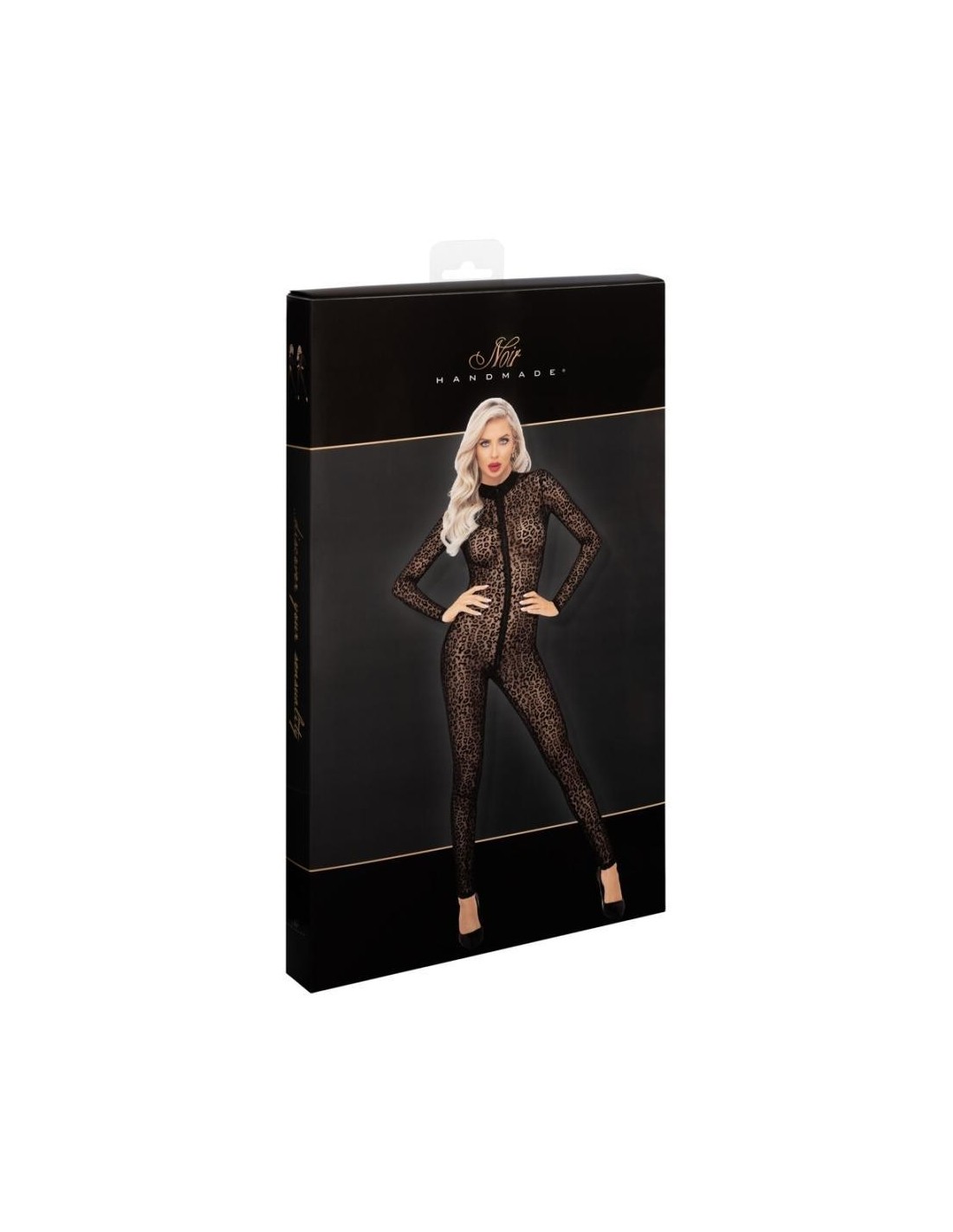 Long-sleeved overall from Noir made entirely of stretchy, soft powernet with fine velvet flock print in leopard look. With erotic 3-way zip that runs from the neck through the crotch to over the bottom.